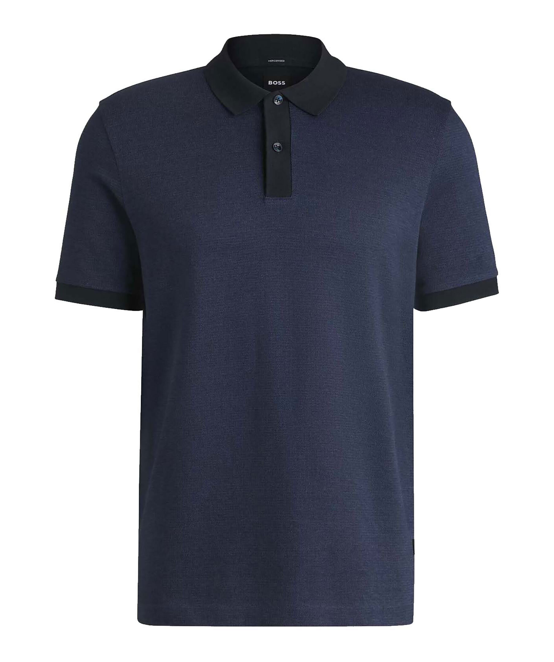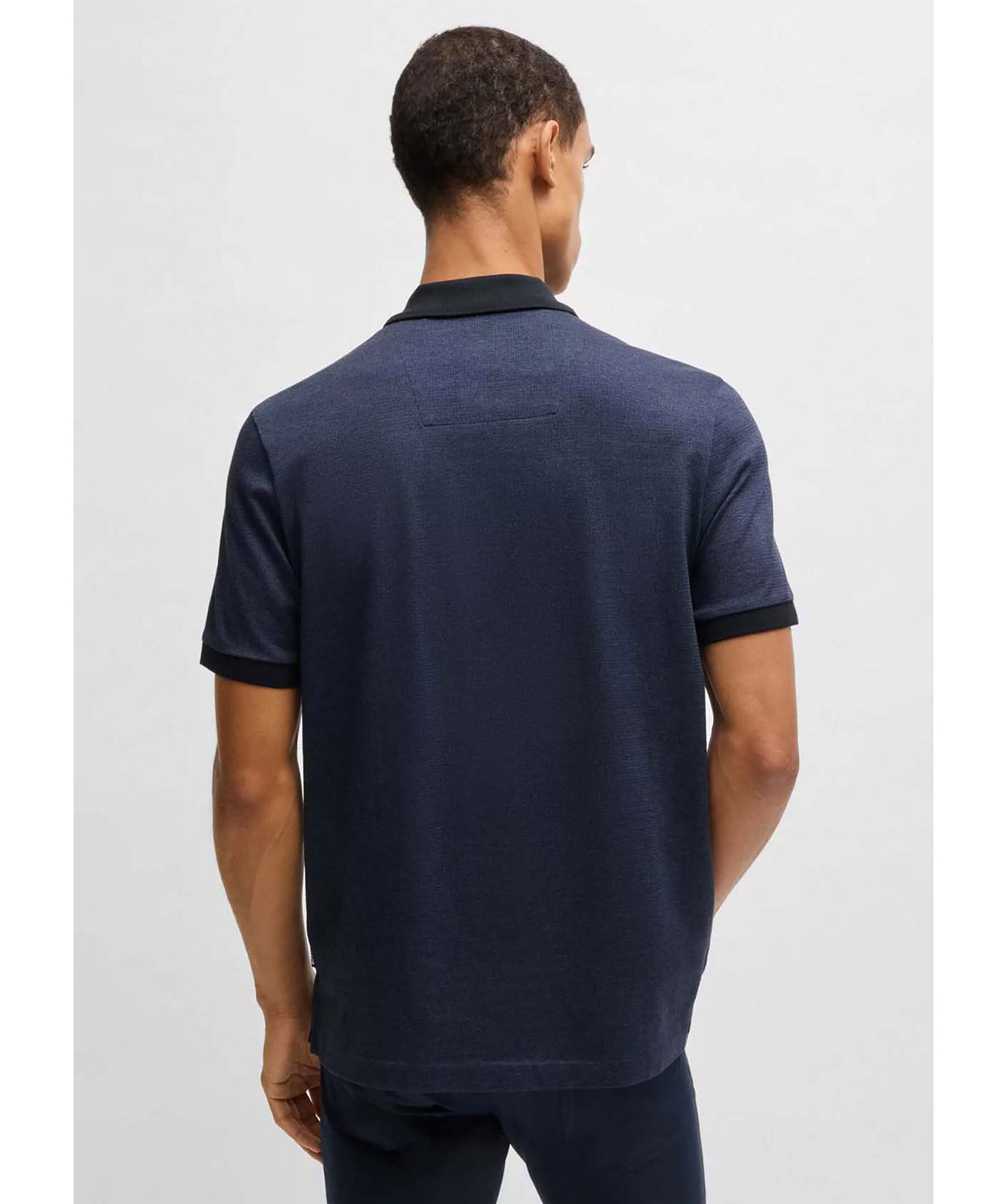 Mörkblå mönstrad piké från Boss Black. , tröjan har mörka detaljer kring krage och ärmslut. Två knappar vid kragen och är tillverkad av 100% bomull.