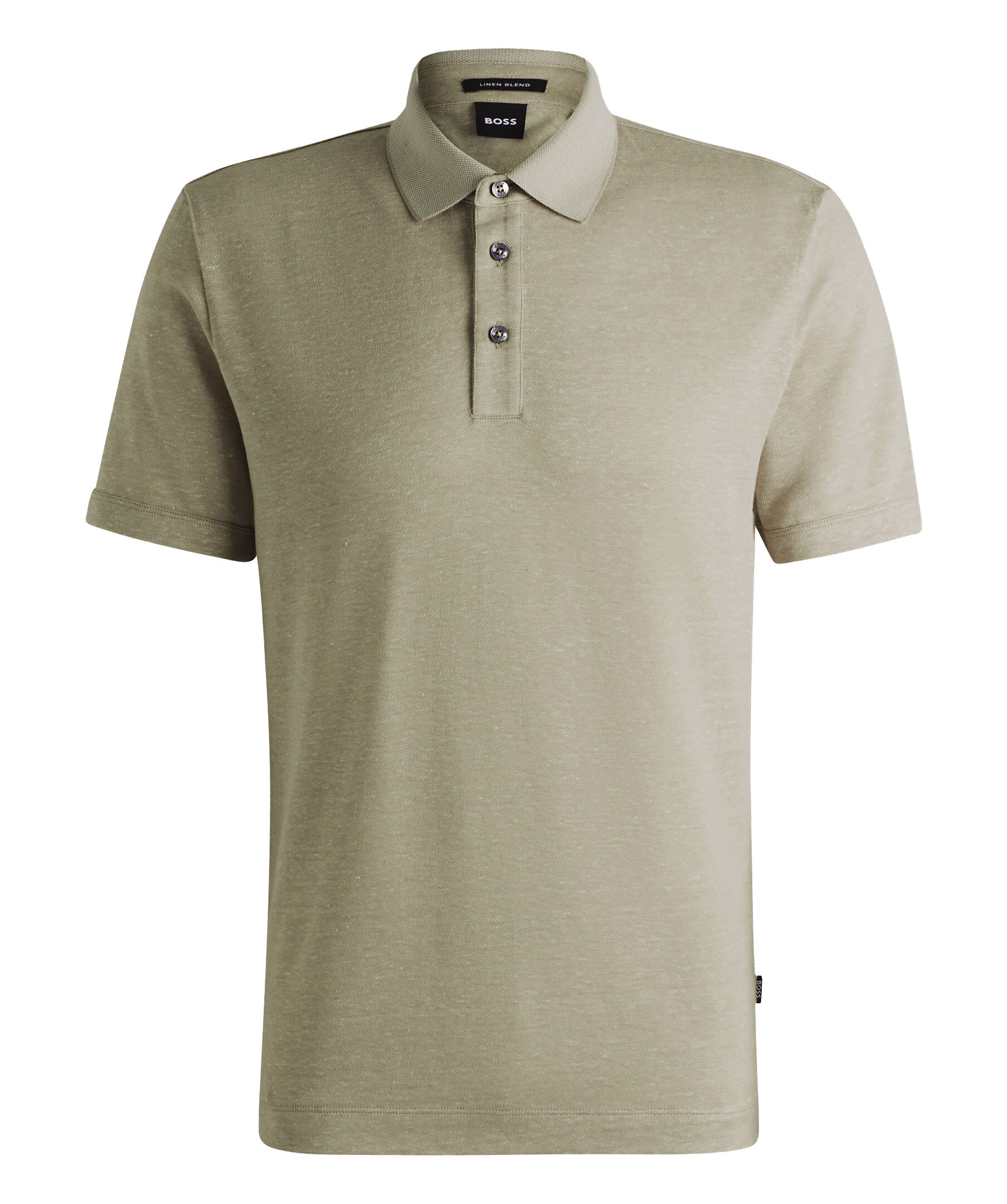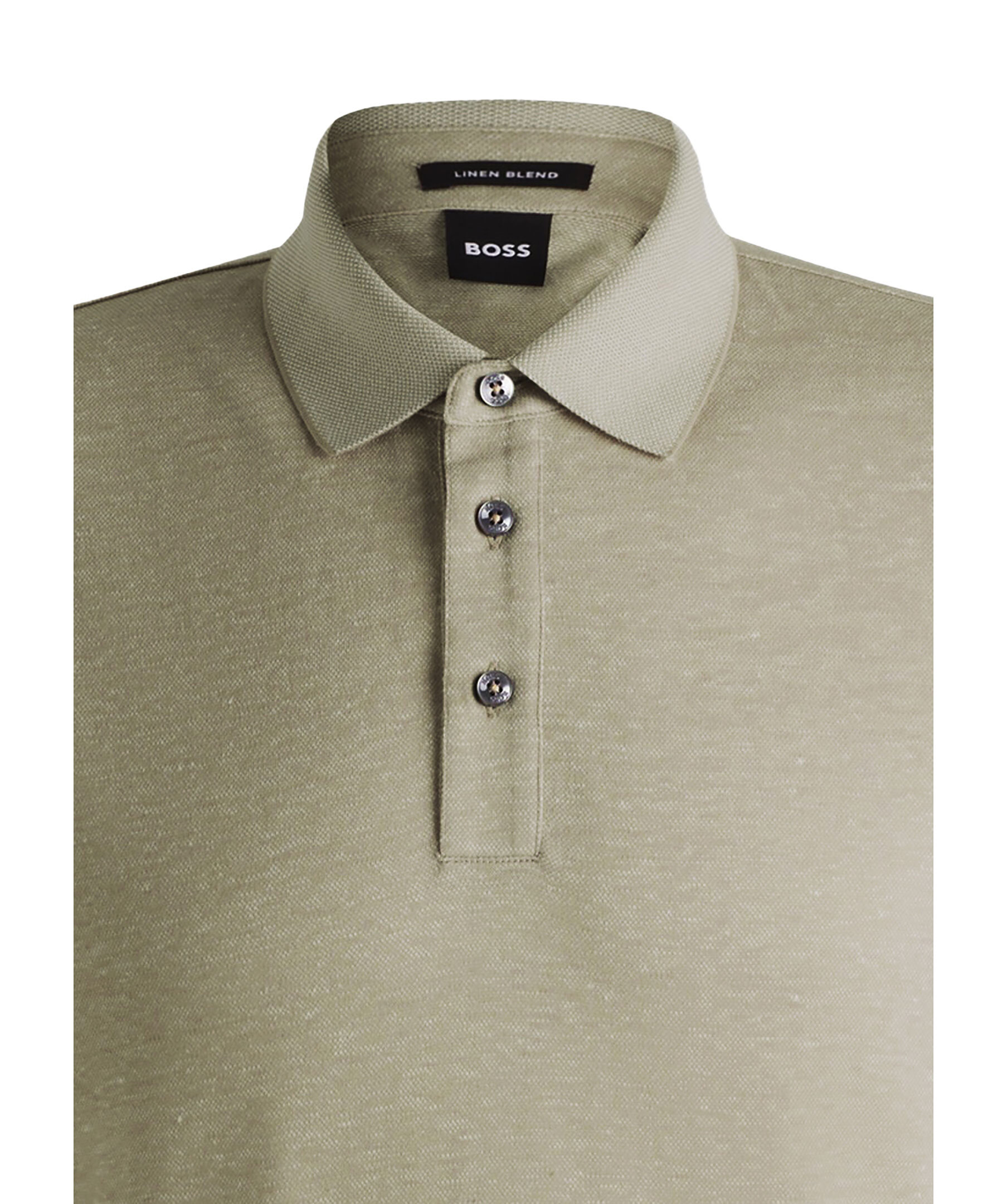 Grön, melerad piké med korta ärmar från BOSS Black. Pikén har tre knappar framtill och en ljusare krage. korta slitsar i sidorna. Tillverkad i en bomull- och linblandning.