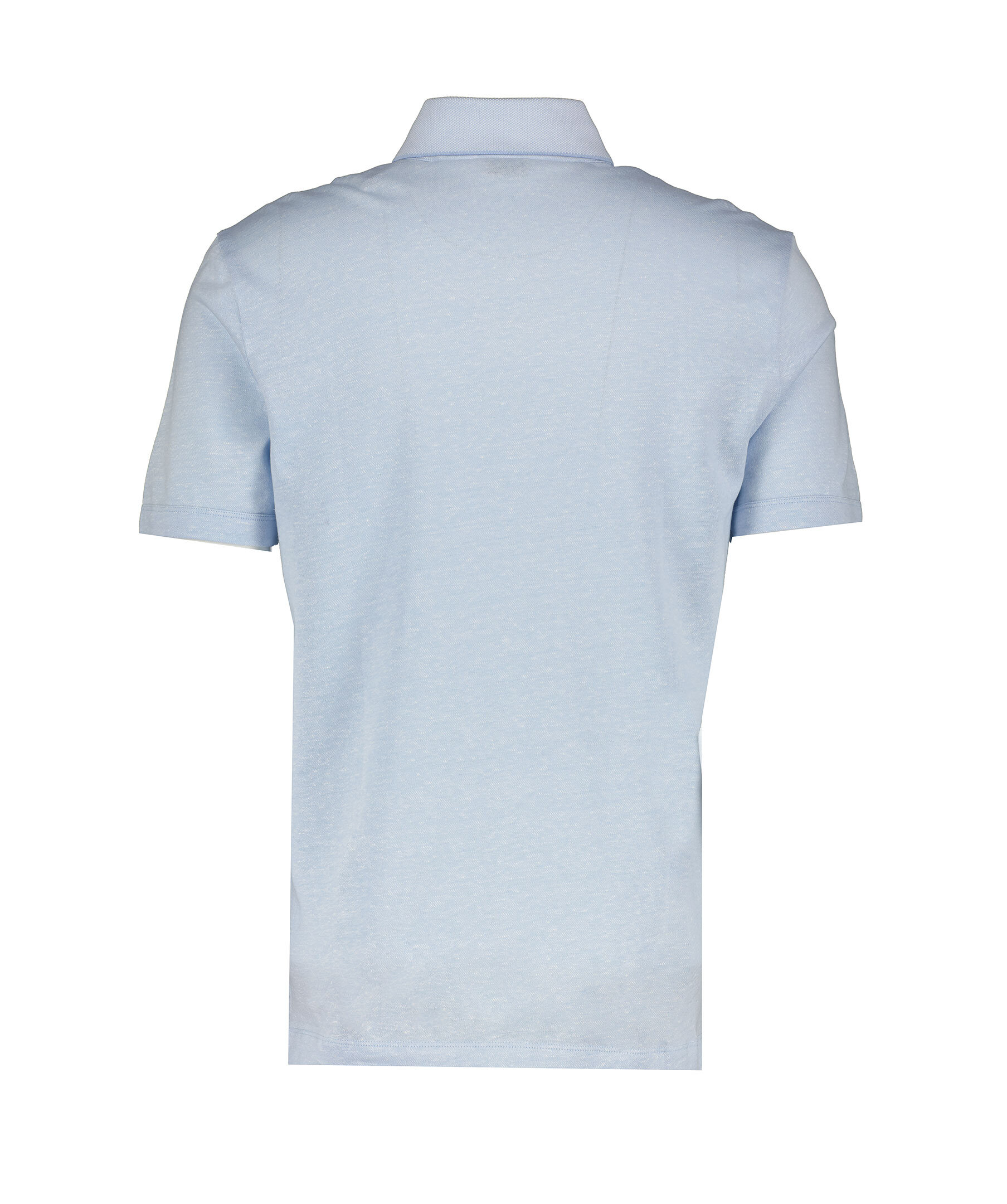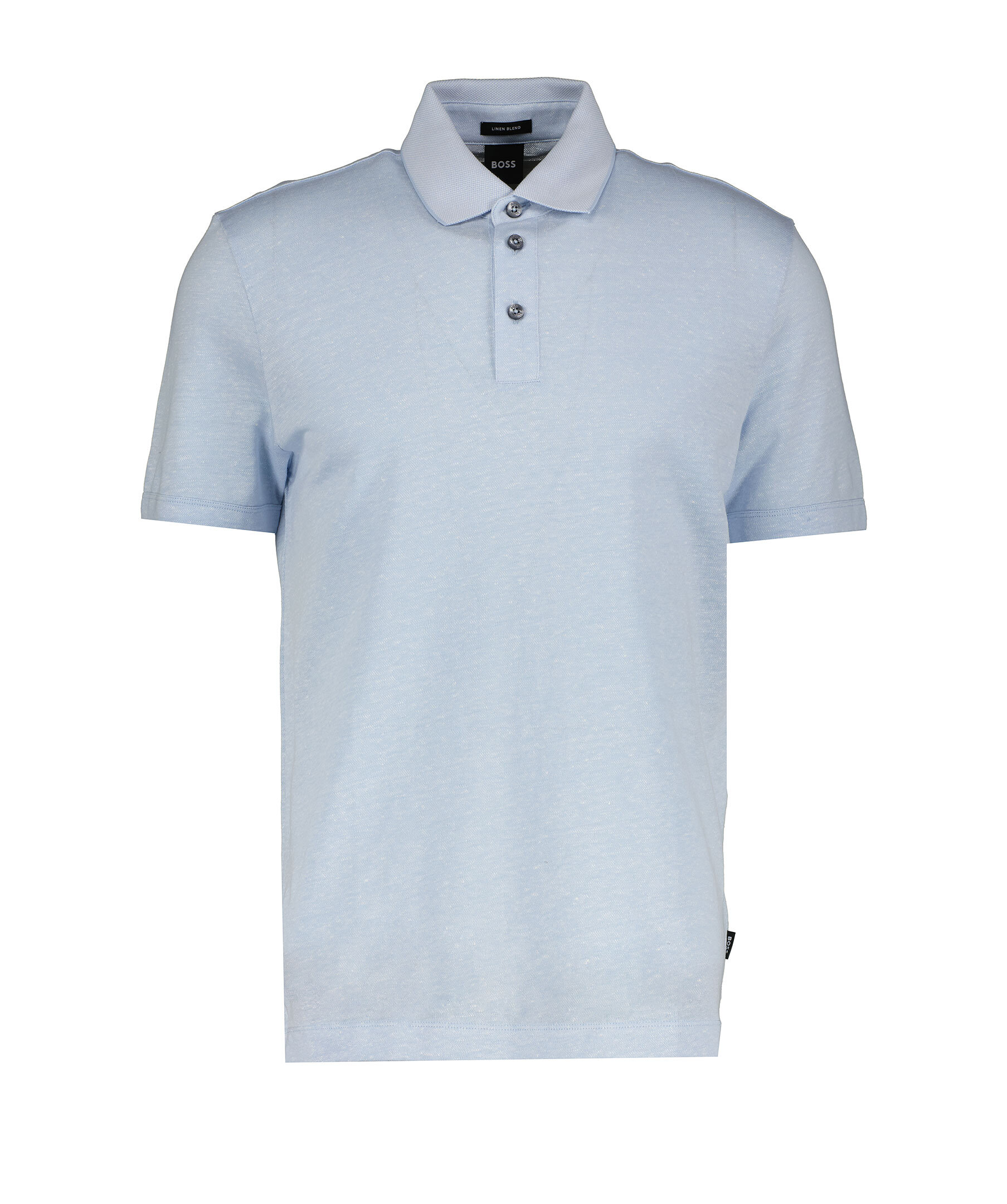 Ljusblå, melerad piké med korta ärmar från BOSS Black. Pikén har tre knappar framtill och en ljusare krage. korta slitsar i sidorna. Tillverkad i en bomull- och linblandning.