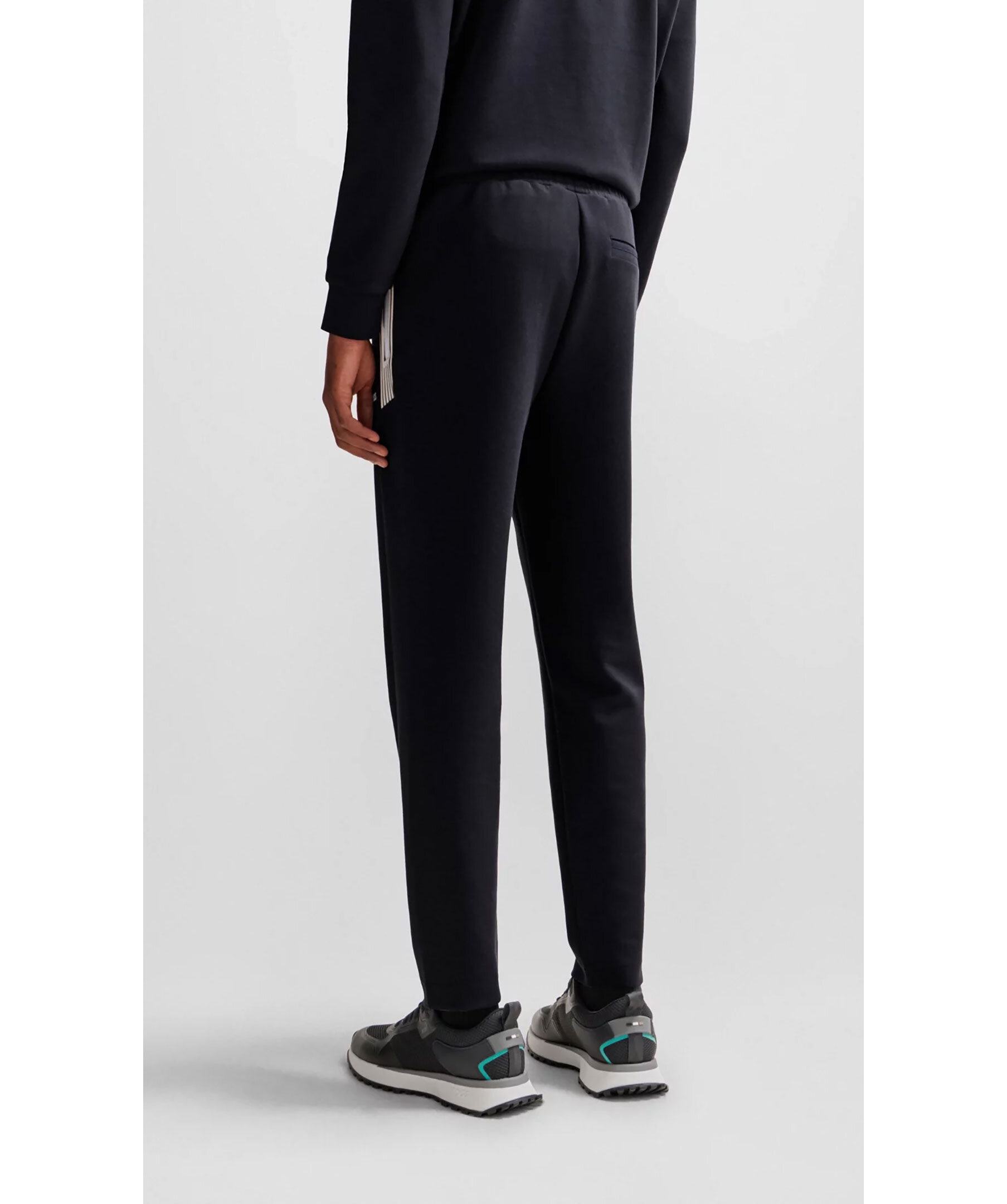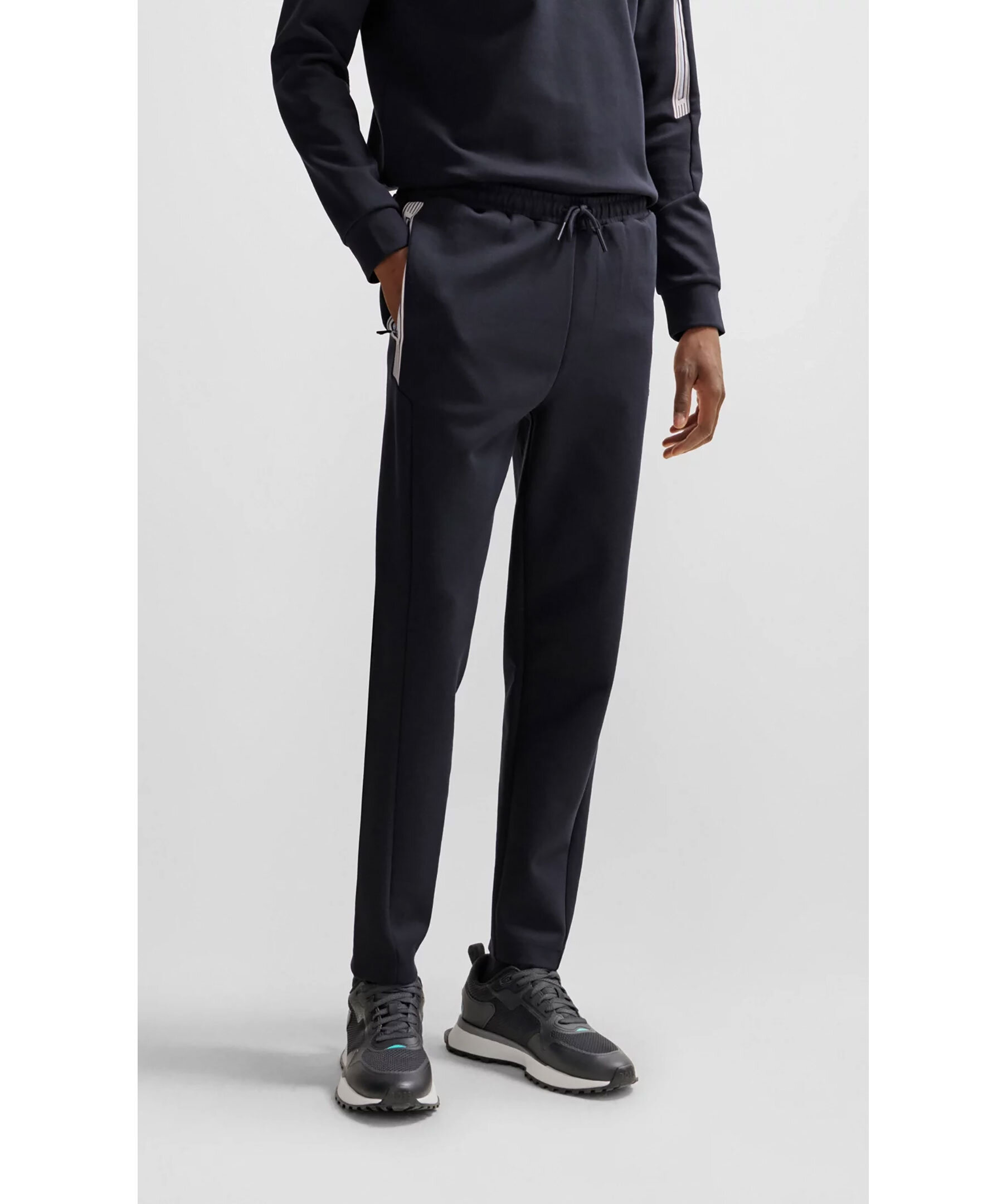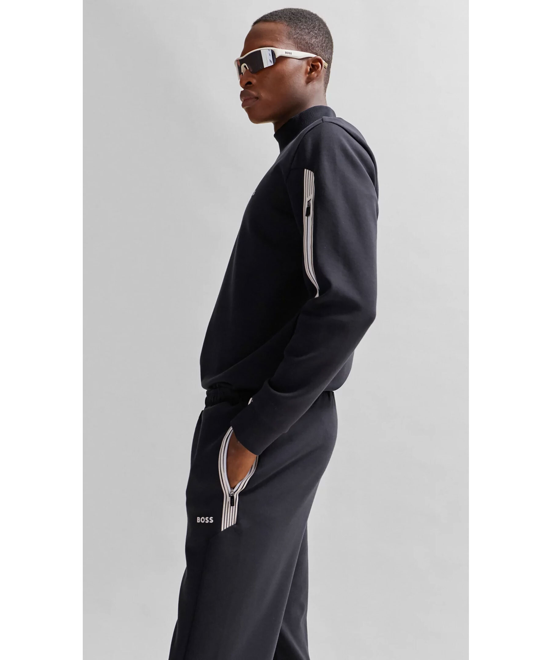 Svarta, ikoniska tracksuit-byxor i straight fit från BOSS Green. Tillverkade av en stretchblandning med HD-logga på vänster ben. Det här plagget är tillverkat av ekologisk bomull. Dragsko i midjan. Sidfickor med blixtlås, Welt-ficka baktill. Normal passform.
