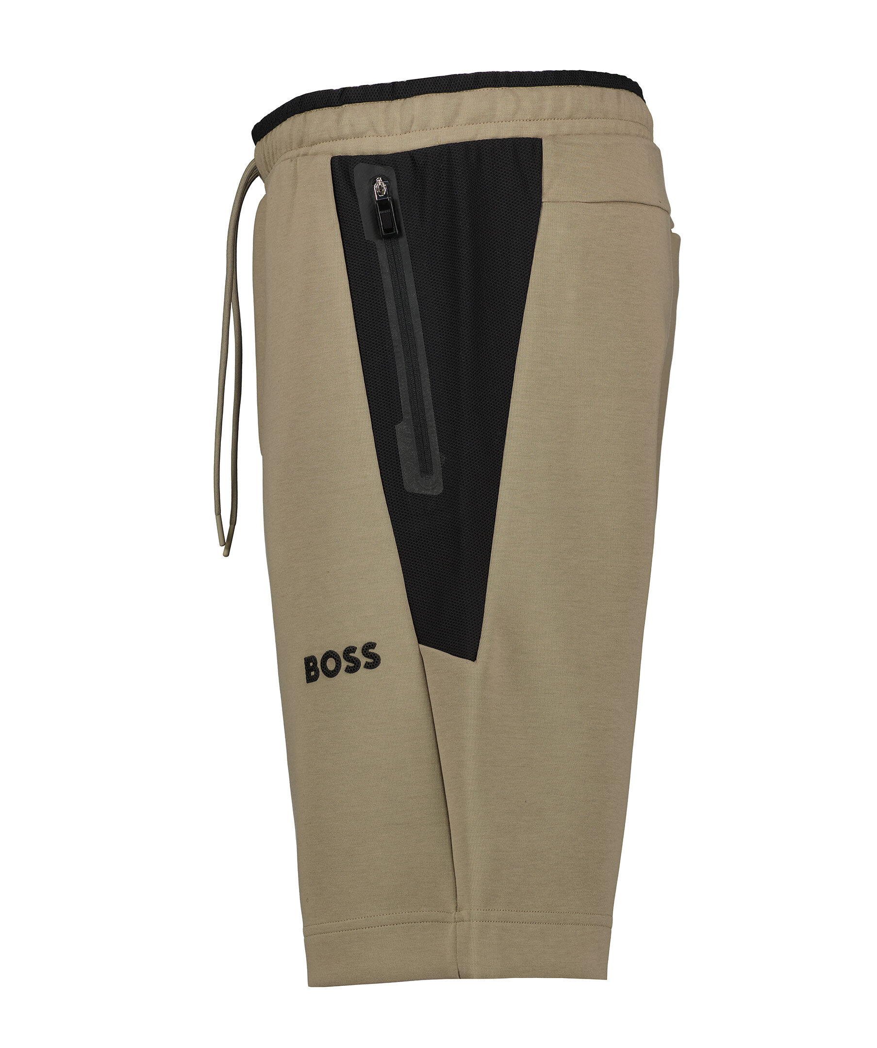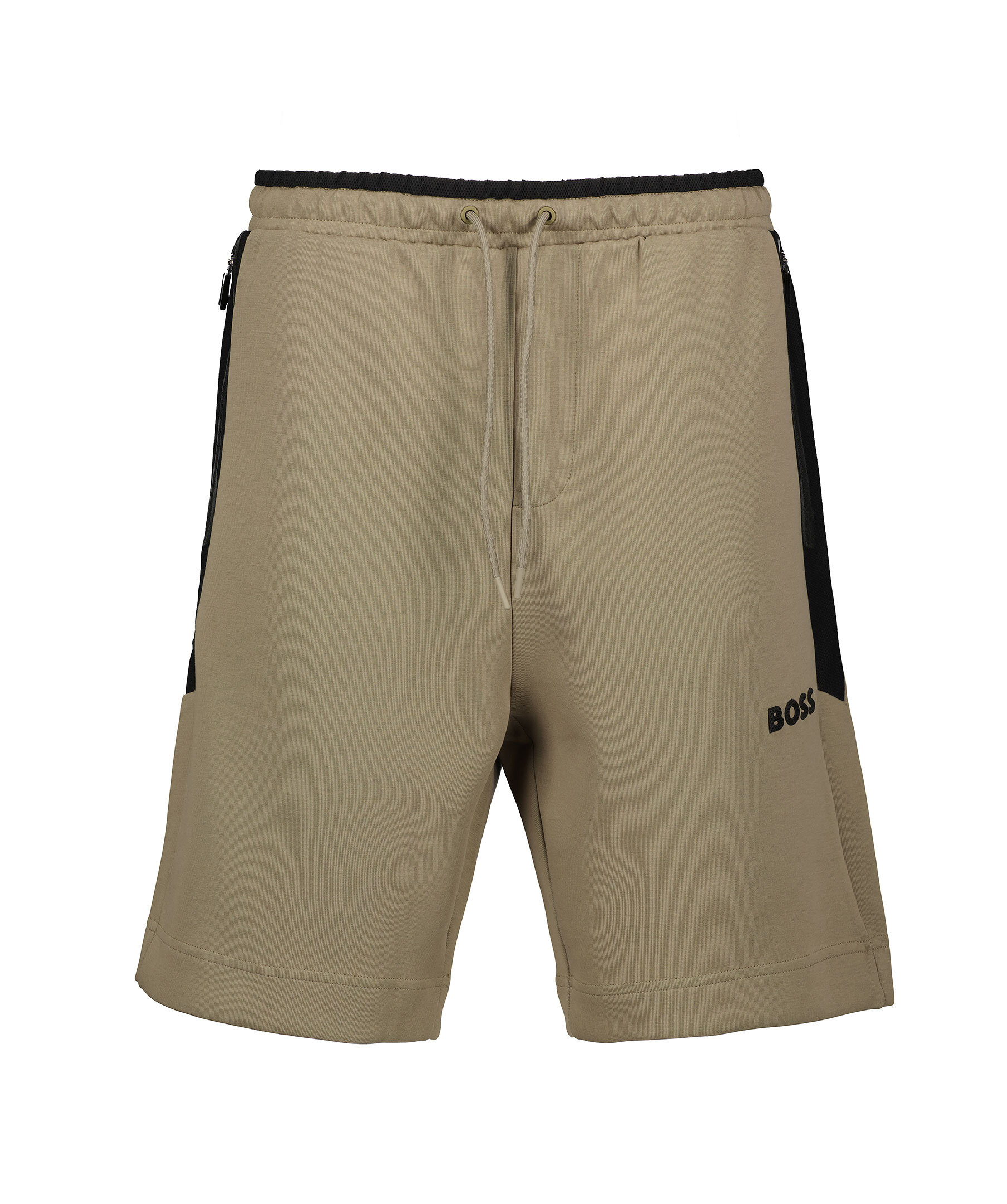 Greige mjukisshort från BOSS Green. Tillverkade av stretchigt interlocktyg med dragsko i midjan, 3D-modellerad logga och meshinlägg. Två sidfickor med dragkedja samt dold passpoalficka baktill. Normal, rak passform.