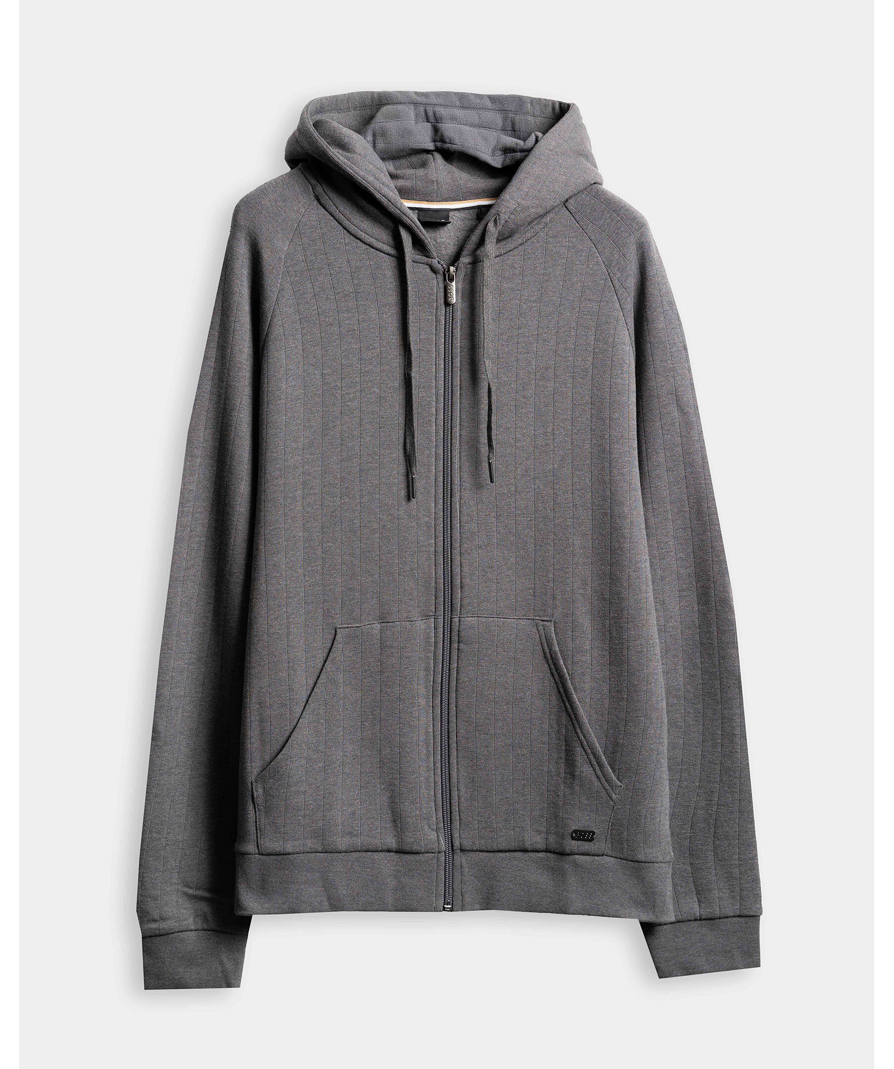 Grå hoodie med zip från BOSS med en subtil rand. Tröjan har känguruficka, dragsko vid huva samt ett mjukt foder.