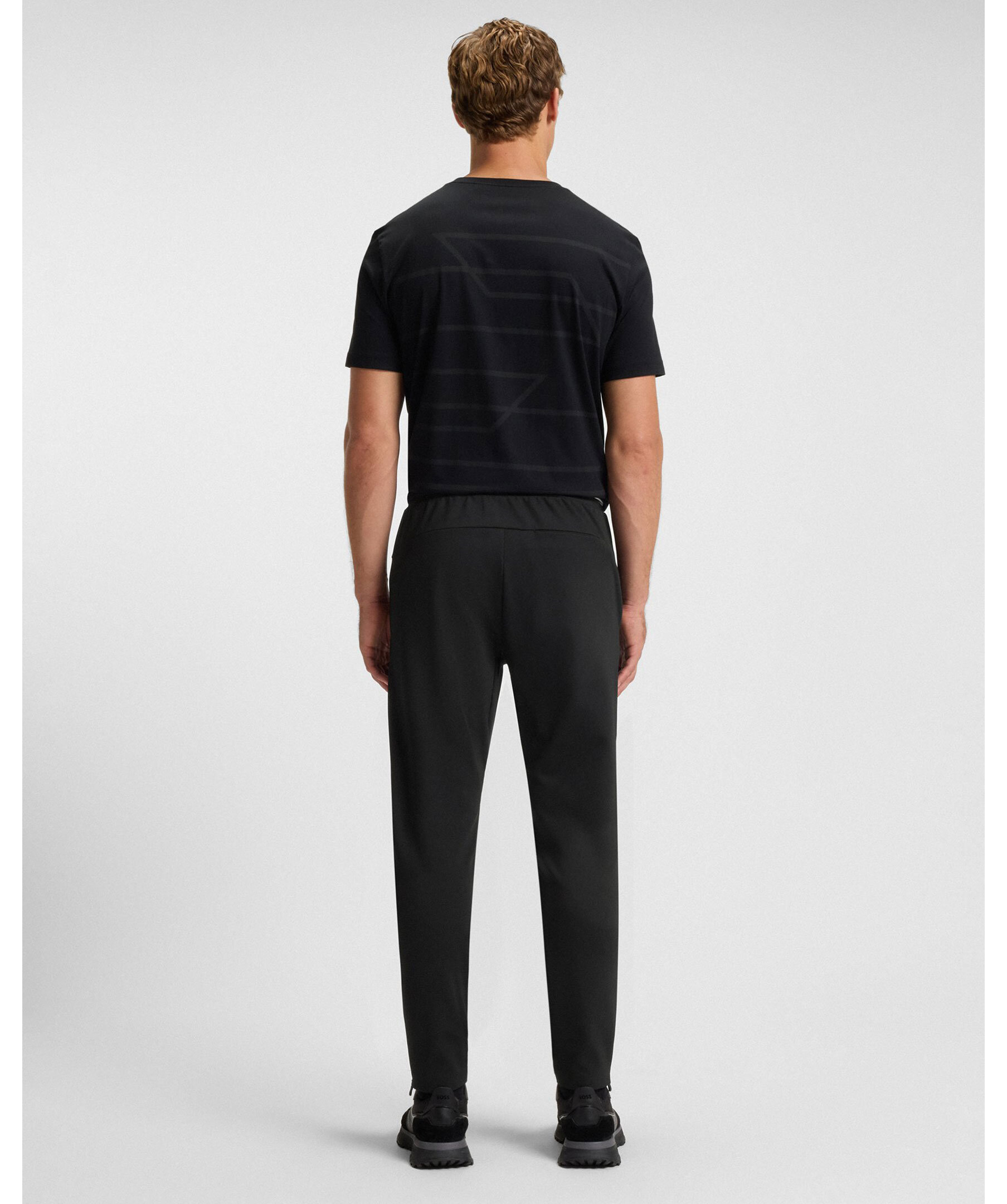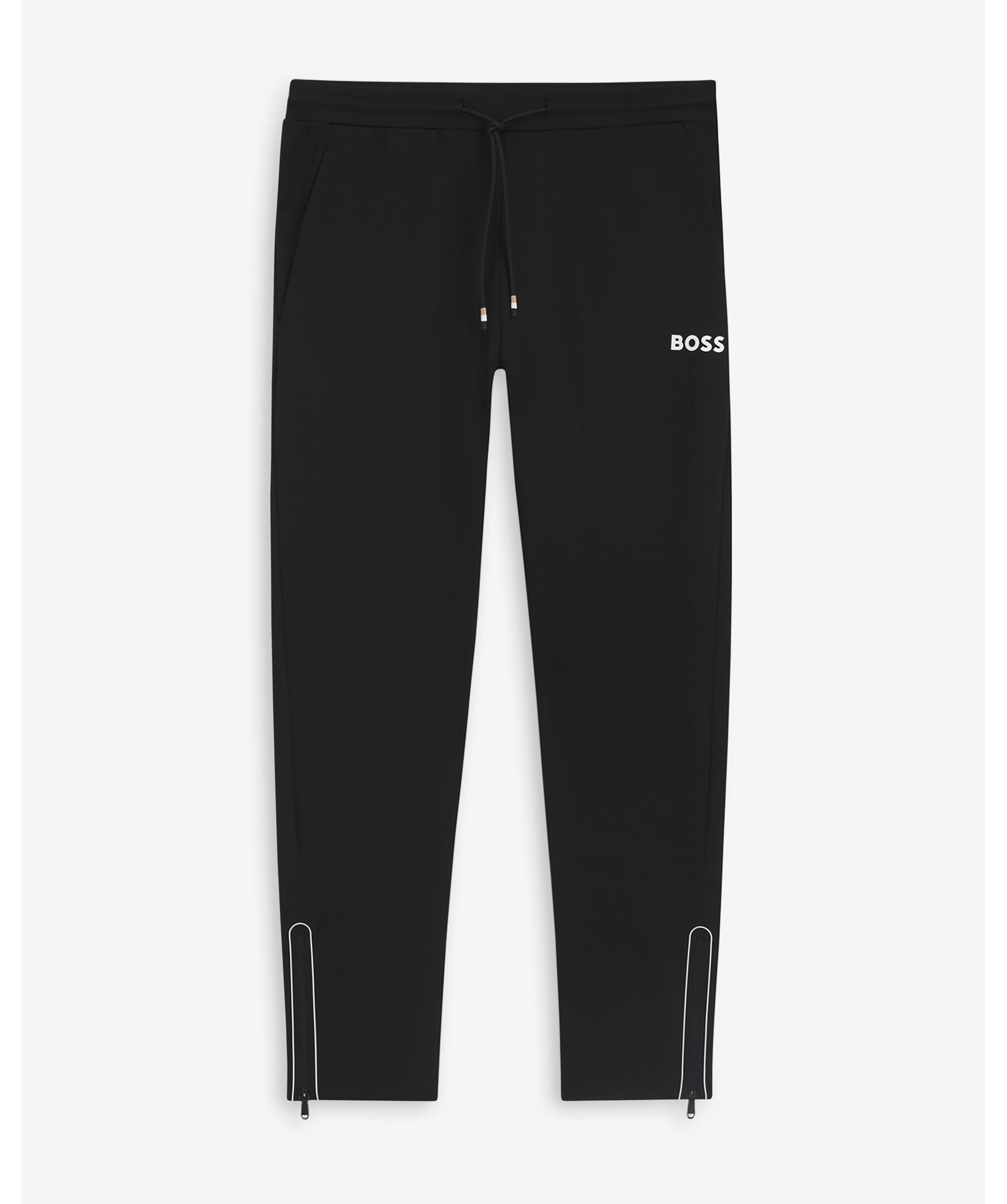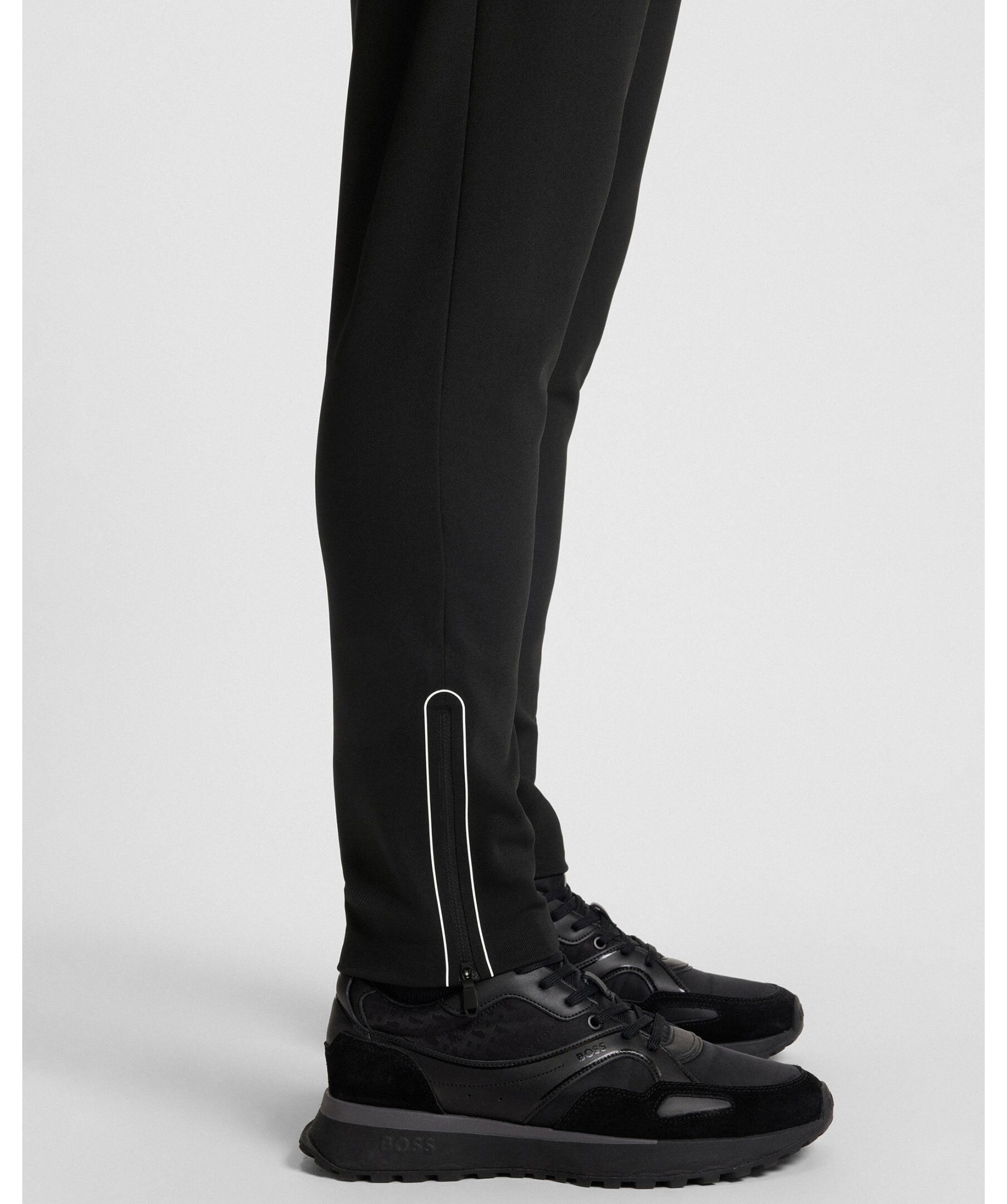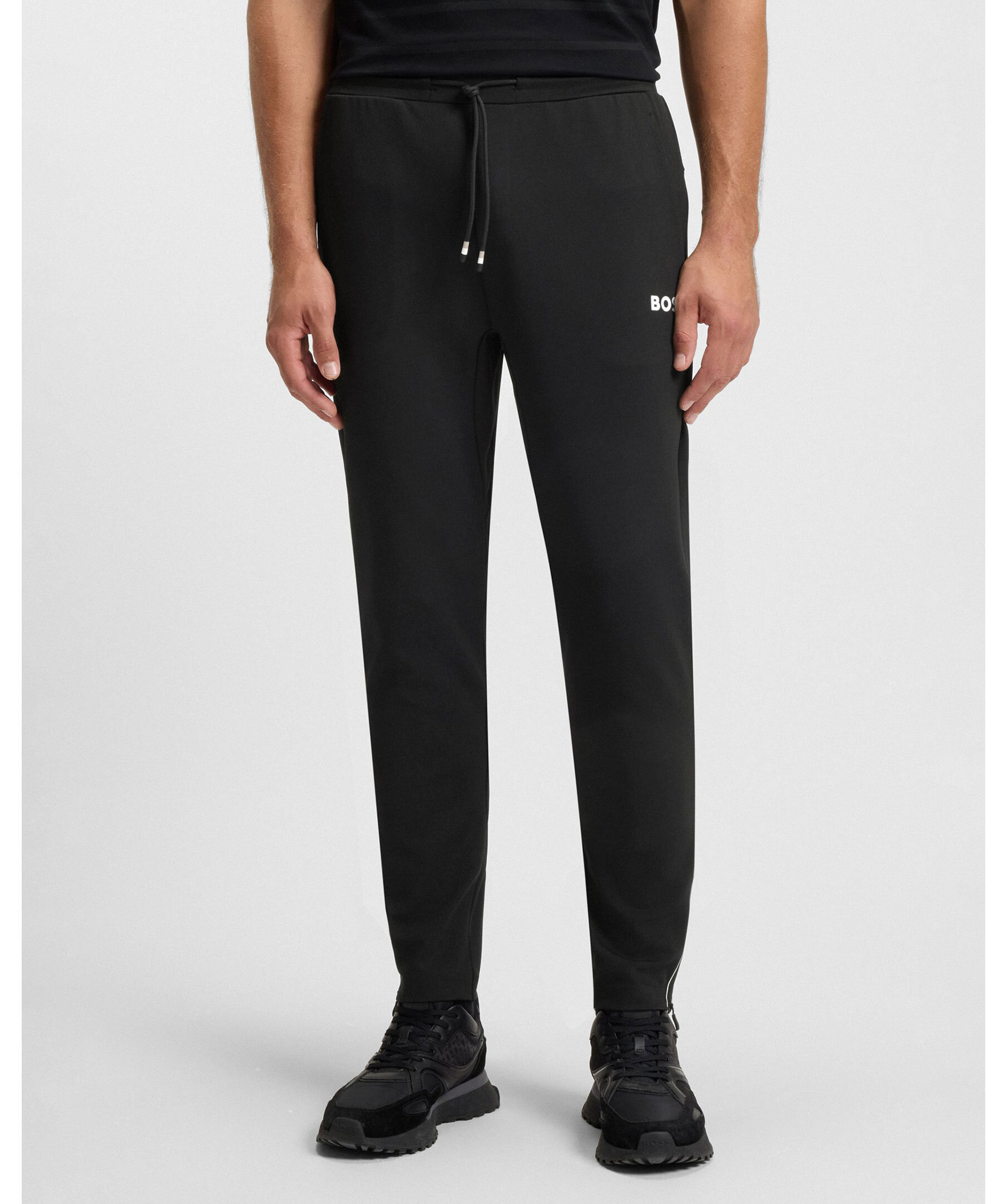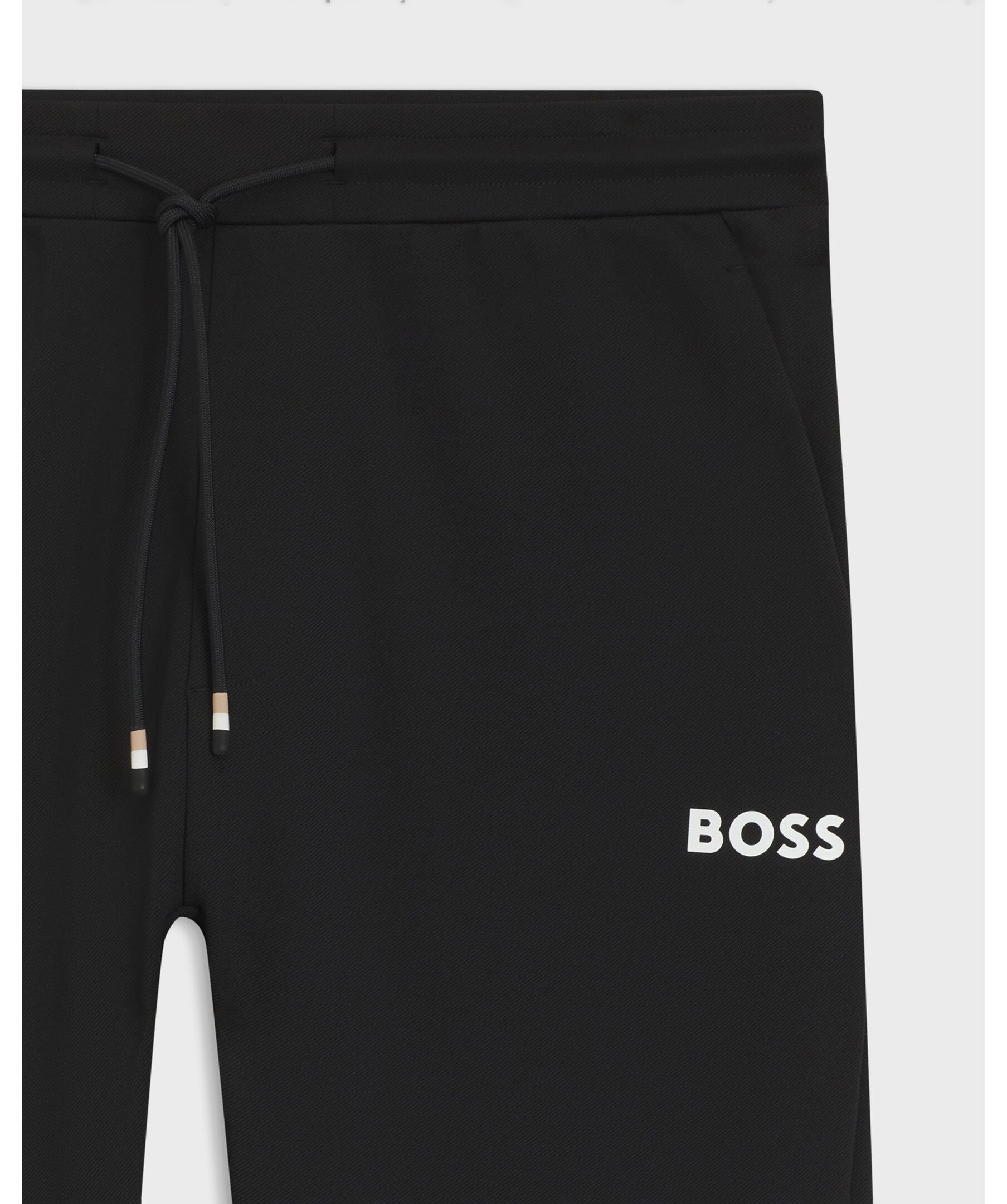 Svarta tracksuitbyxor från BOSS Green i regular fit. Torkar snabbt för komfort. Hållbar, strykfri gabardin med stretch och fukthantering. Vit BOSS-logotyp under den vänstra fickan och dragkedja vid benslut.