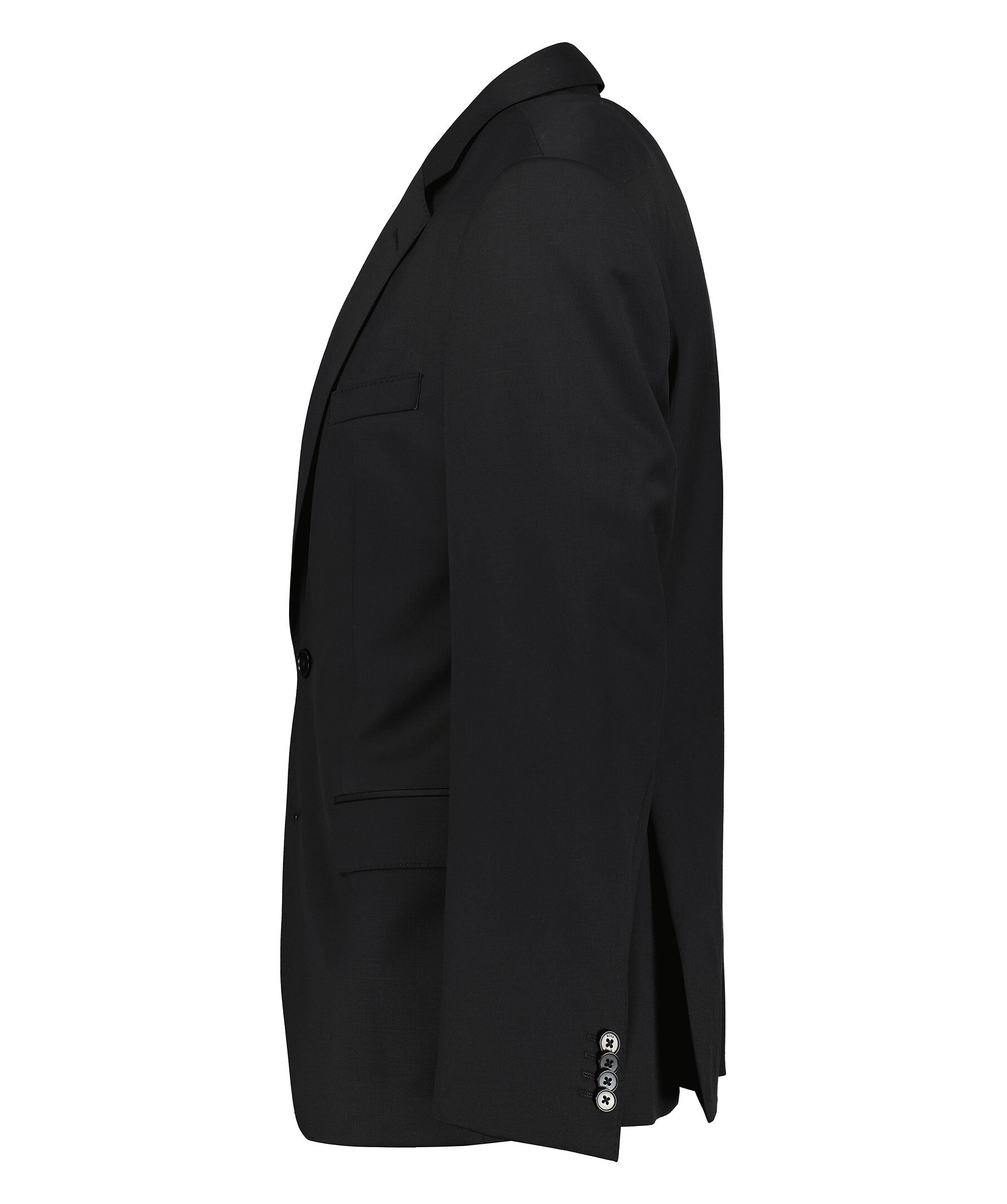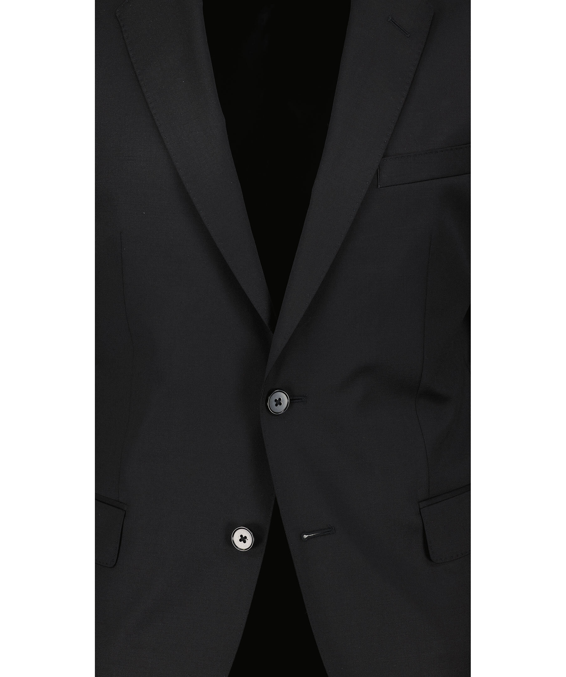 Svart kavaj från BOSS Black. Enkelknäppt. Slim fit passform. Två fickor framtill med lock, En bröstficka Snedskurna kavajslag. Yttertyget tillverkad i 100% Ull.