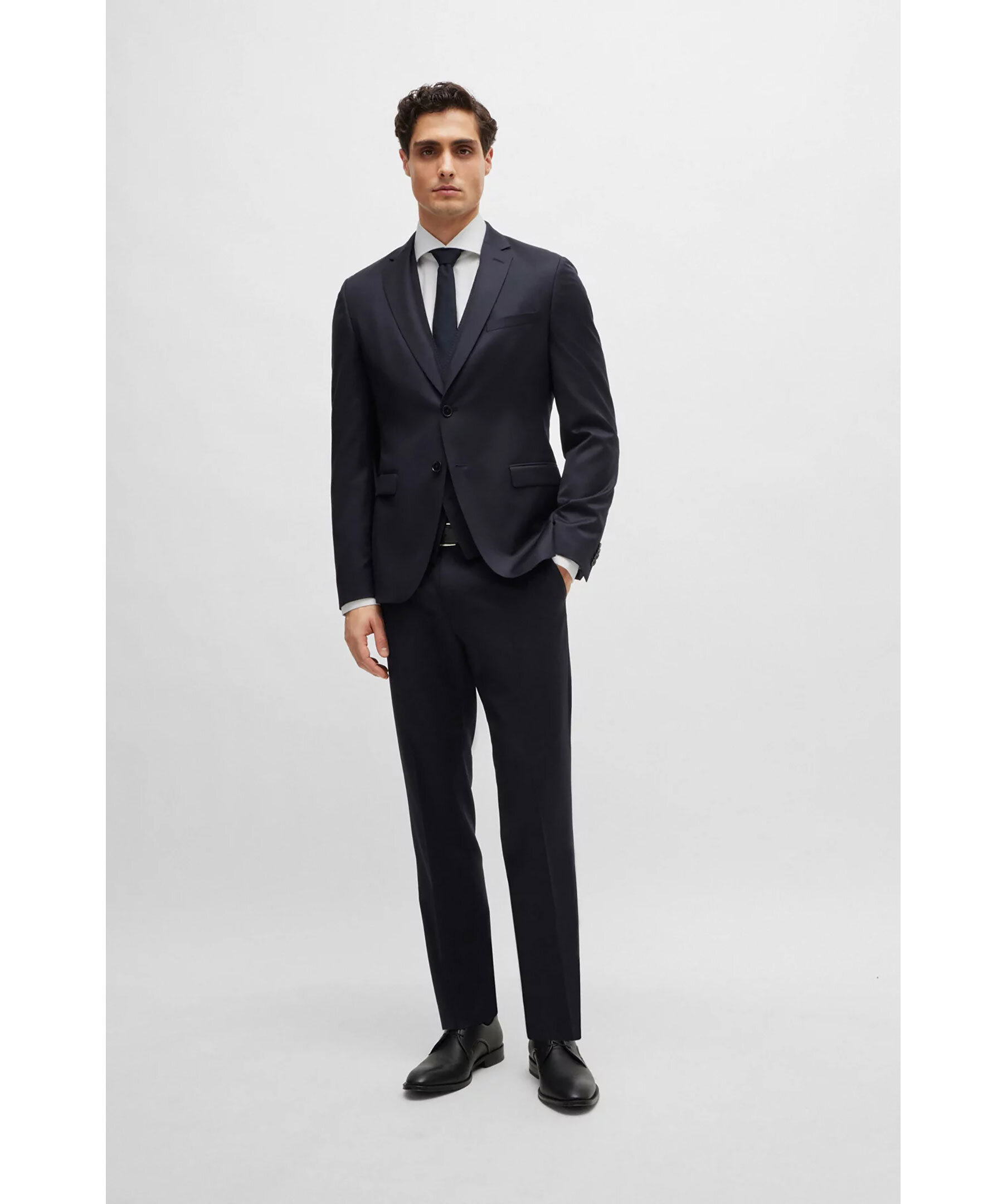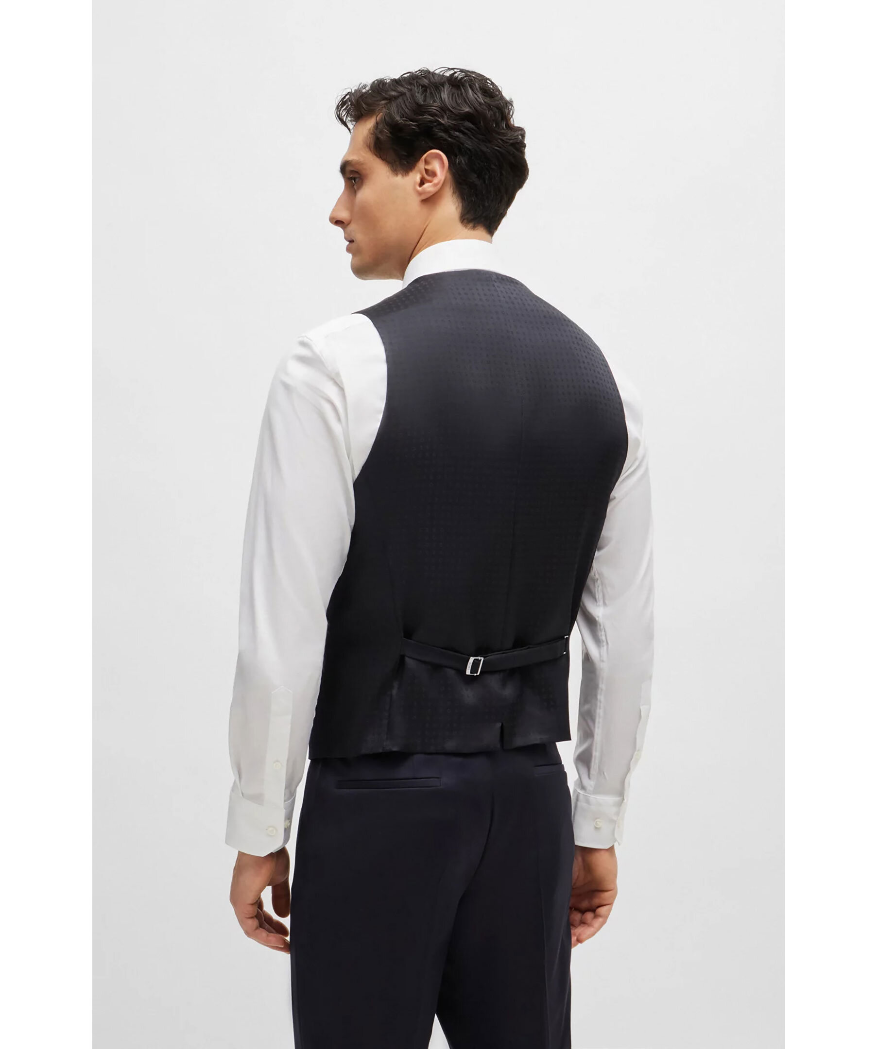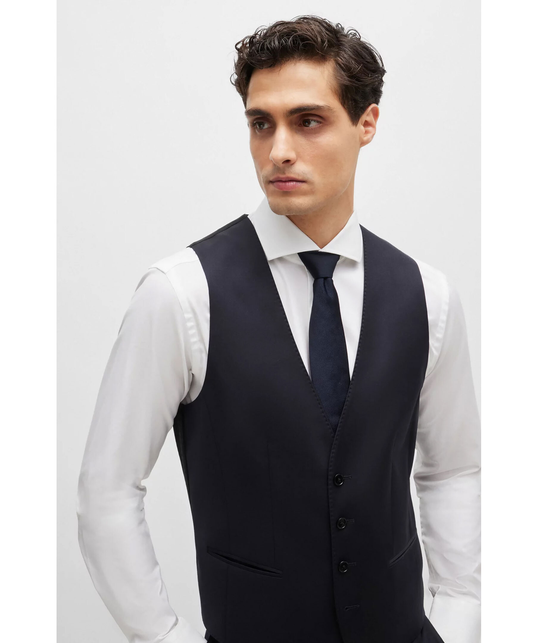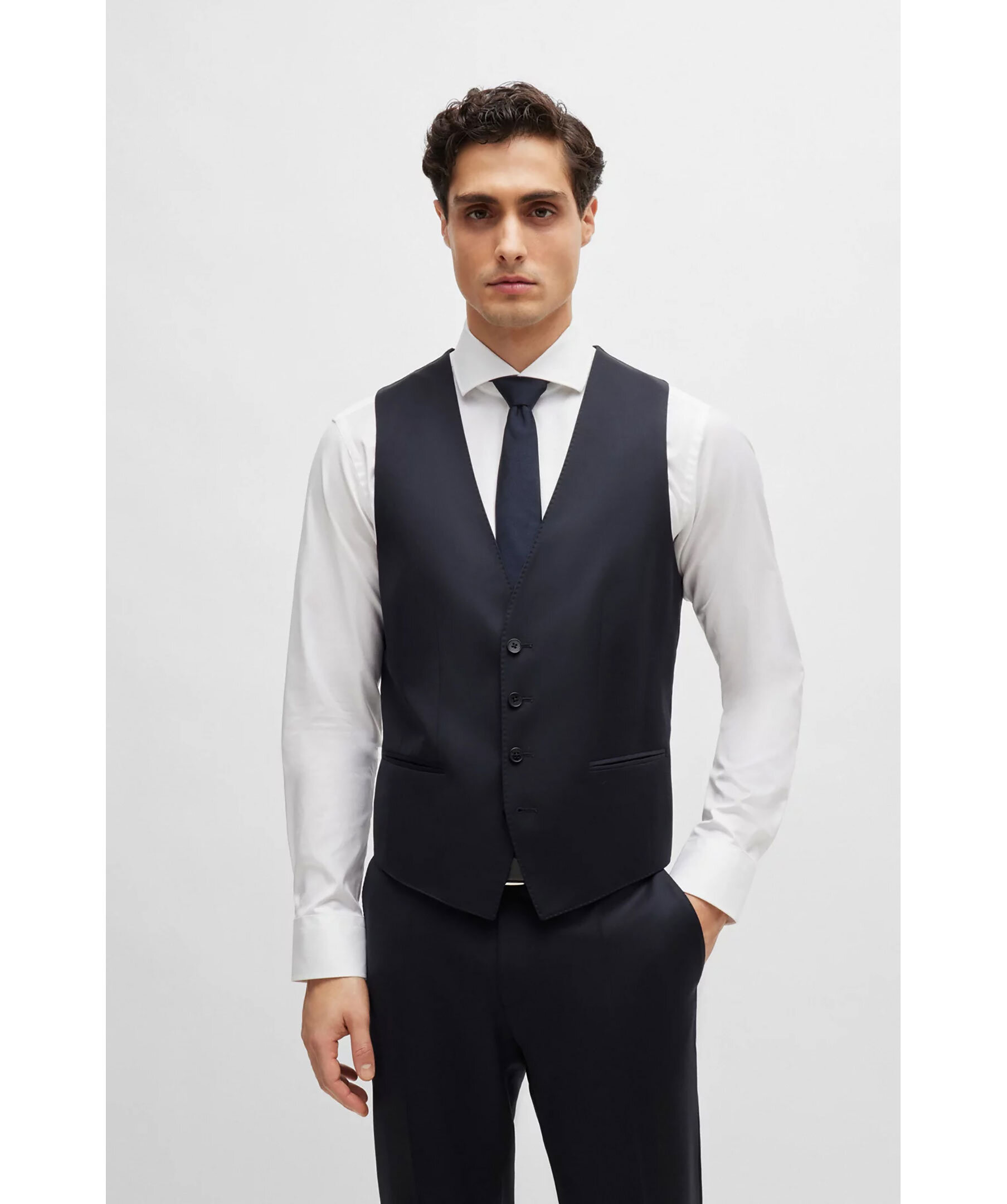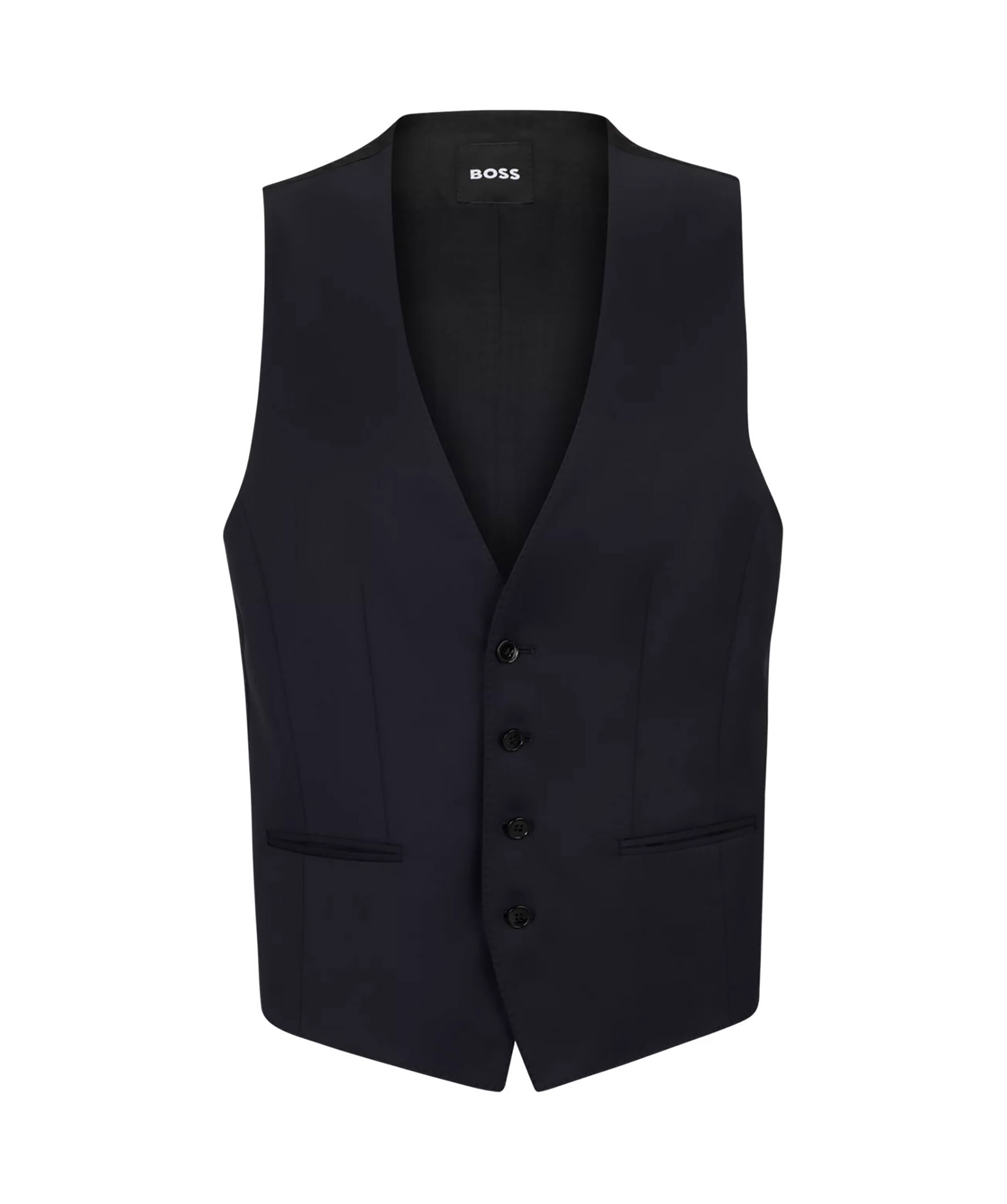 Mörkblå kostymväst från BOSS Black. Västen har enkelknäppning och två passpoalficka fram. Tillverkad i jungfruul.