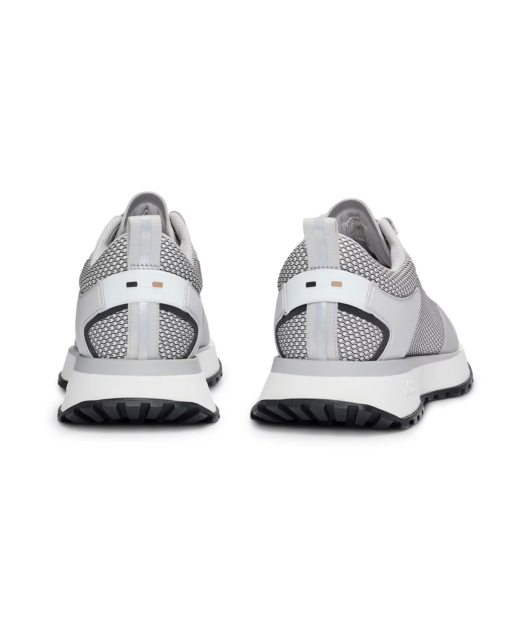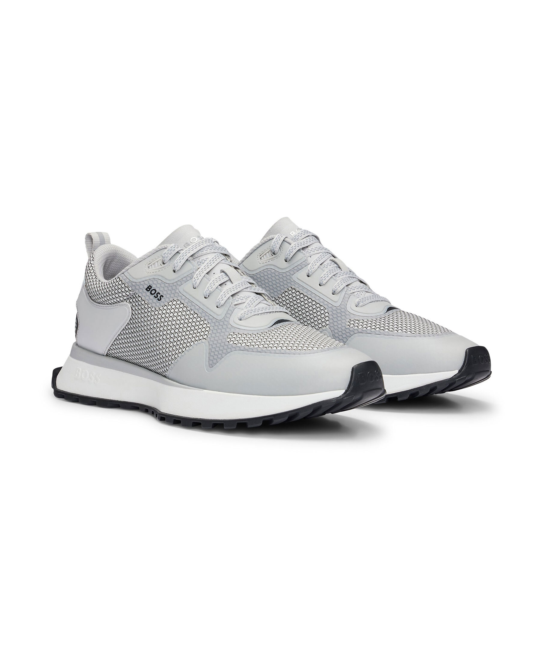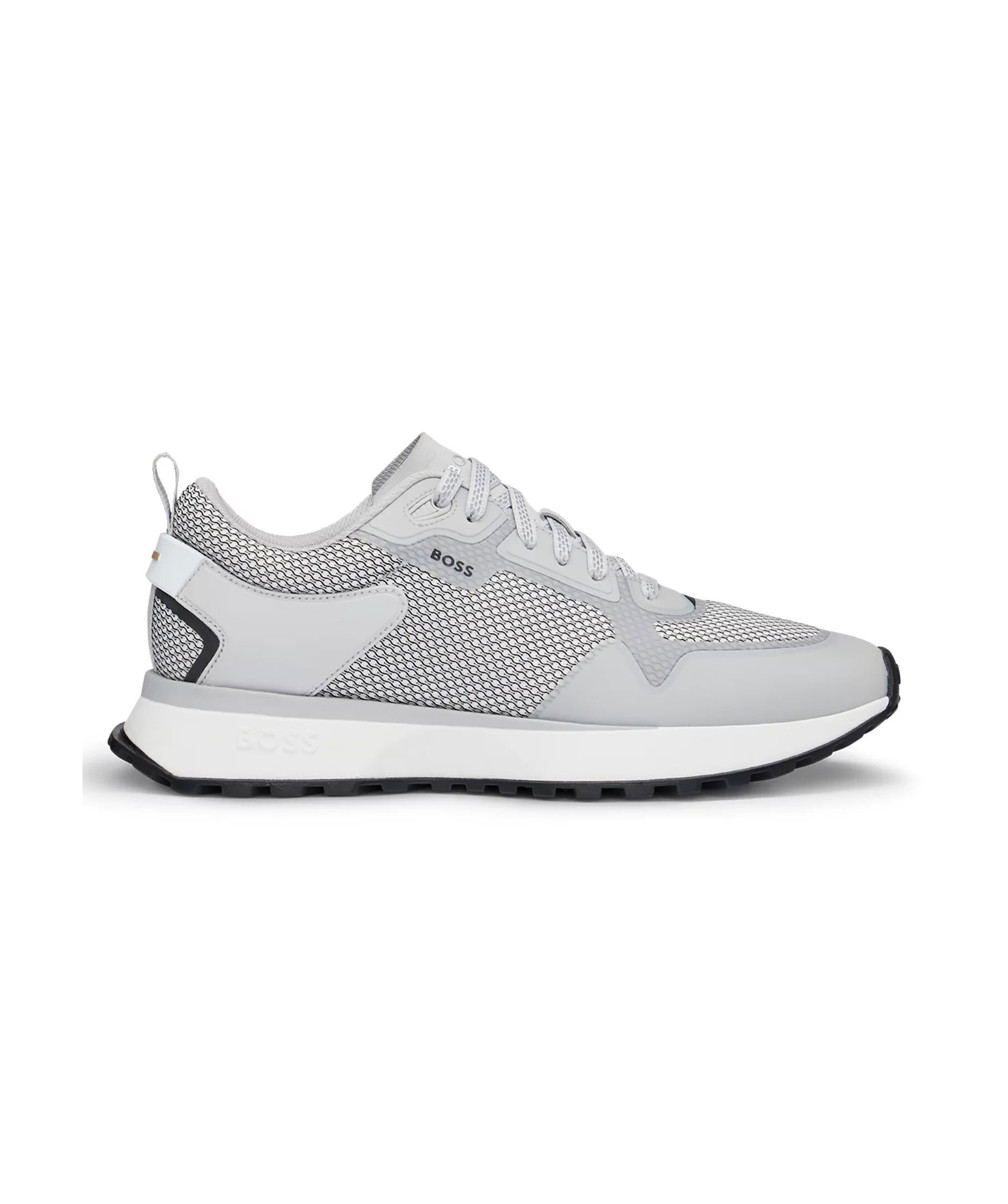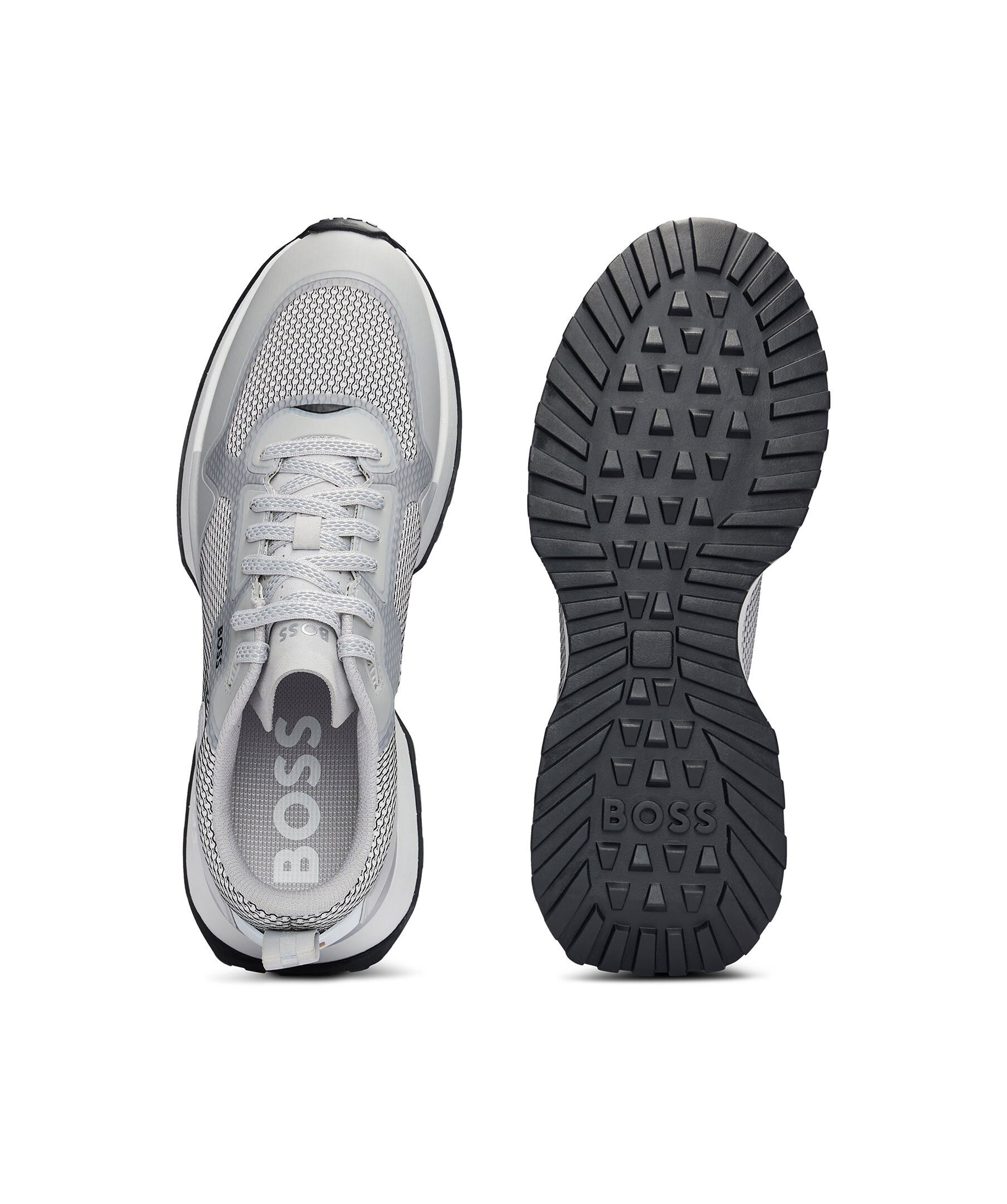 Ljusgrå träningsskor från BOSS Black. Tillverkade i en blandning av material, inklusive mesh, detaljerade med en EVA-yttersula och logotyp på utsidan samt på plösen.