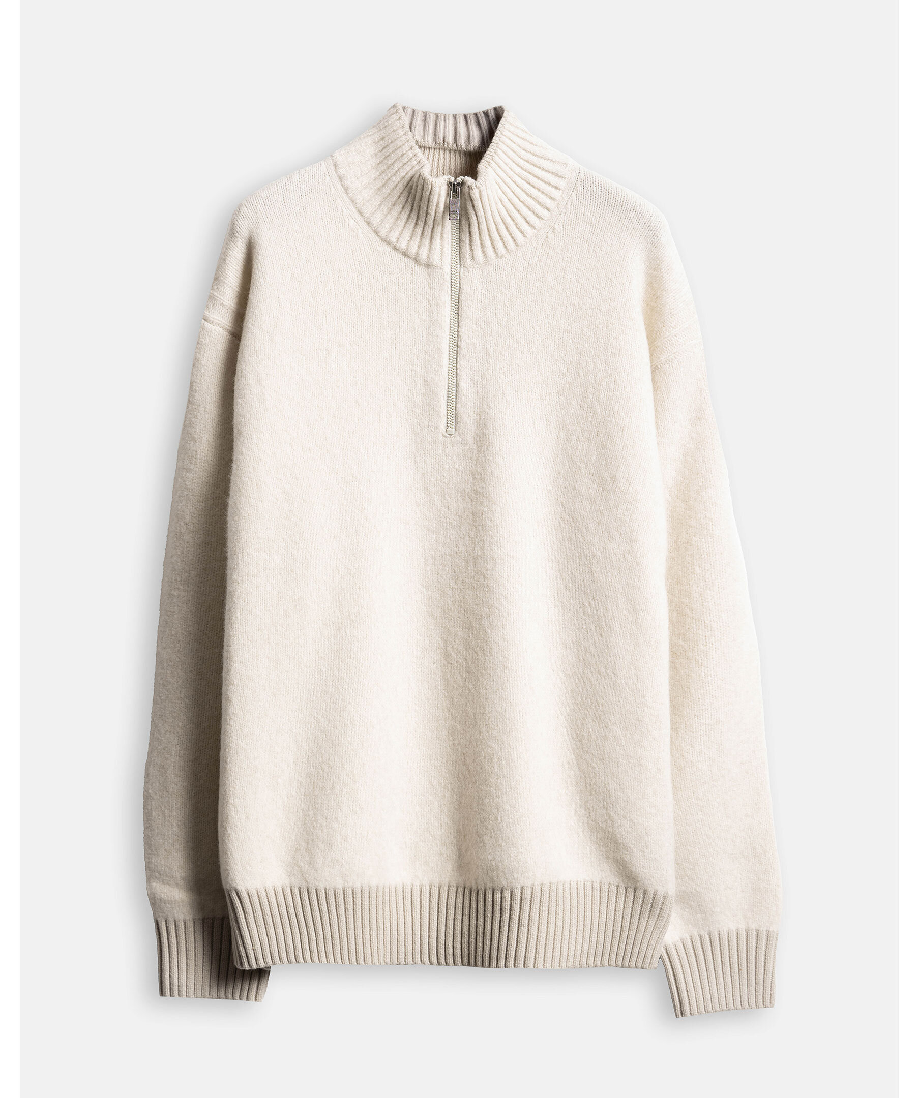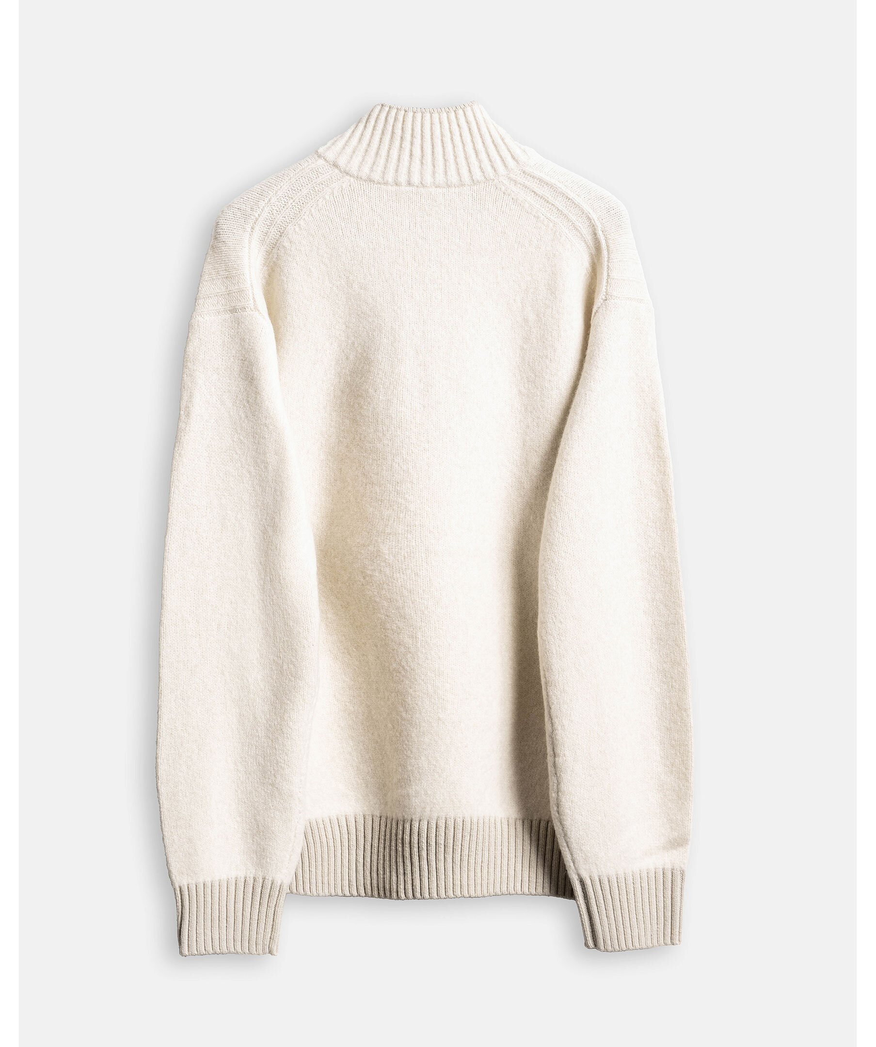 Vit stickad half-zip tröja i ullblandning från BOSS. Ribbstickade muddar samt krage i beige. Relaxed fit.