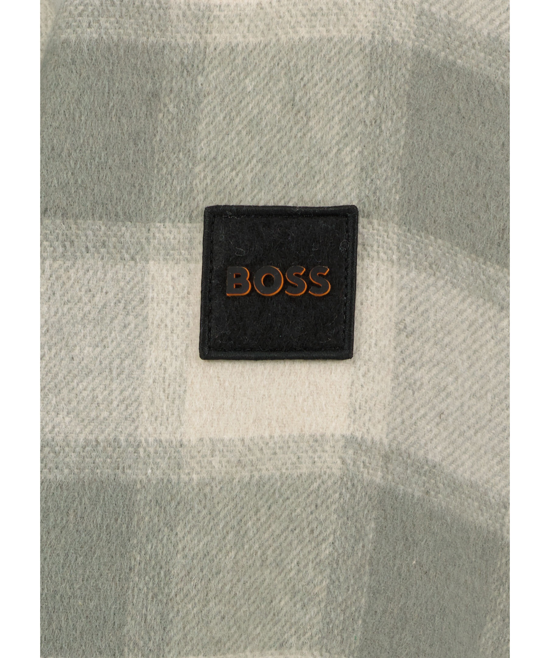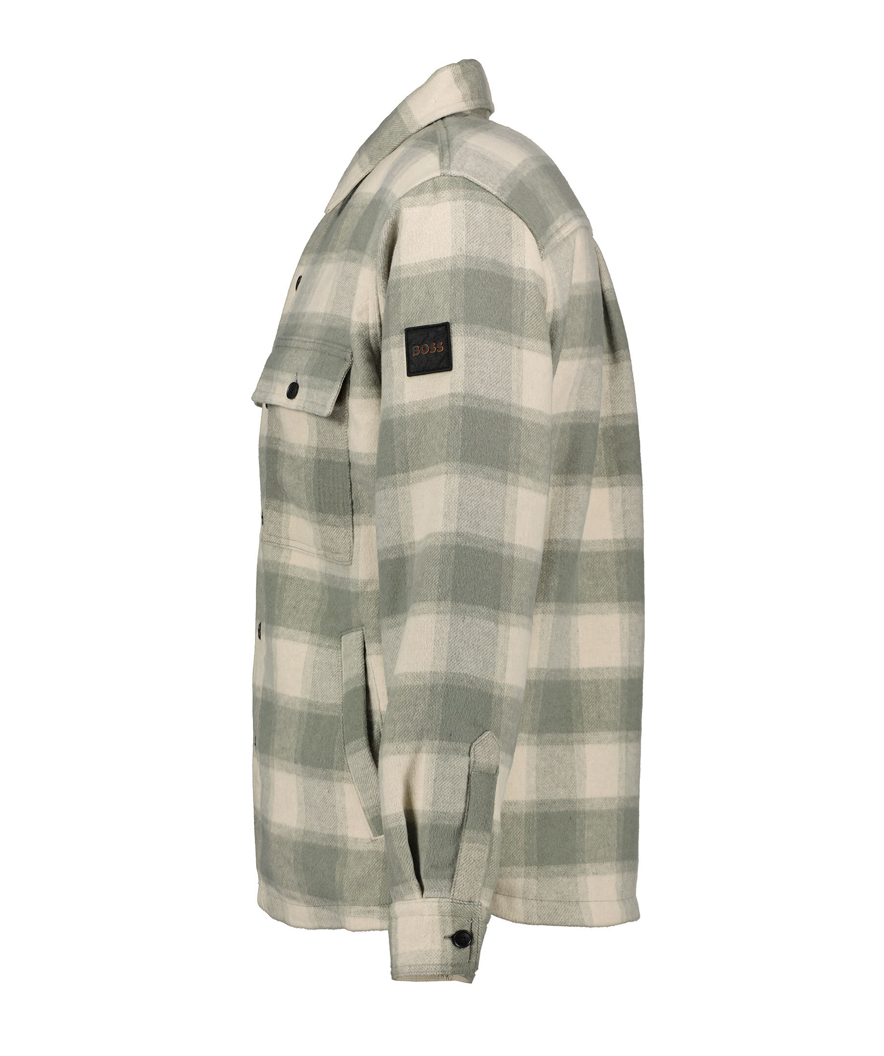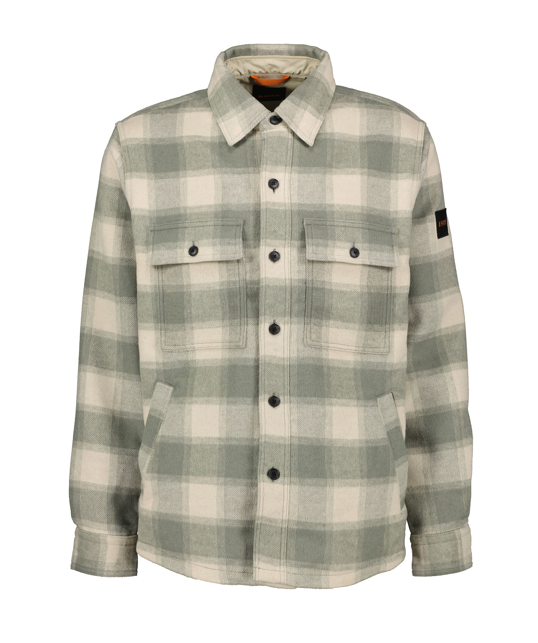 Beige och grön rutig overshirt från Boss Orange. Overshirten stängs med knappar har två bröstfickor med lock och knap. Två öppna sidofickor. Boss logotyp i tyg och gummi på vänster ärm. Tillverkad av en ull och polyester blandning.