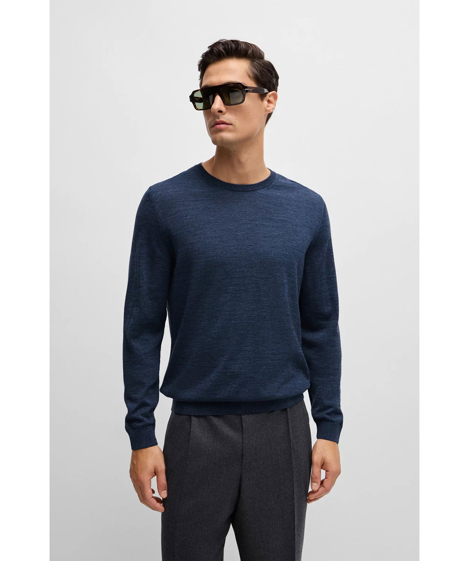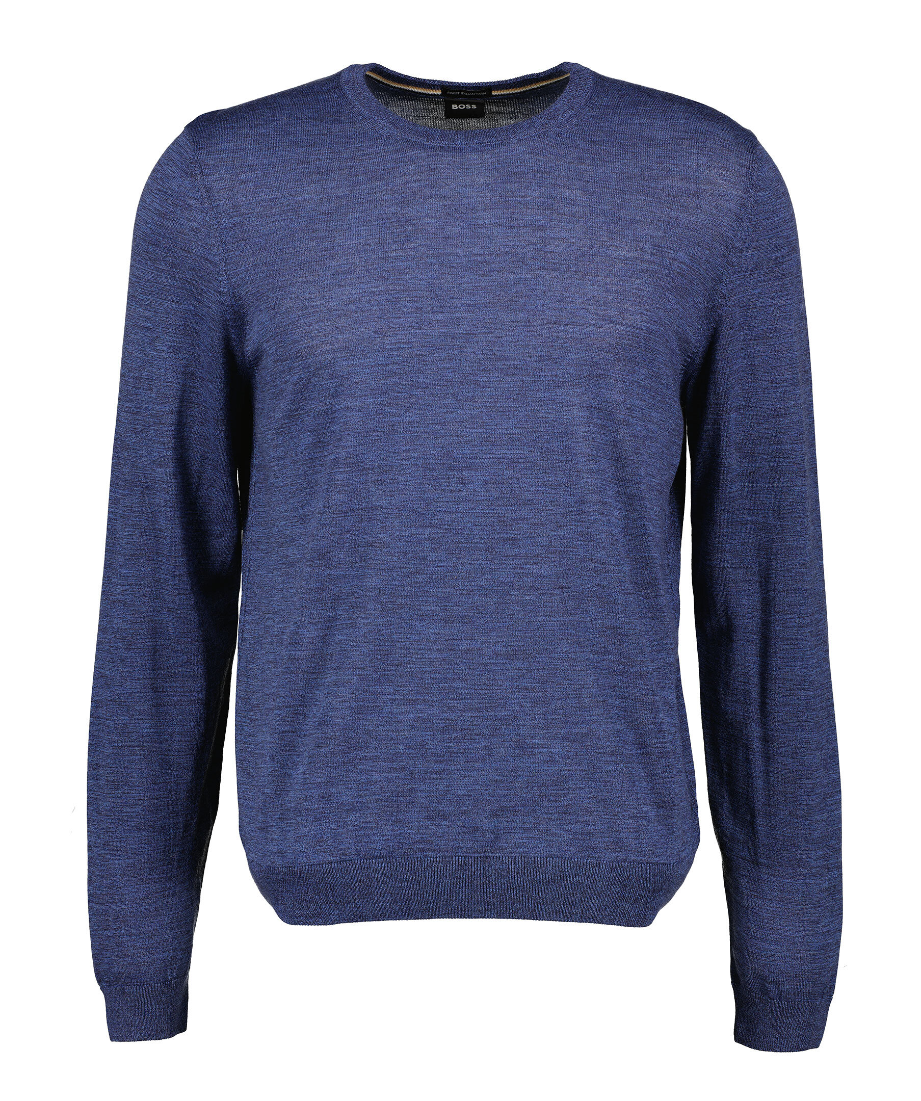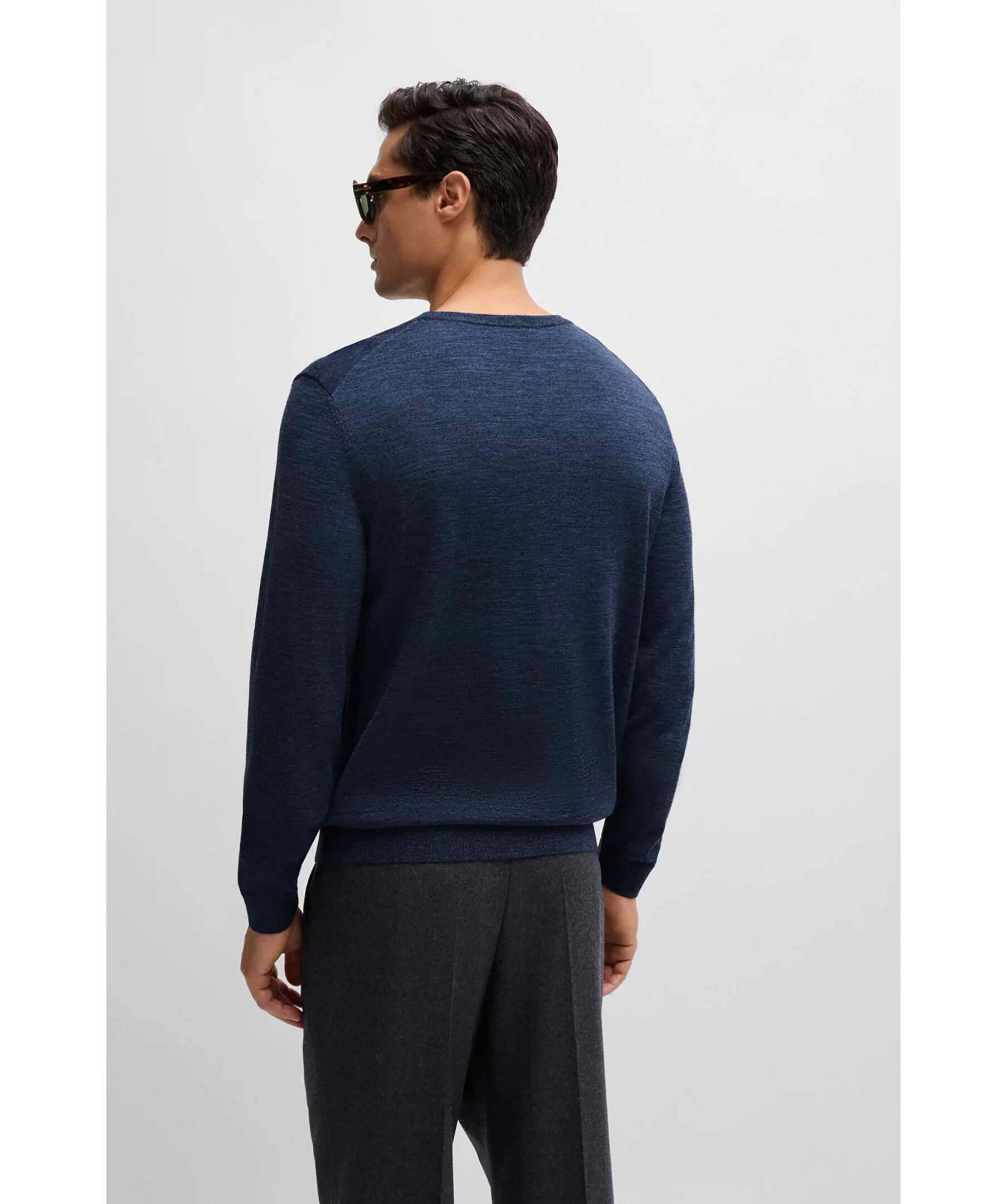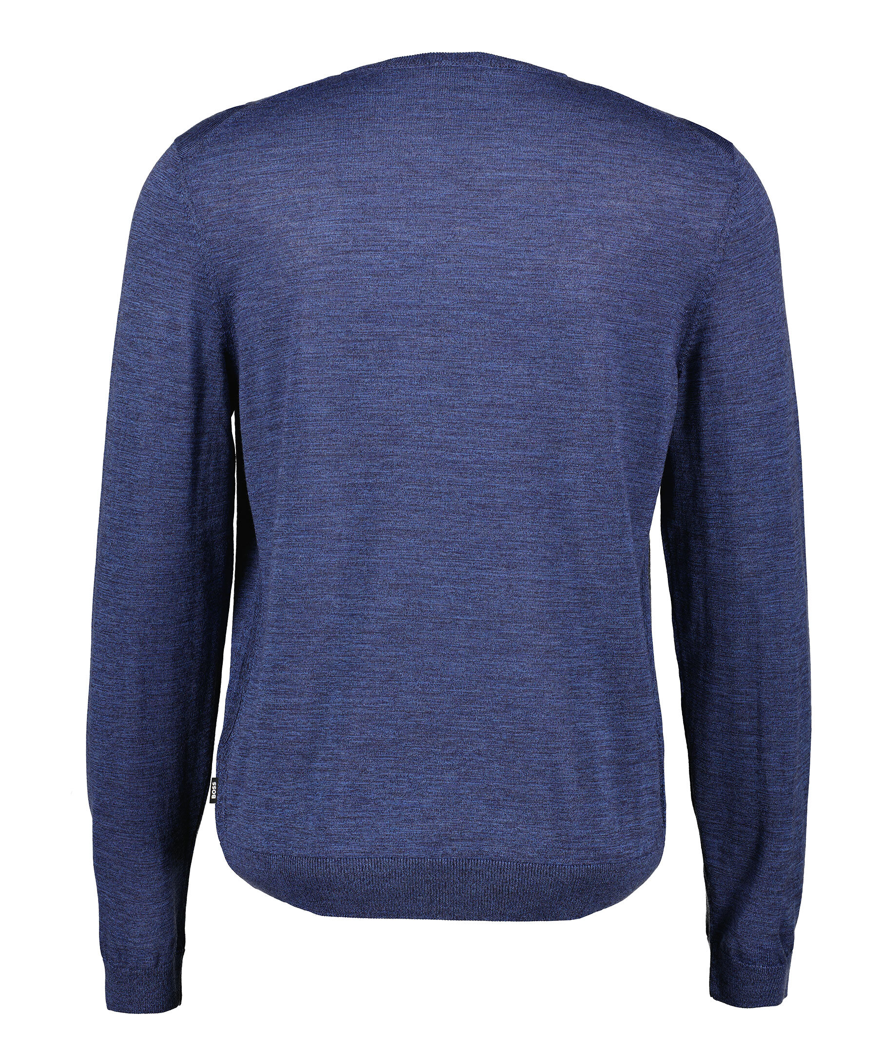 Blå finstickad tröja från BOSS Black. Slim-fit passform och gjord i fint ulltyg. Ribbade muddar. Modellen är en storlek M och är 186 cm lång med en, 92 cm byst, 76 cm midja och 87 cm höft.