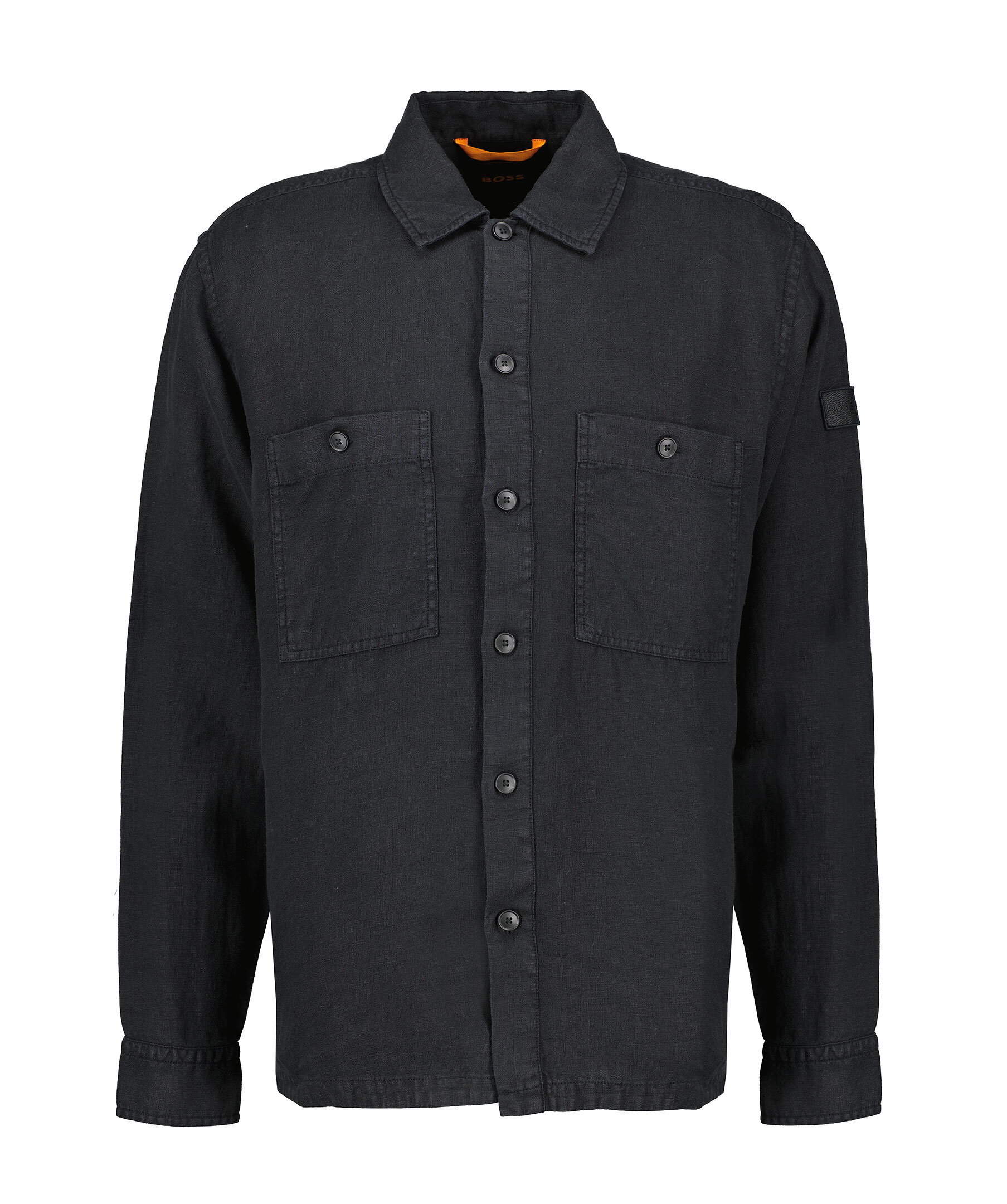 Svart overshirt från BOSS Orange. Overshirten stängs med knappar framtill och har två bröstfickor med knapp samt patch med logotyp på vänster ärm. Tillverkad i linne.