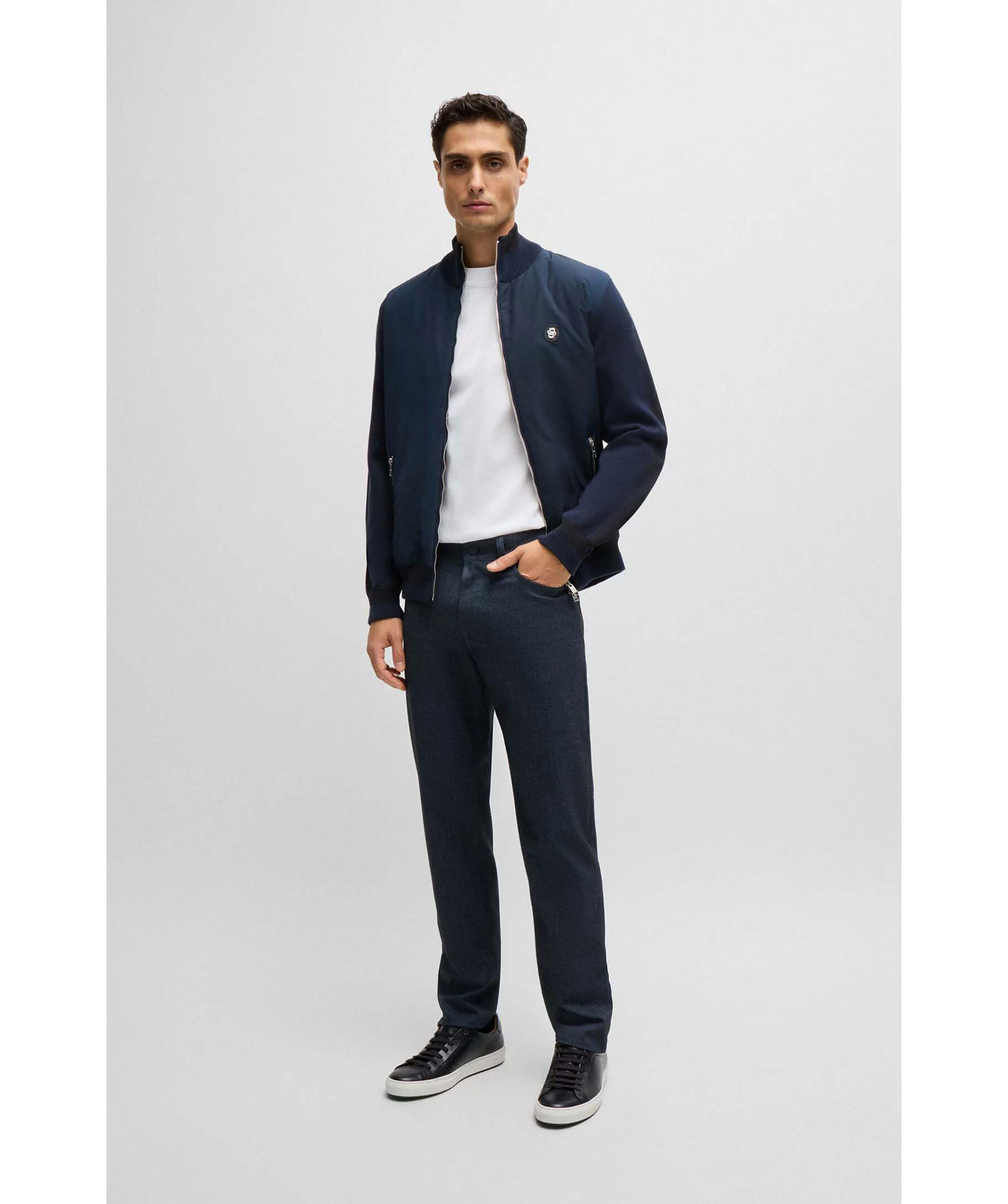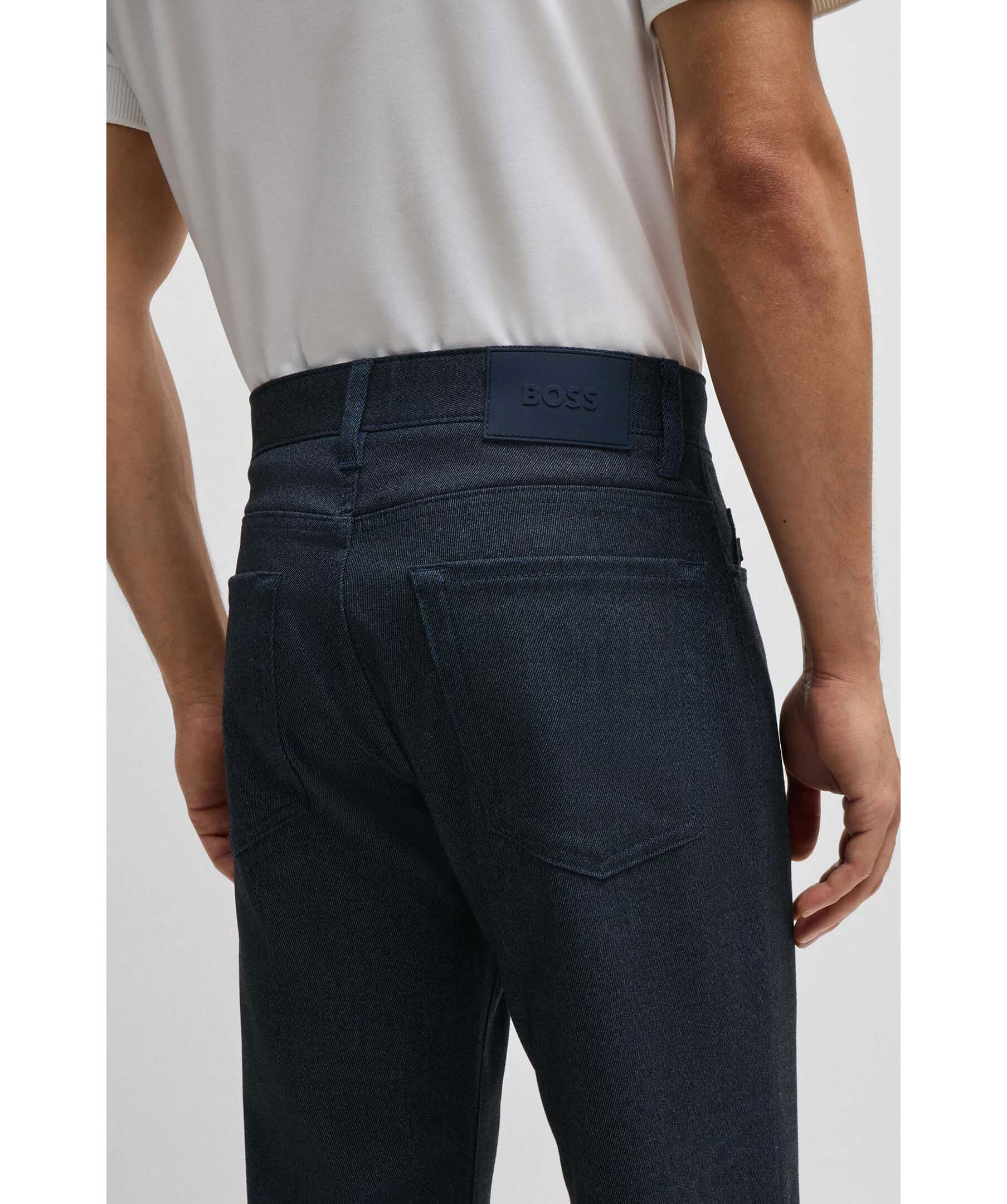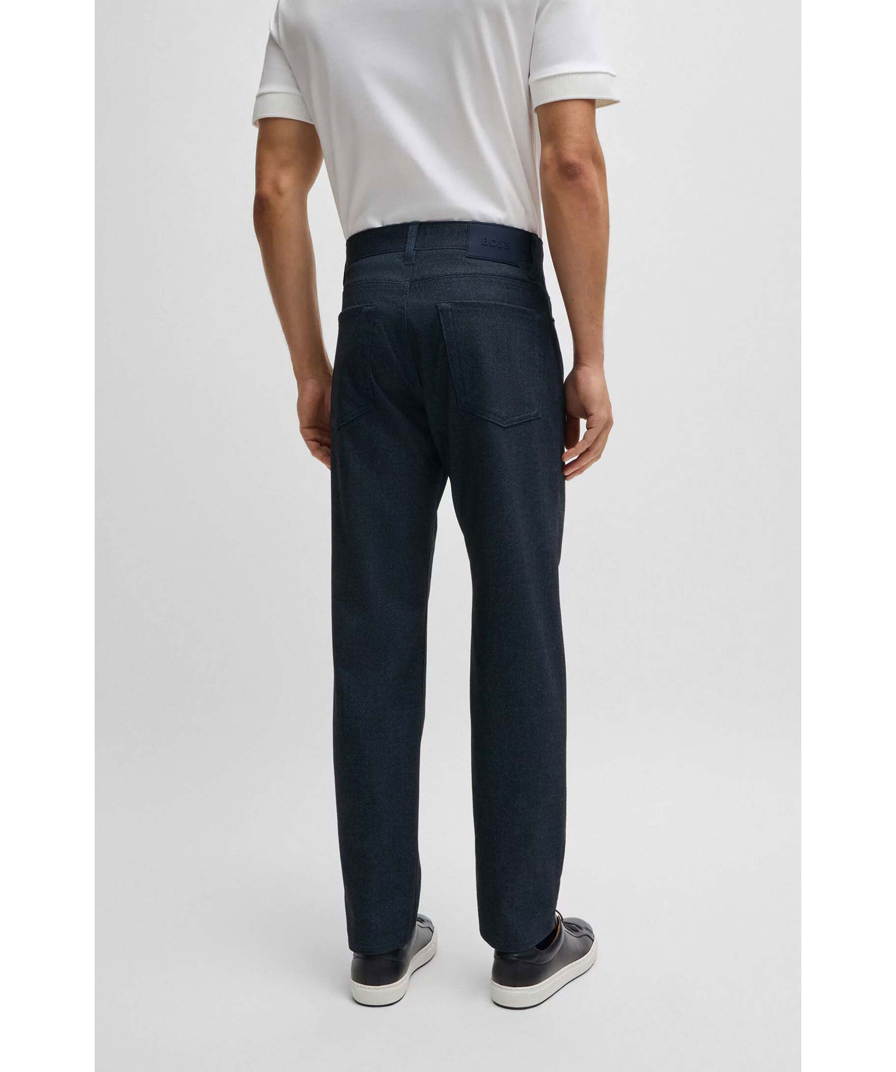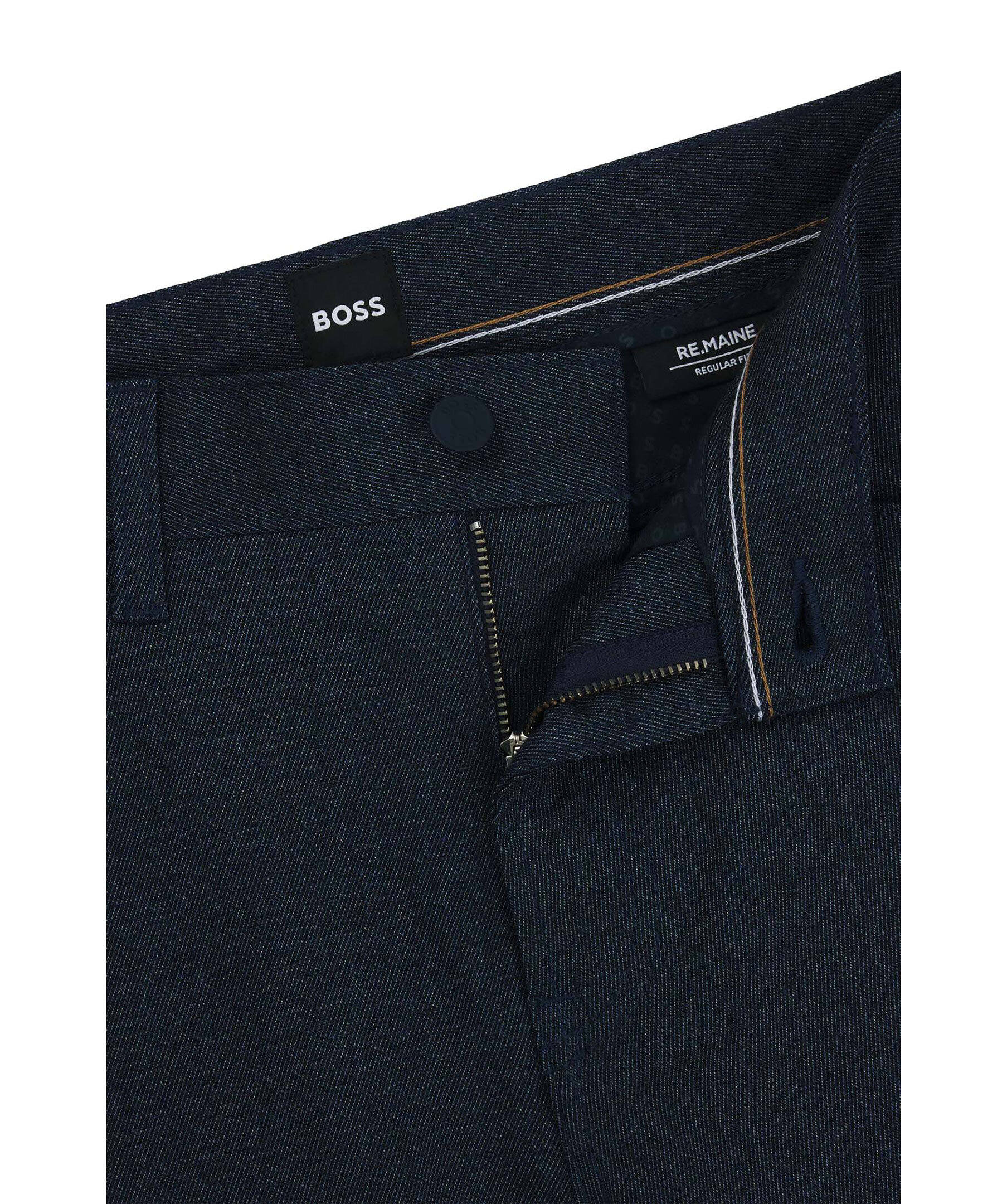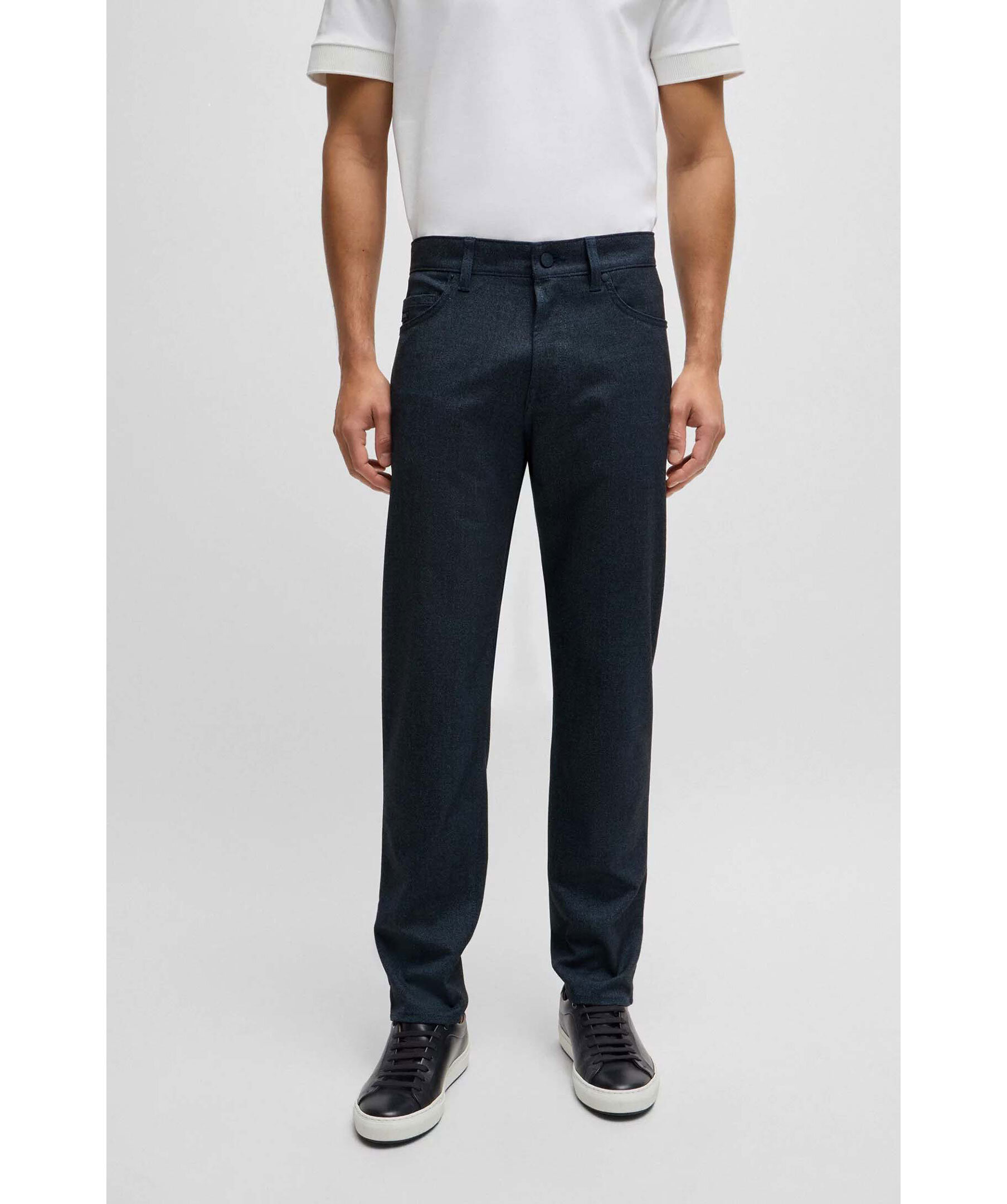 Blåa byxor från BOSS Black. Byxorna har fem fickor, bälteshällor i midjan och en mouliné-effekt. Tillverkade i en polyester- och viskosblandning.
