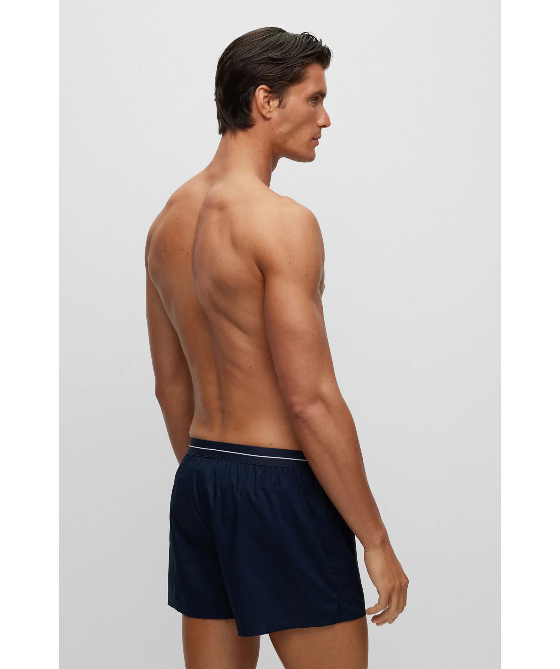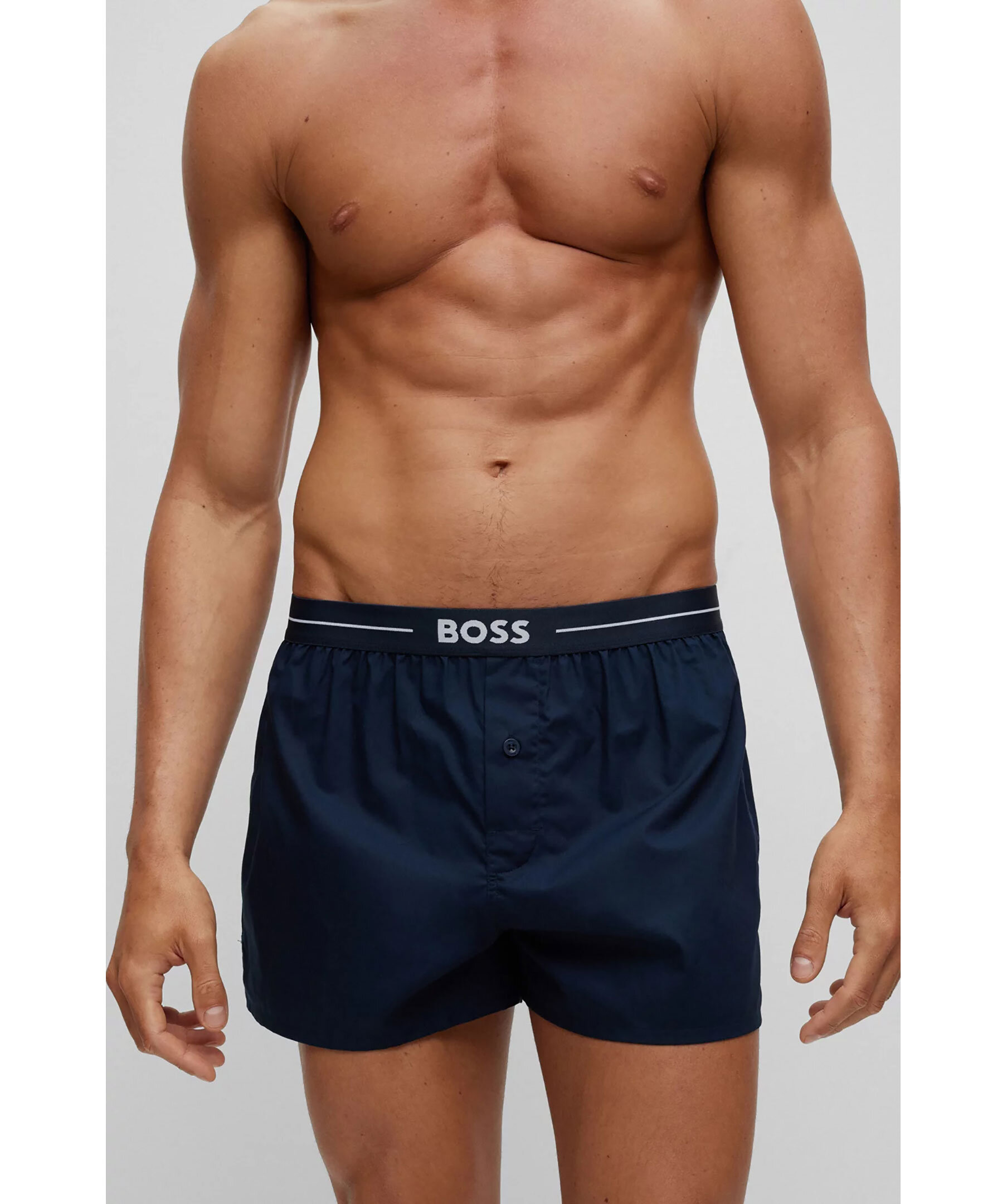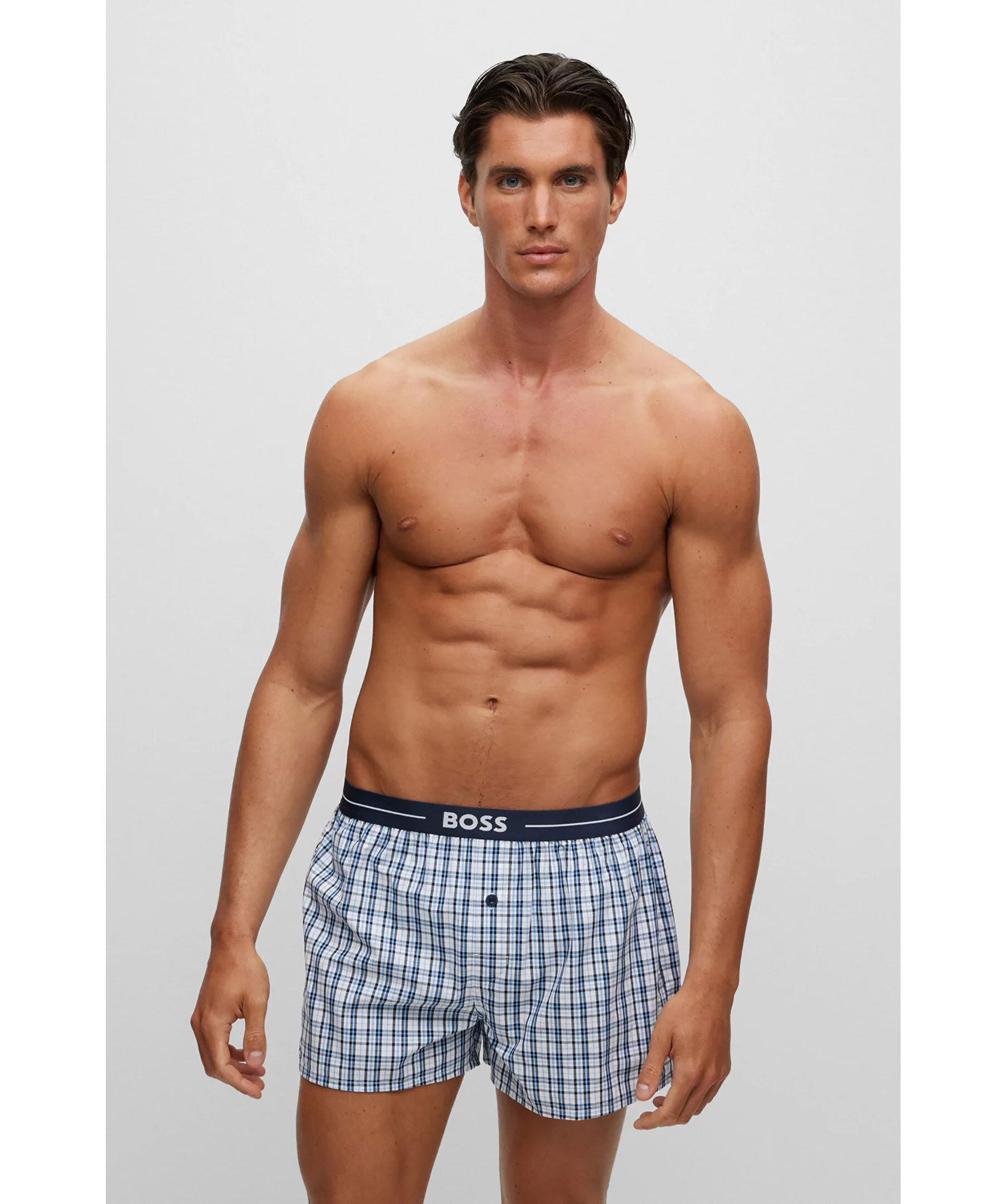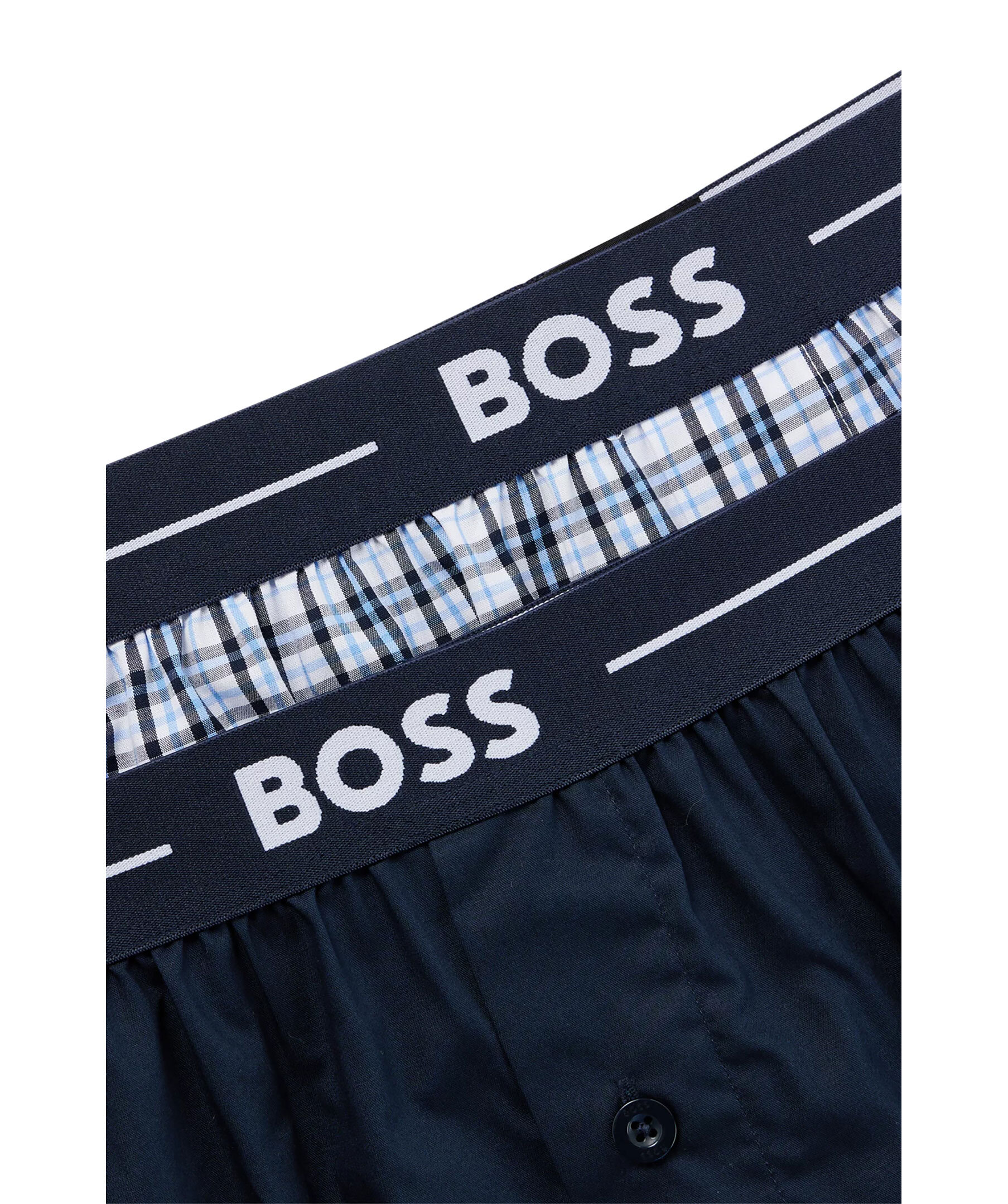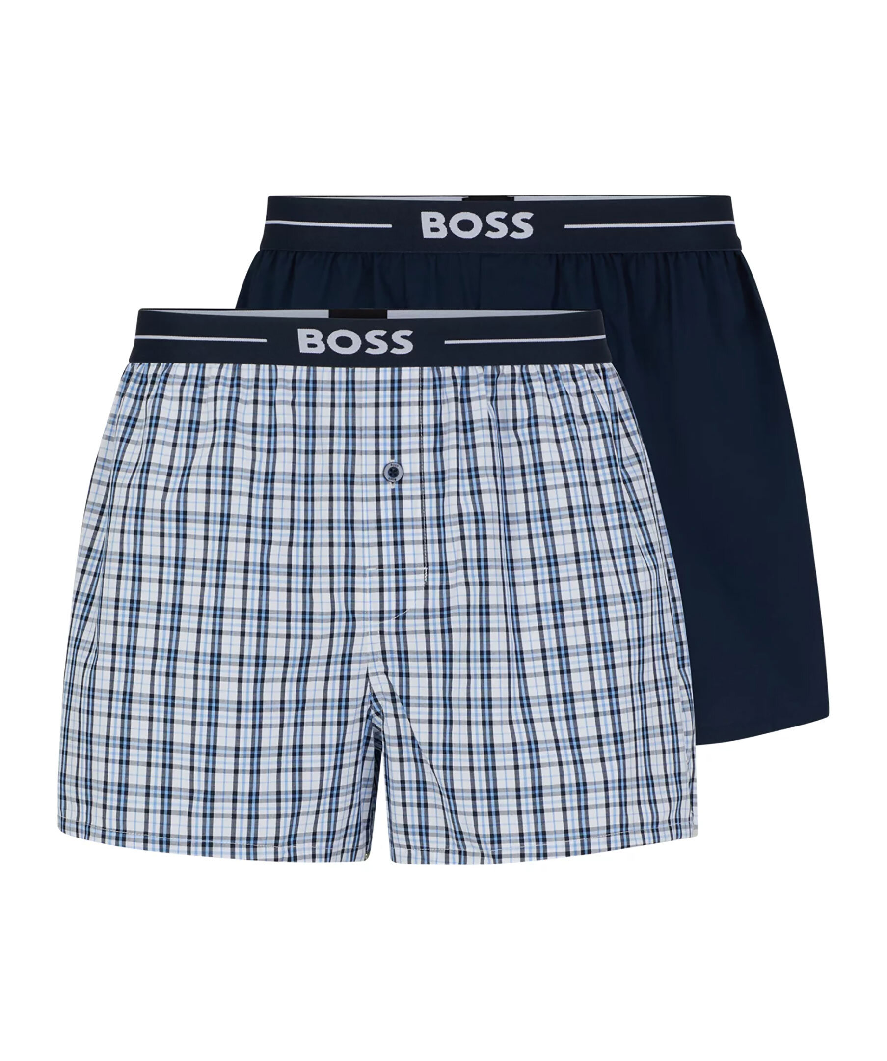 2-pack mörkblåa pyjamasshorts från BOSS, kommer i ett enfärgat par och ett rutigt. Shortsen har raka ben, synlig midjeresår med BOSS-märke och knäppgylf. Tillverkad i bomull.