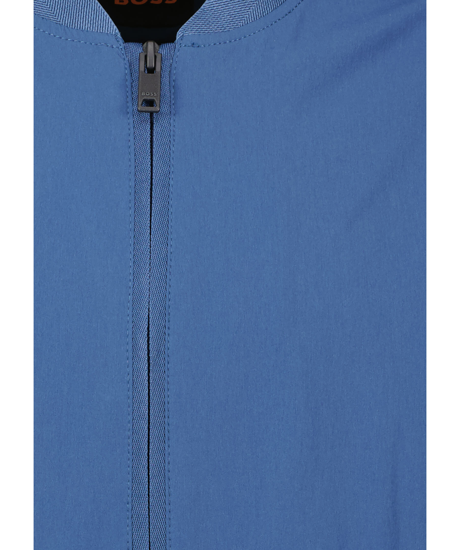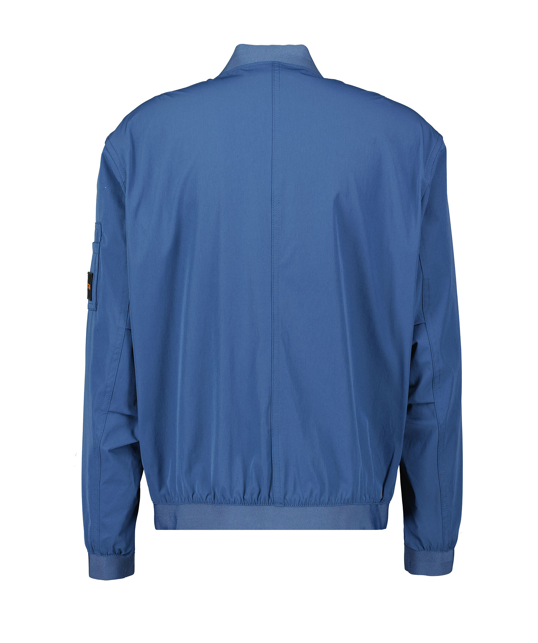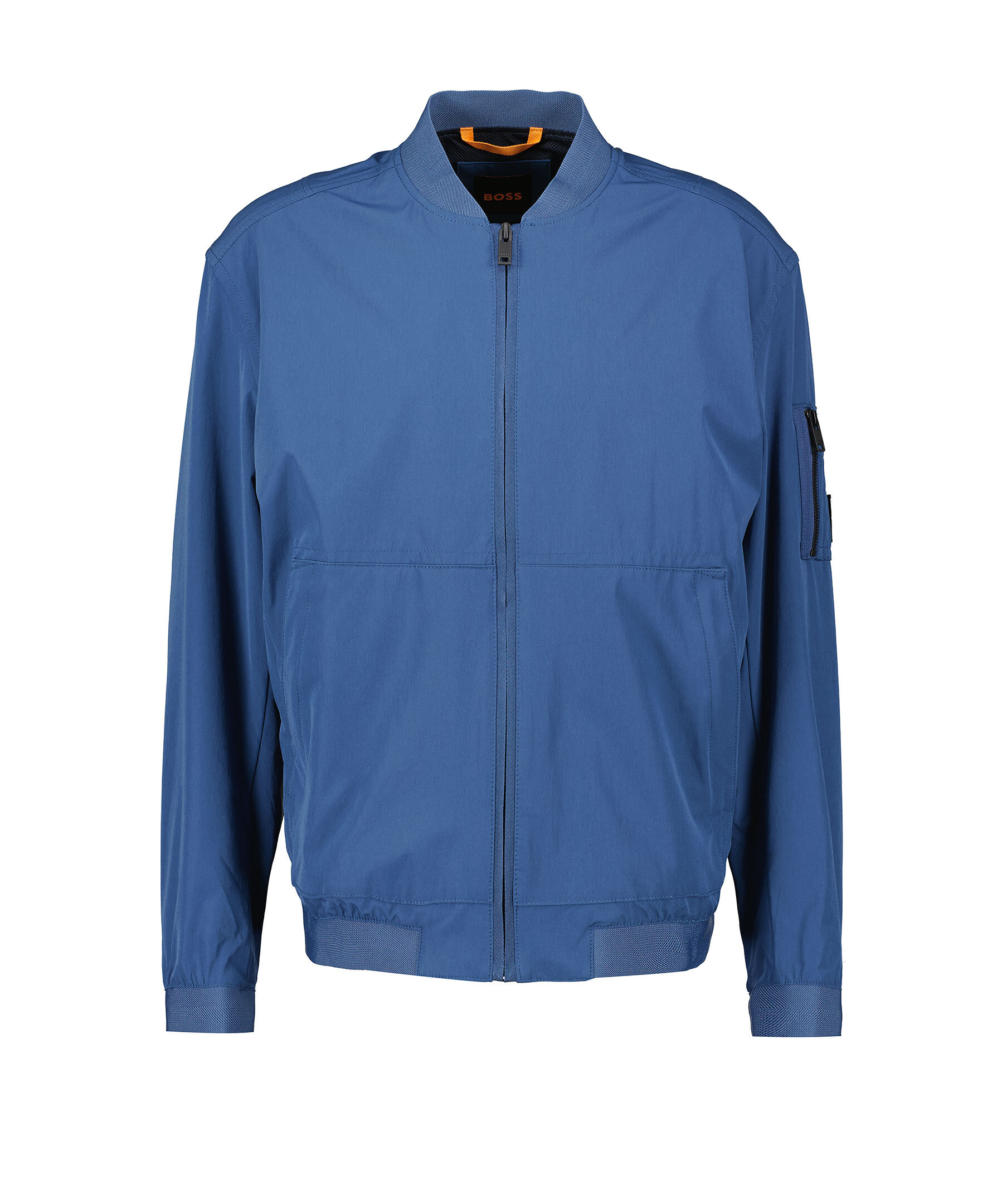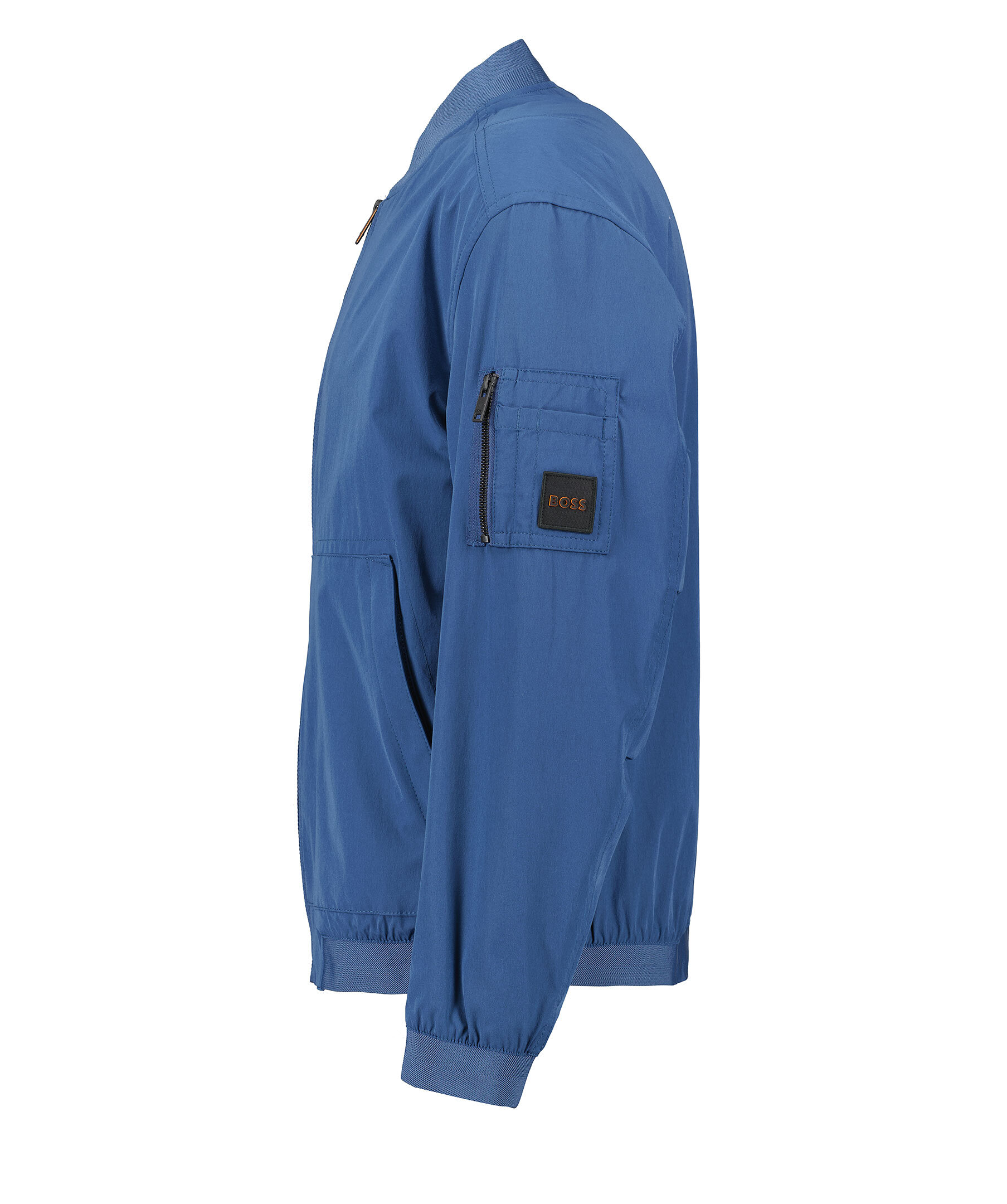 Blå jacka från Boss Orange. Jackan har en bomberstil med elastiska detaljer i krage, tröj- och ärmslut. Dubbelficka på högerärm, en öppen ficka på fickan med dragkedja, fickan har även en pacth med logotyp. Innerficka med knapp och framfickor med dragkedja. Tillverkad av en polyesterblandning.