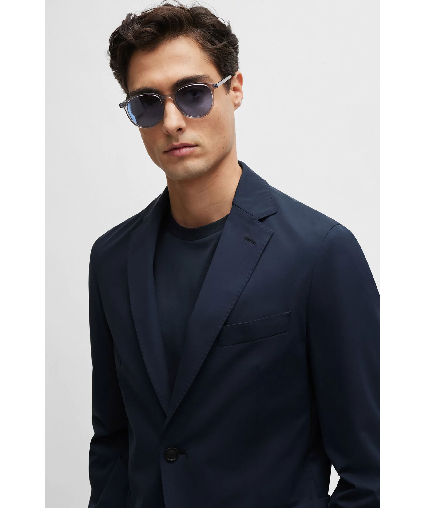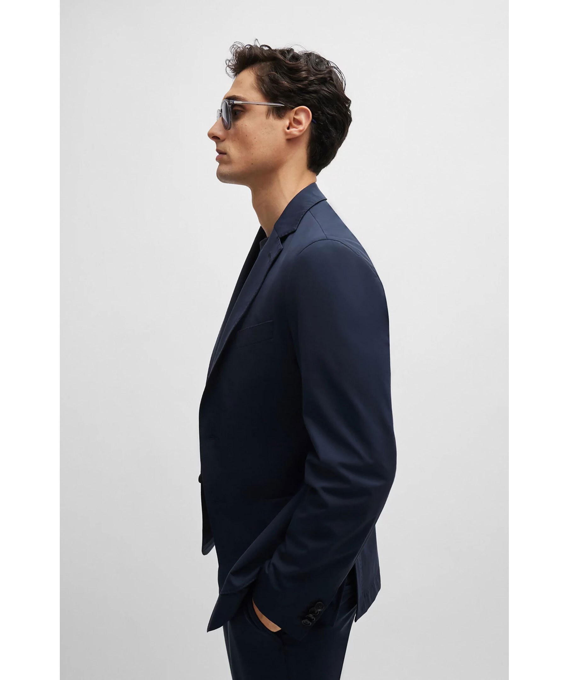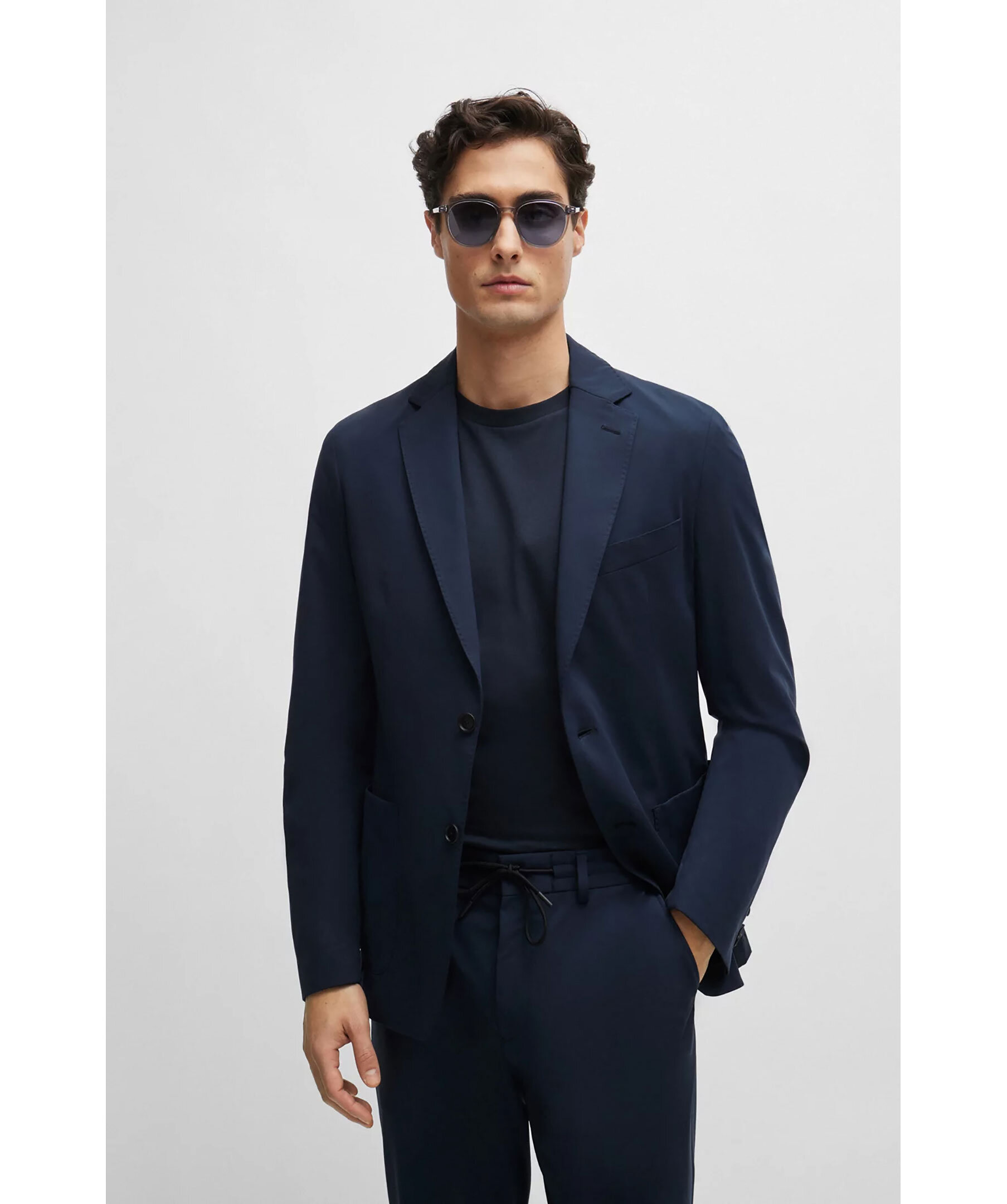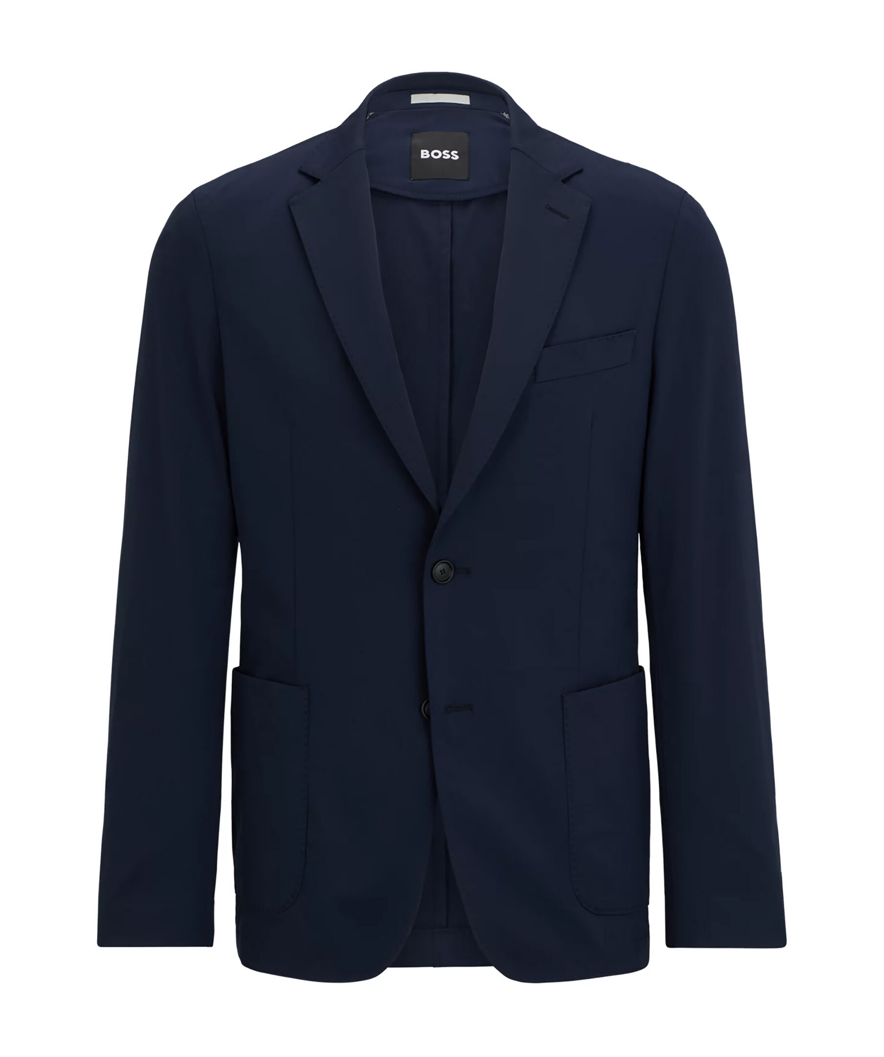 Mörkblå kavaj från BOSS. Kavajen är ofodrad och enkelknäppt och har trubbiga kavajslag, två midjefickor samt en bröstficka. Tillverkad i en polyamidblandning.