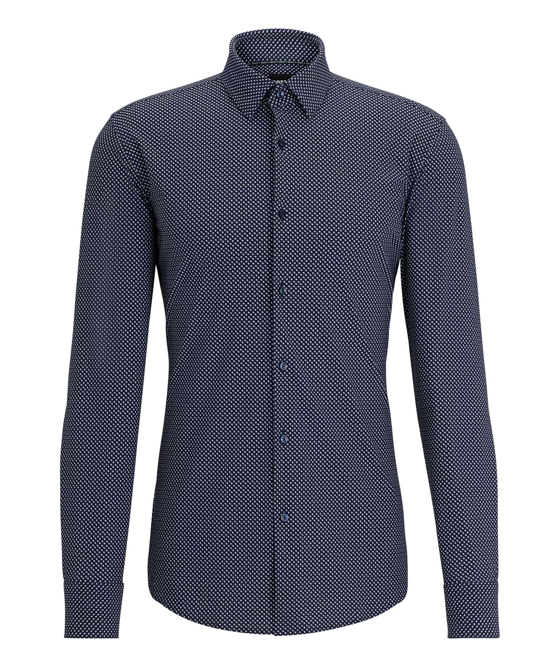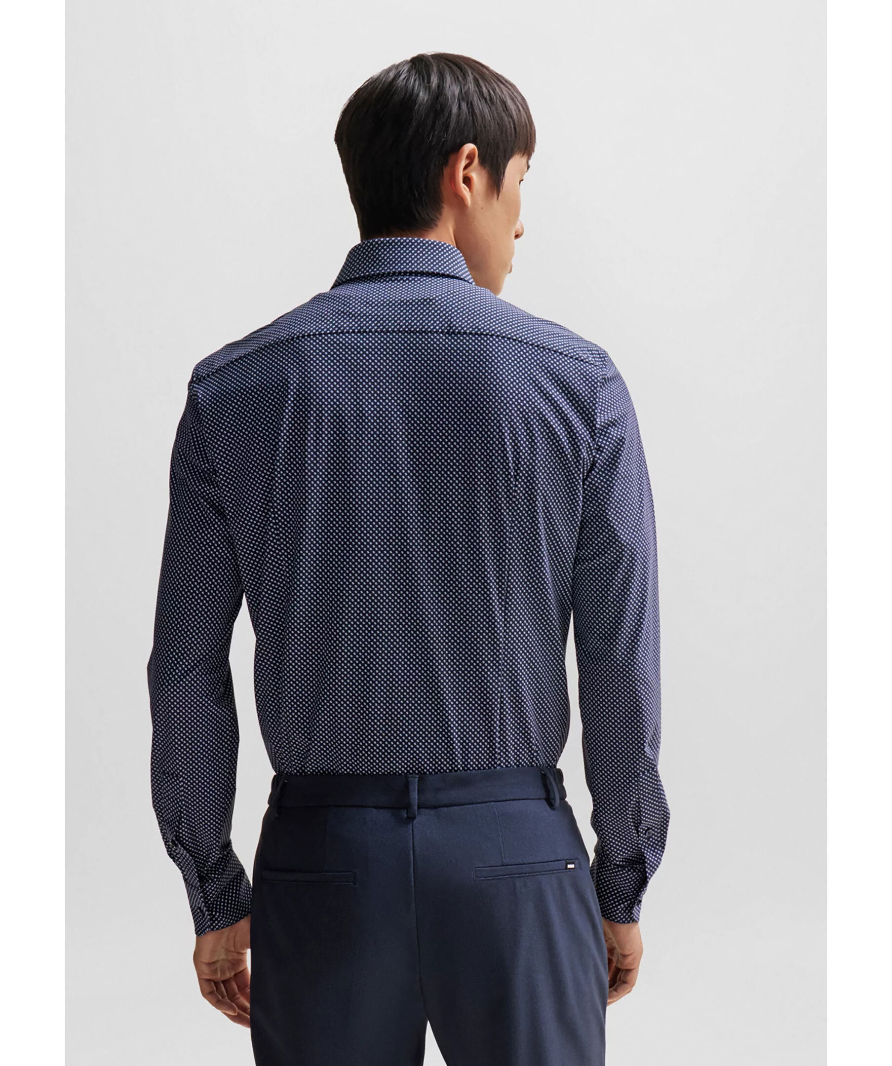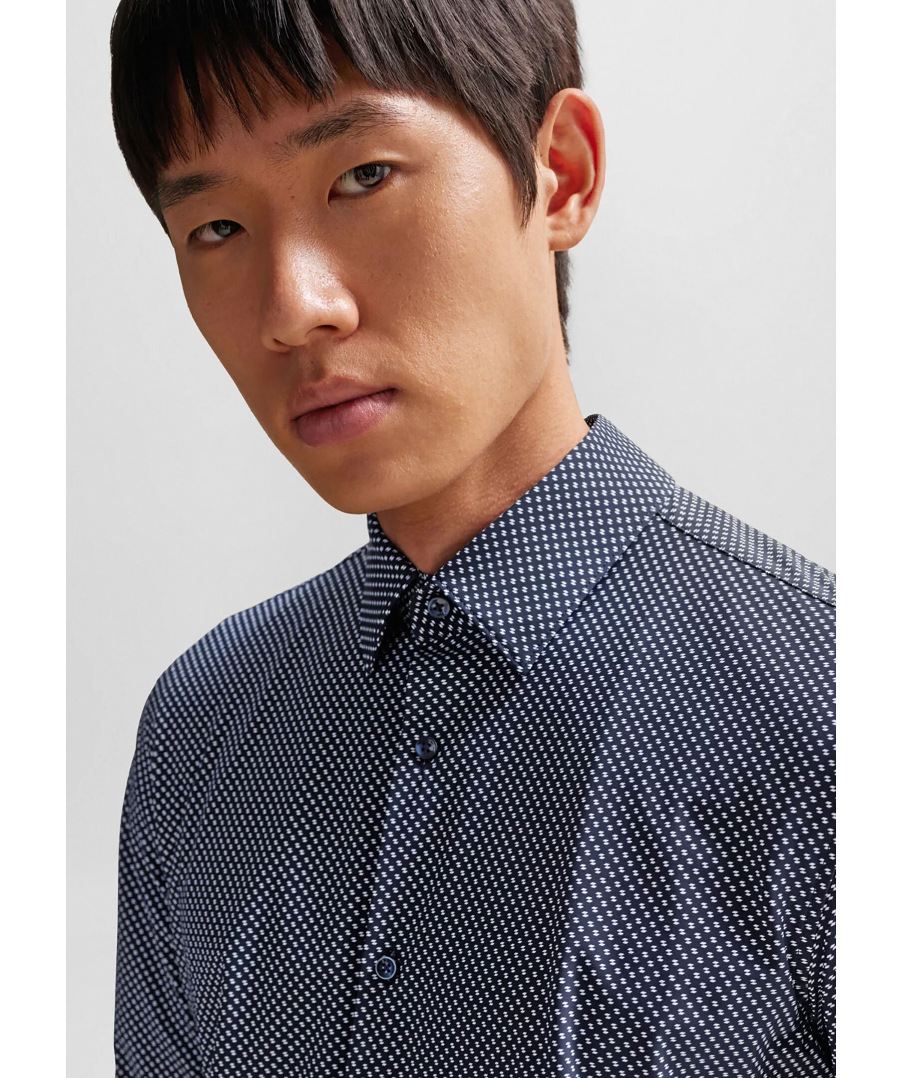 Mörkblå, mönstrad skjorta från BOSS Black. En långärmad businesskjorta i defined fit. Tillverkad av performance stretch-material med ett modernt tryck. Kent-krage.