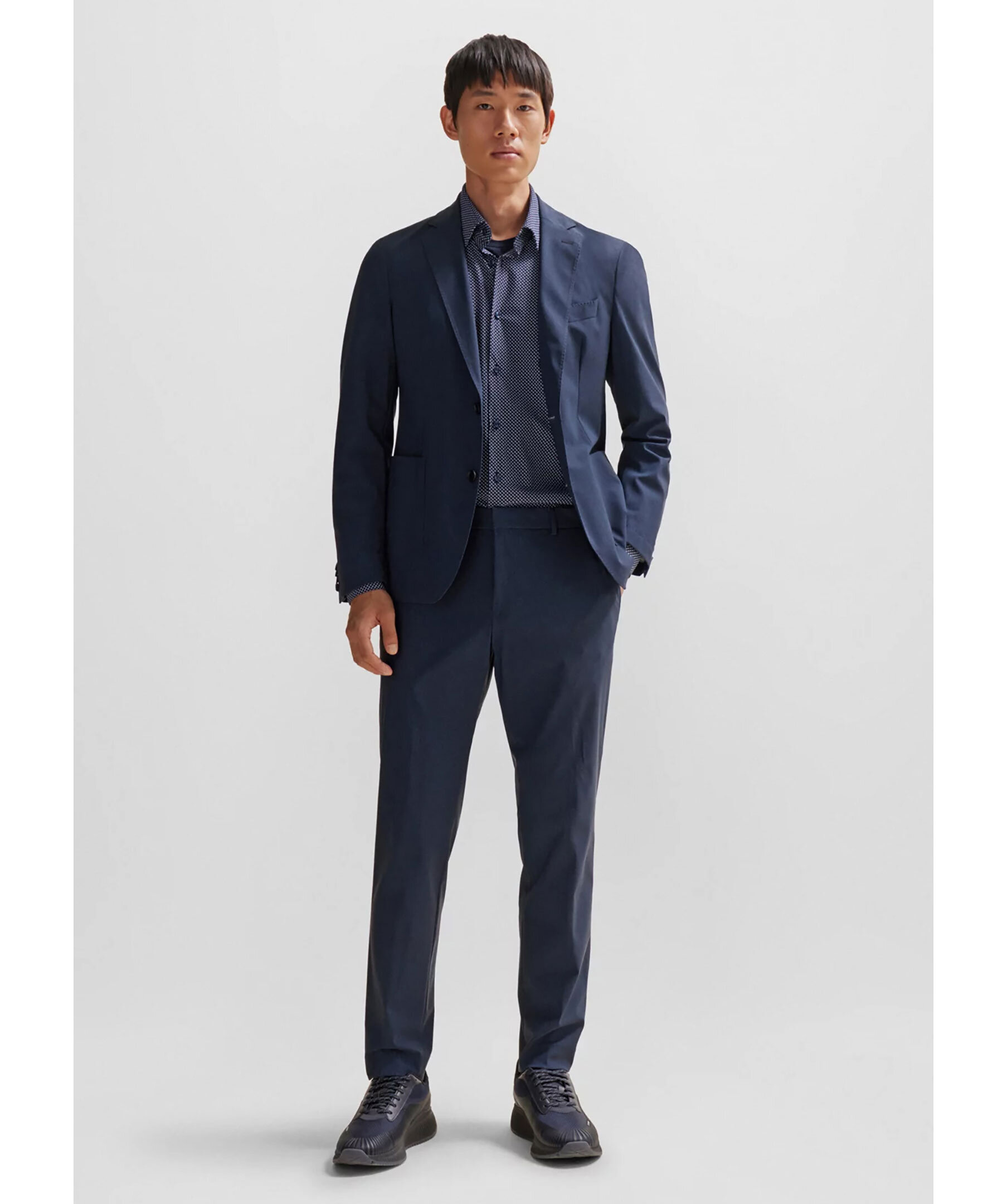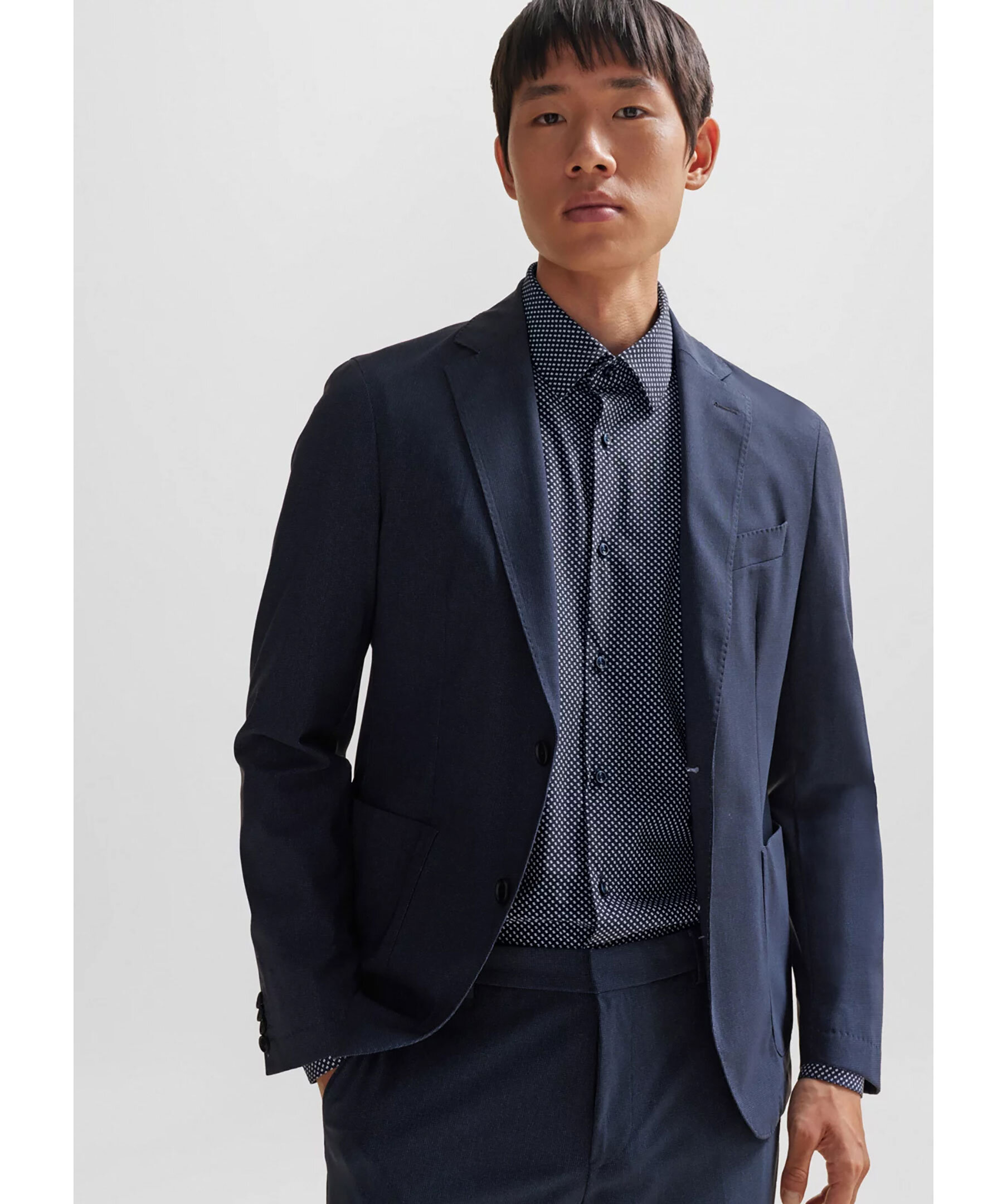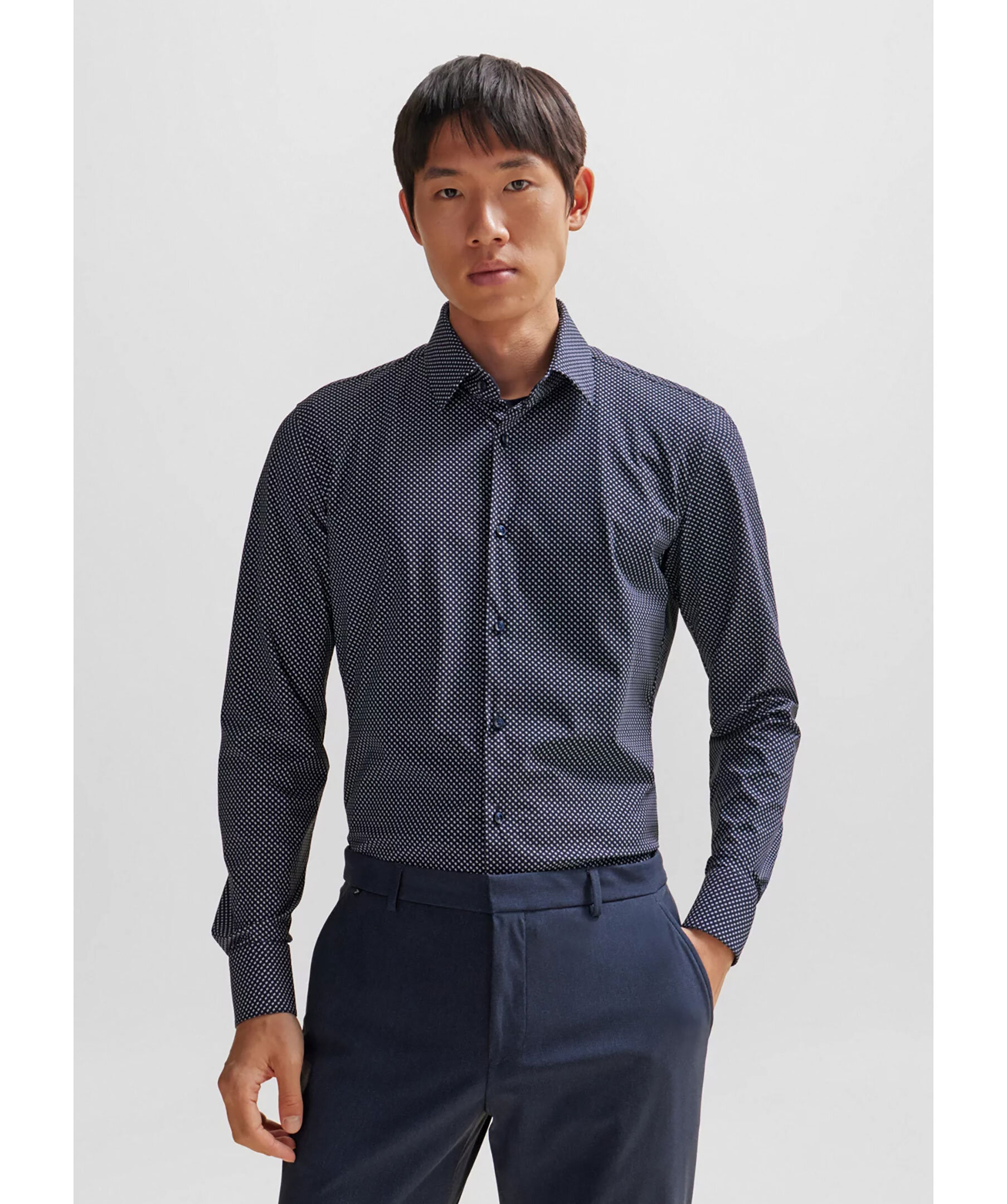 Mörkblå, mönstrad skjorta från BOSS Black. En långärmad businesskjorta i defined fit. Tillverkad av performance stretch-material med ett modernt tryck. Kent-krage.