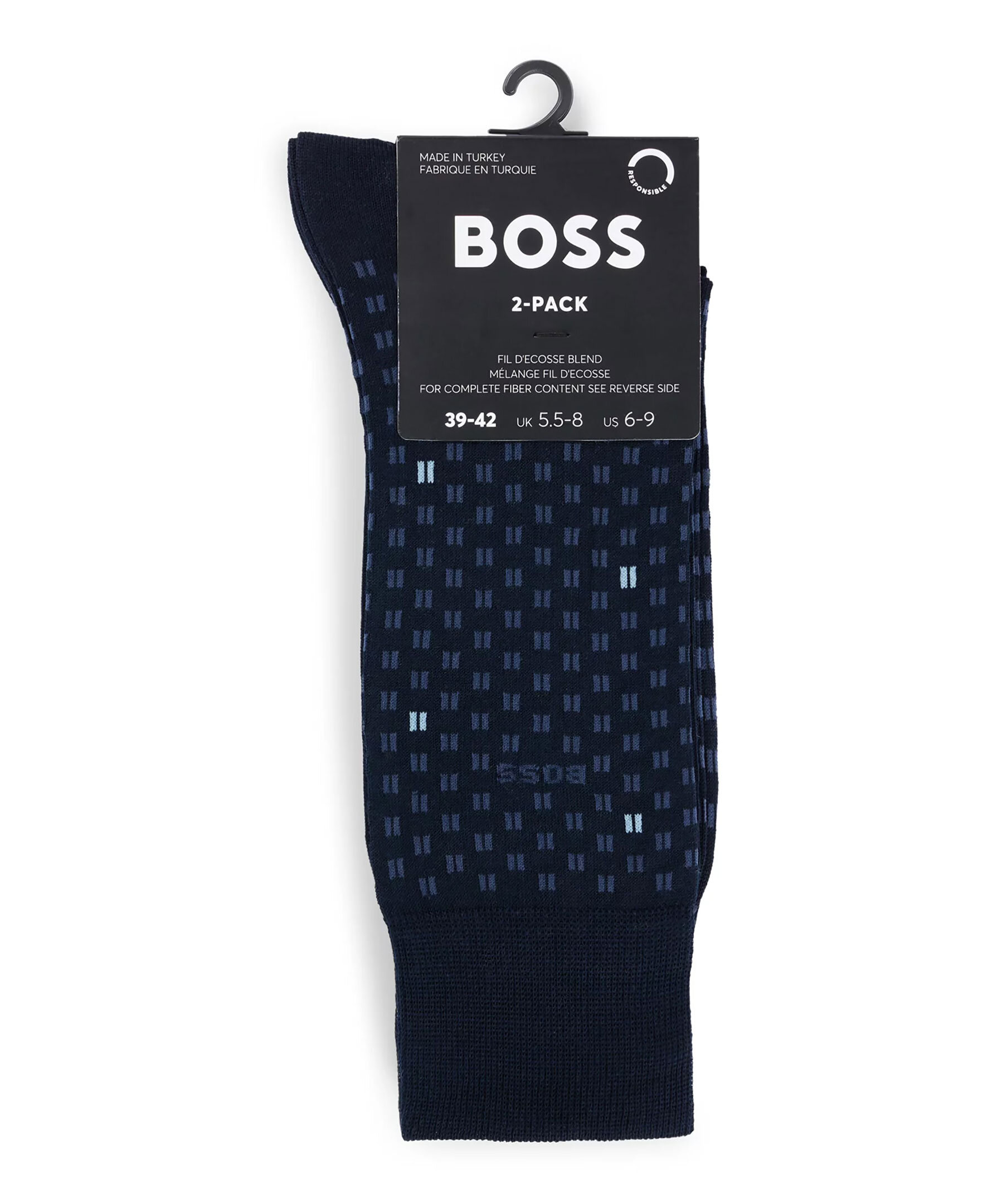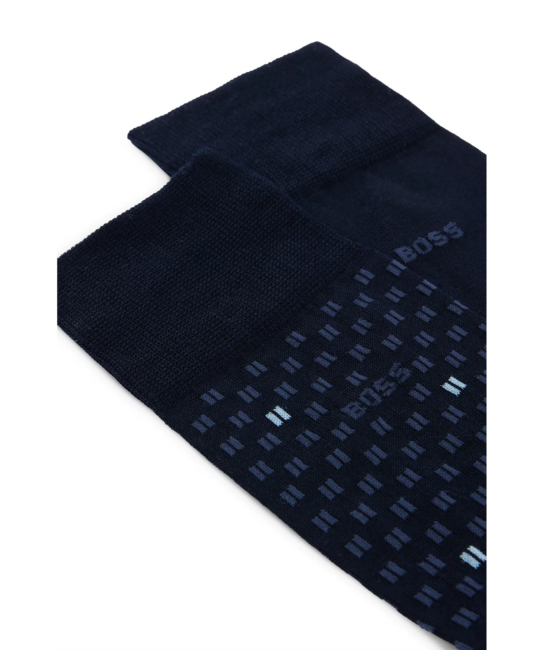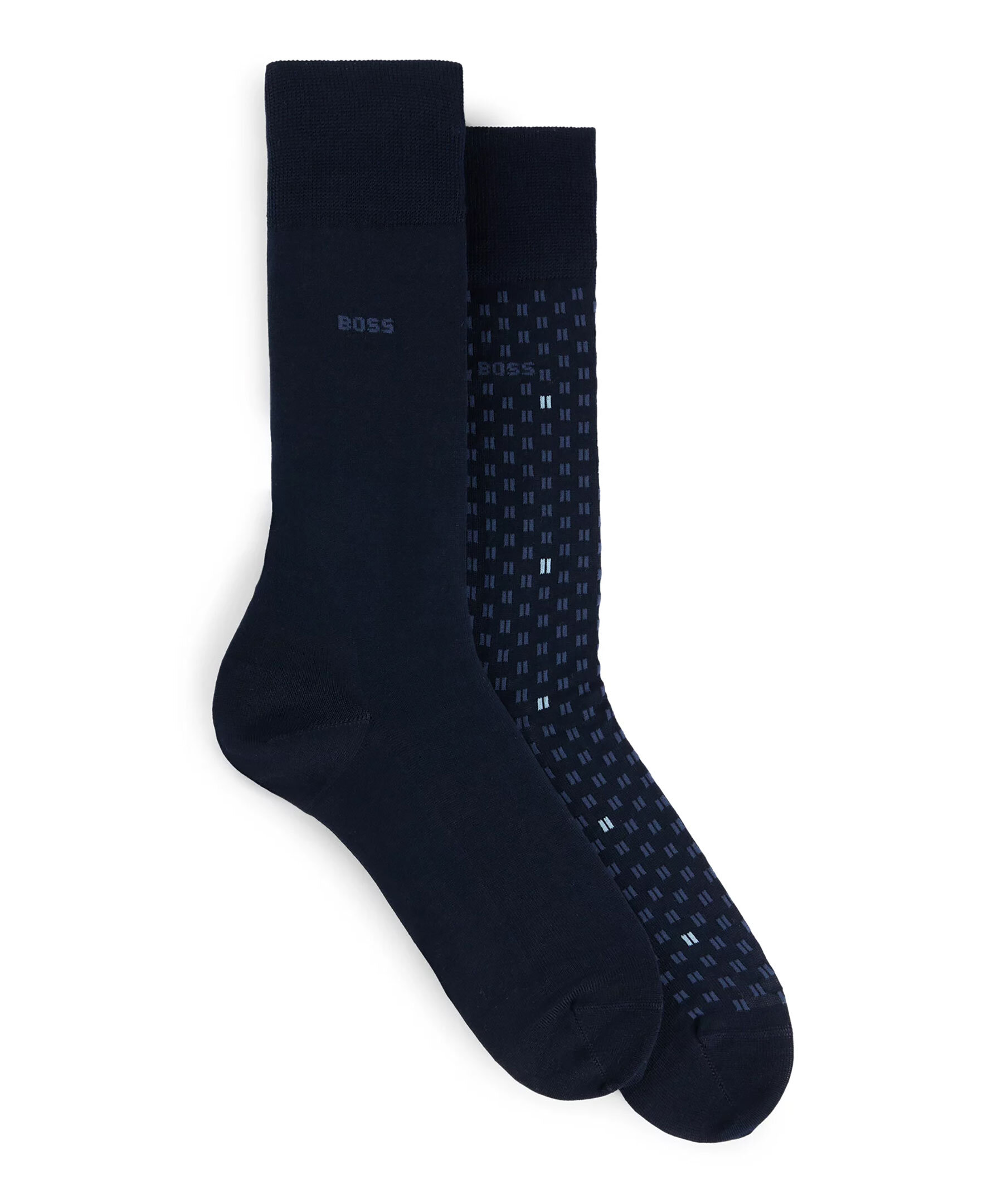 2-pack mörkblåa strumpor från BOSS, ett enfärgat par och ett par mikromönstrade. Tillverkade i en bomullsblandning.