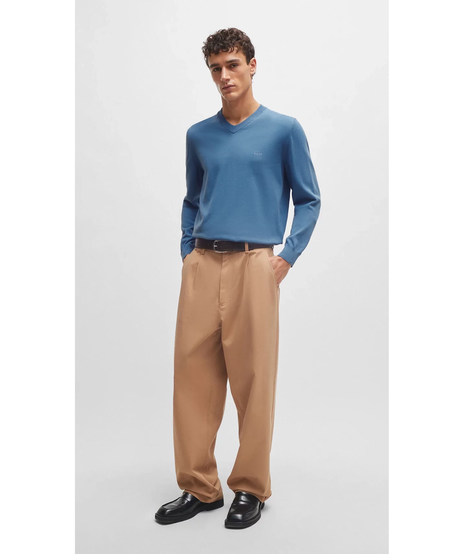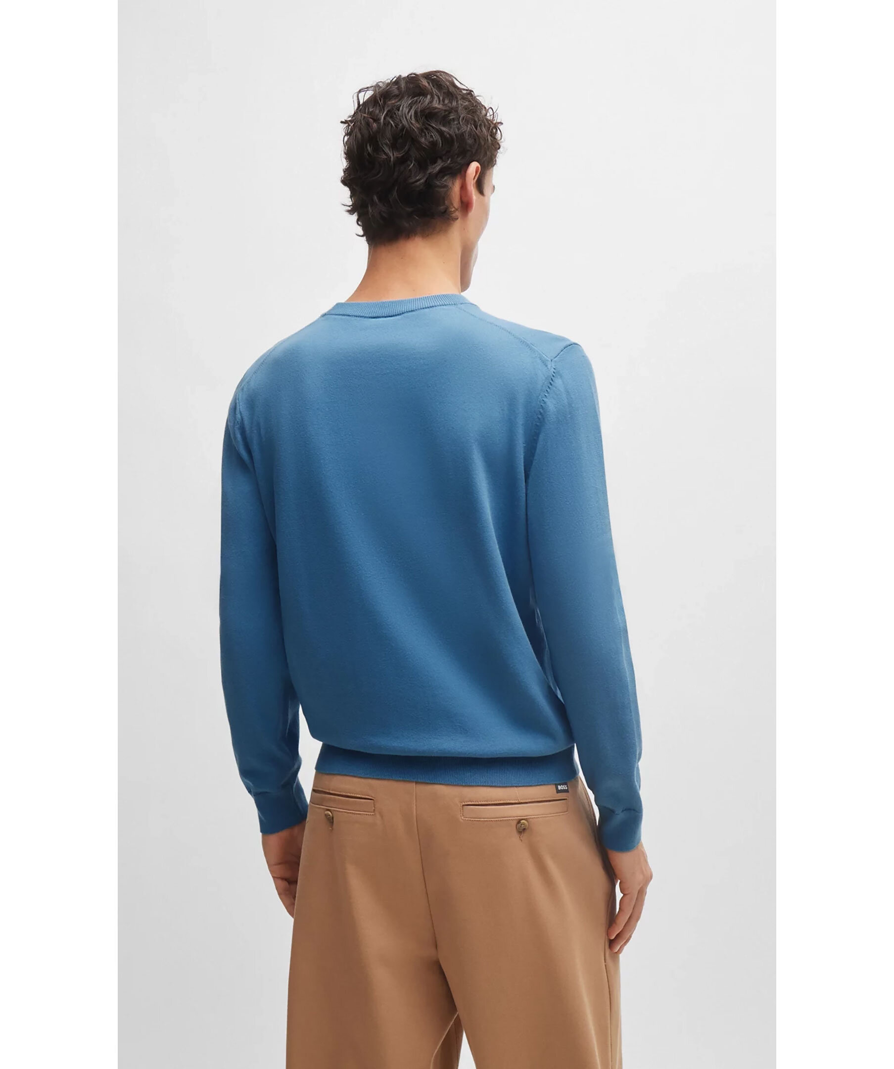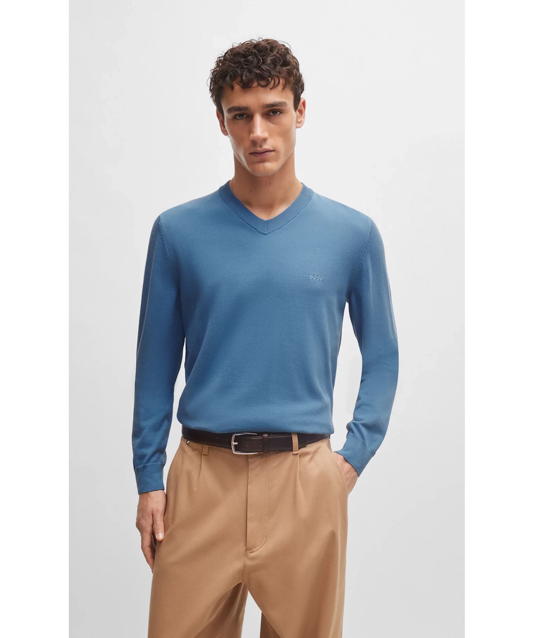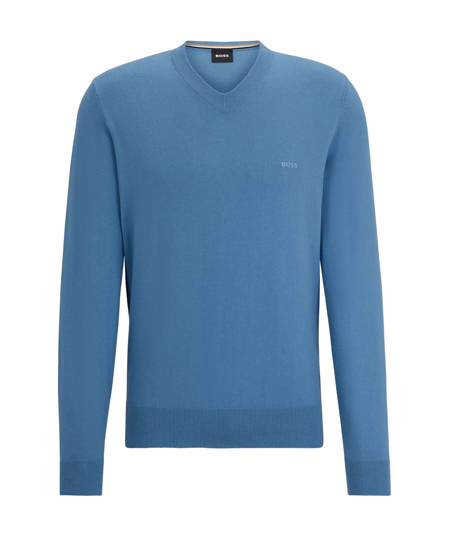 Ljusblå finstickad tröja från BOSS Black. V-ringad med ribbstickad ringning. Ribbstickade ärm- och plaggslut. Broderad logotyp på vänster bröst. Tillverkad i 100% Bomull.
