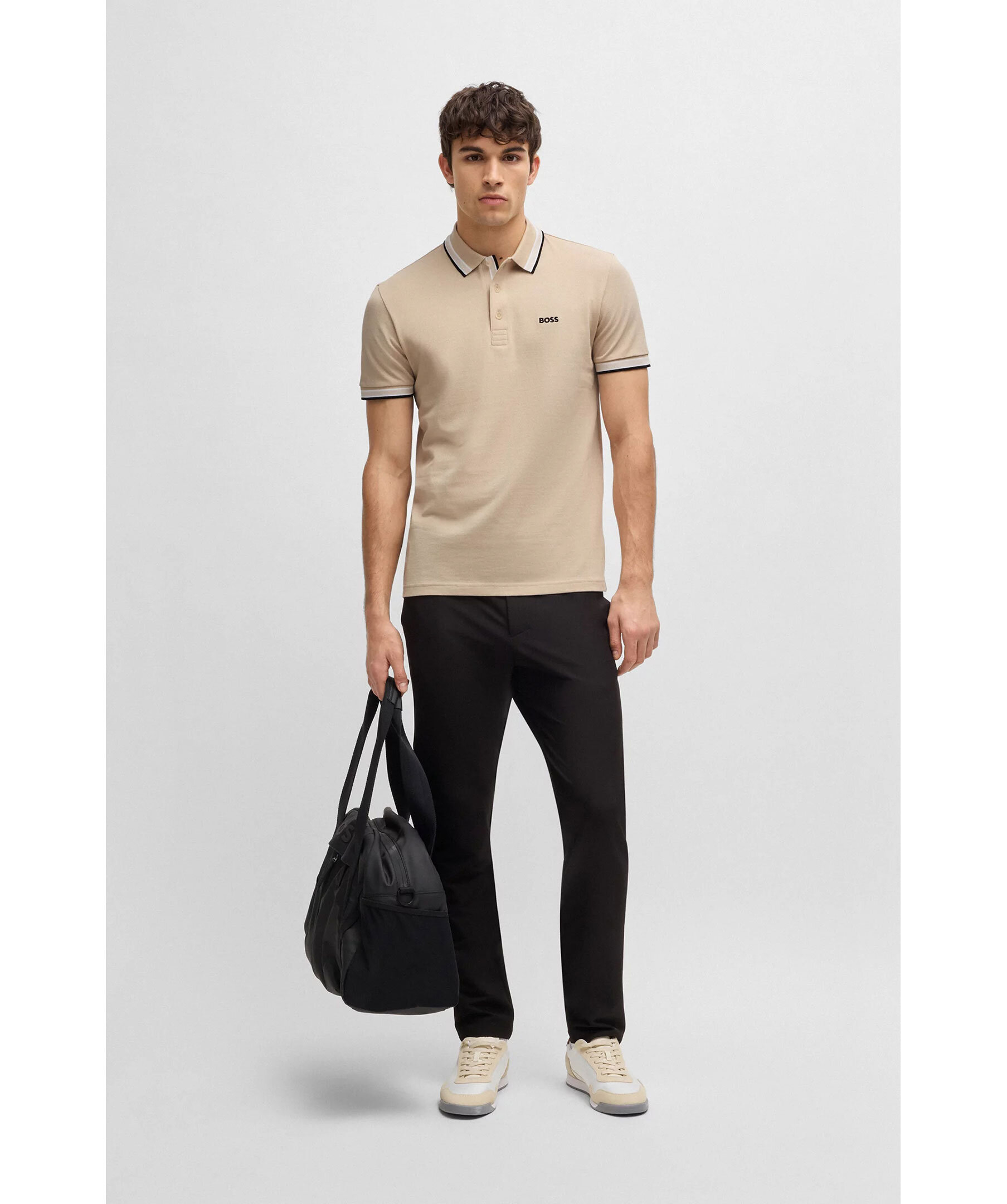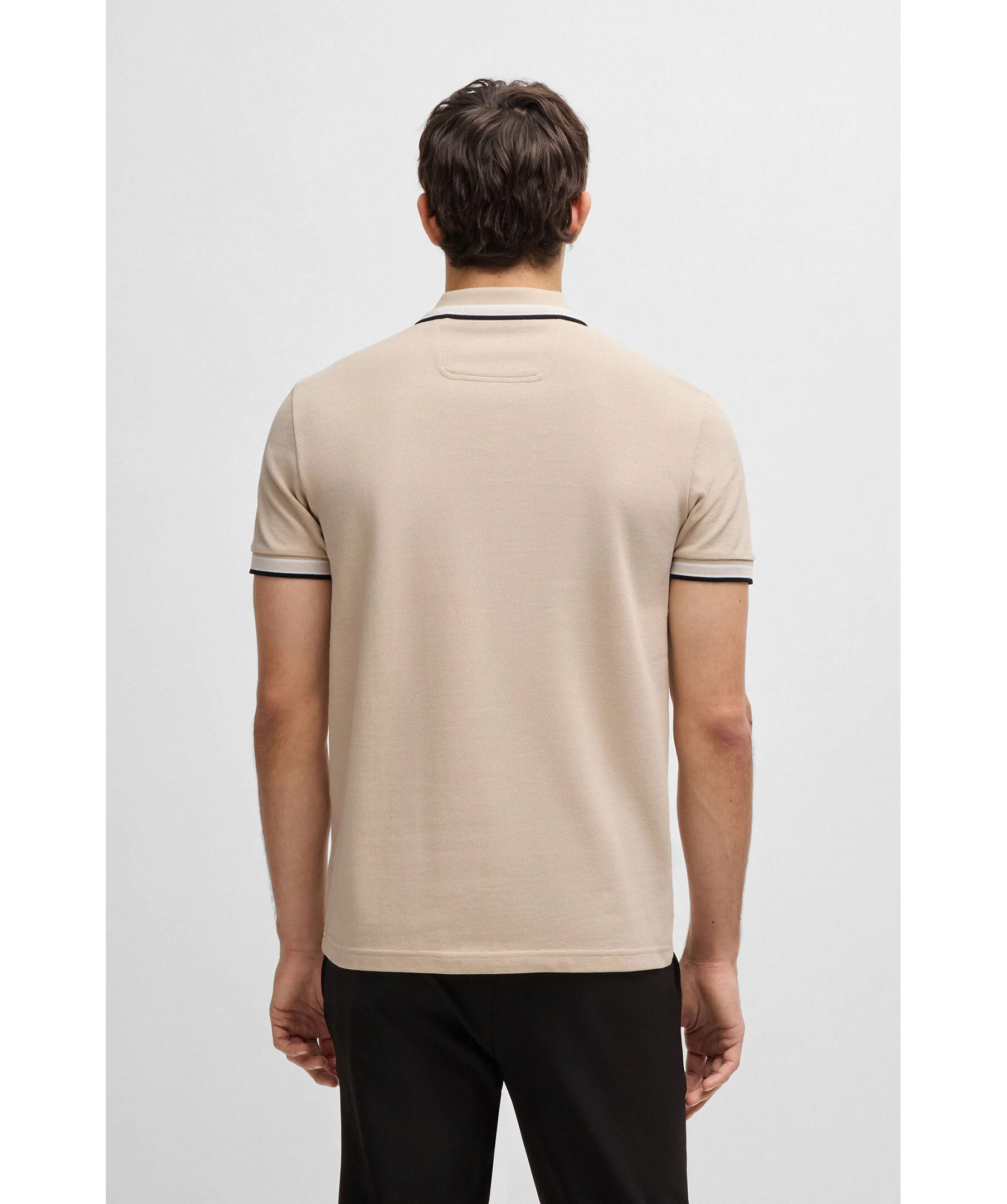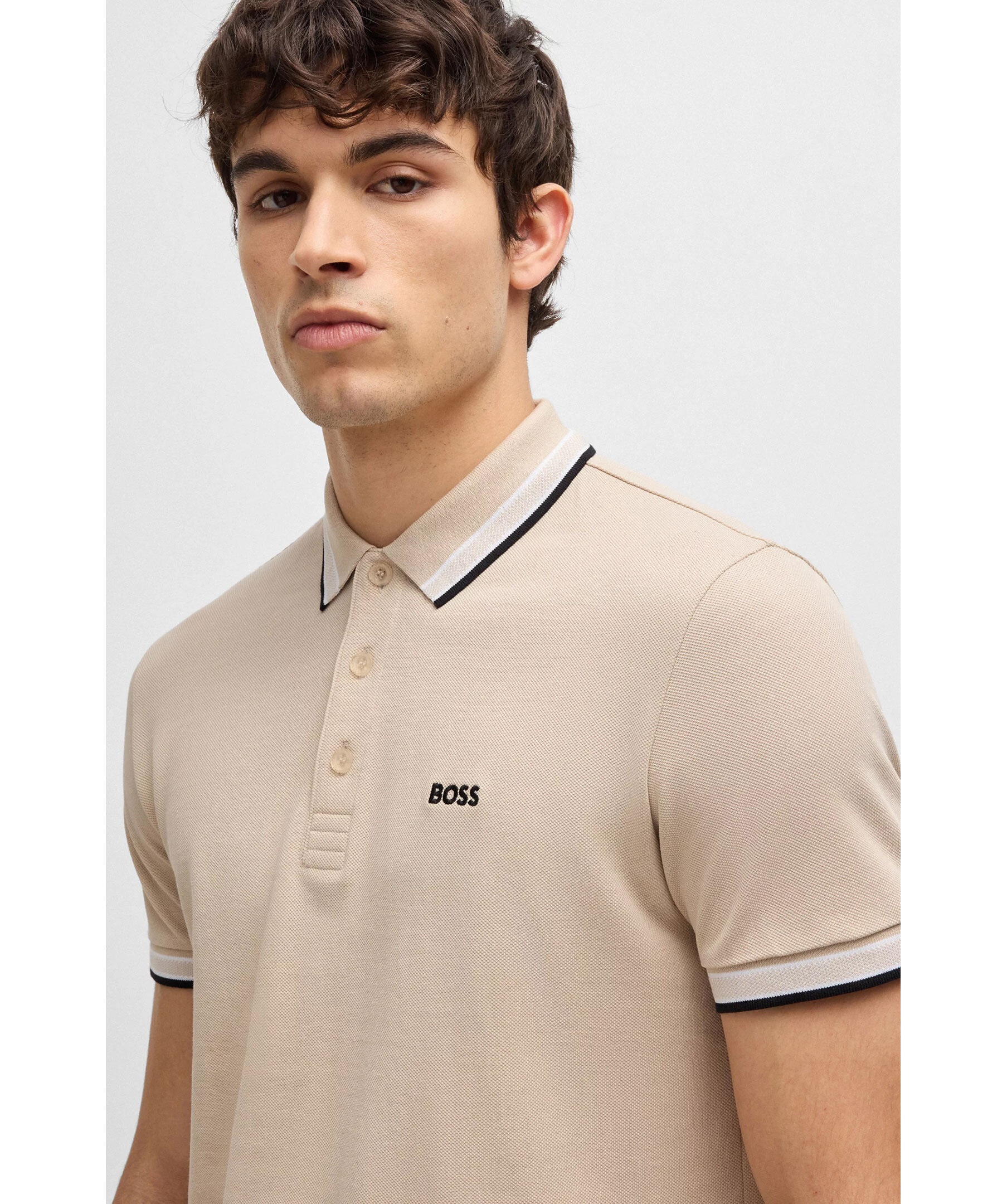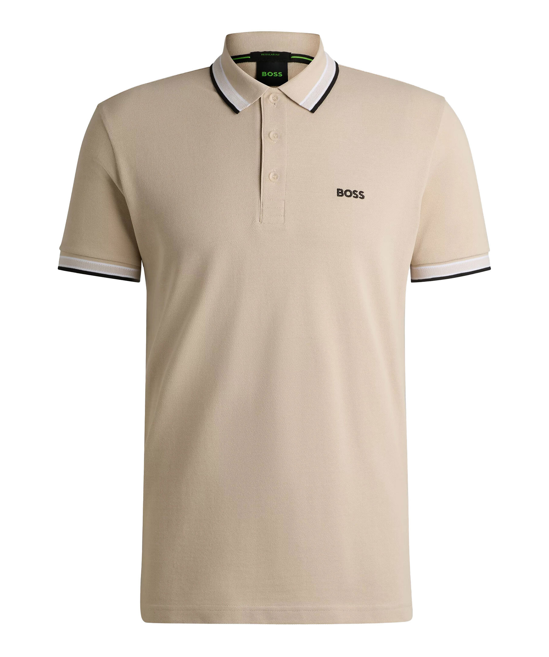 Beige, kortärmad pikétröja från BOSS Green. Pikén har tre knappar framtill, sportiga ränder vid kragen och ärmslut. Logotypdetaljer på undersidan av kragen. Tillverkad i bomull.