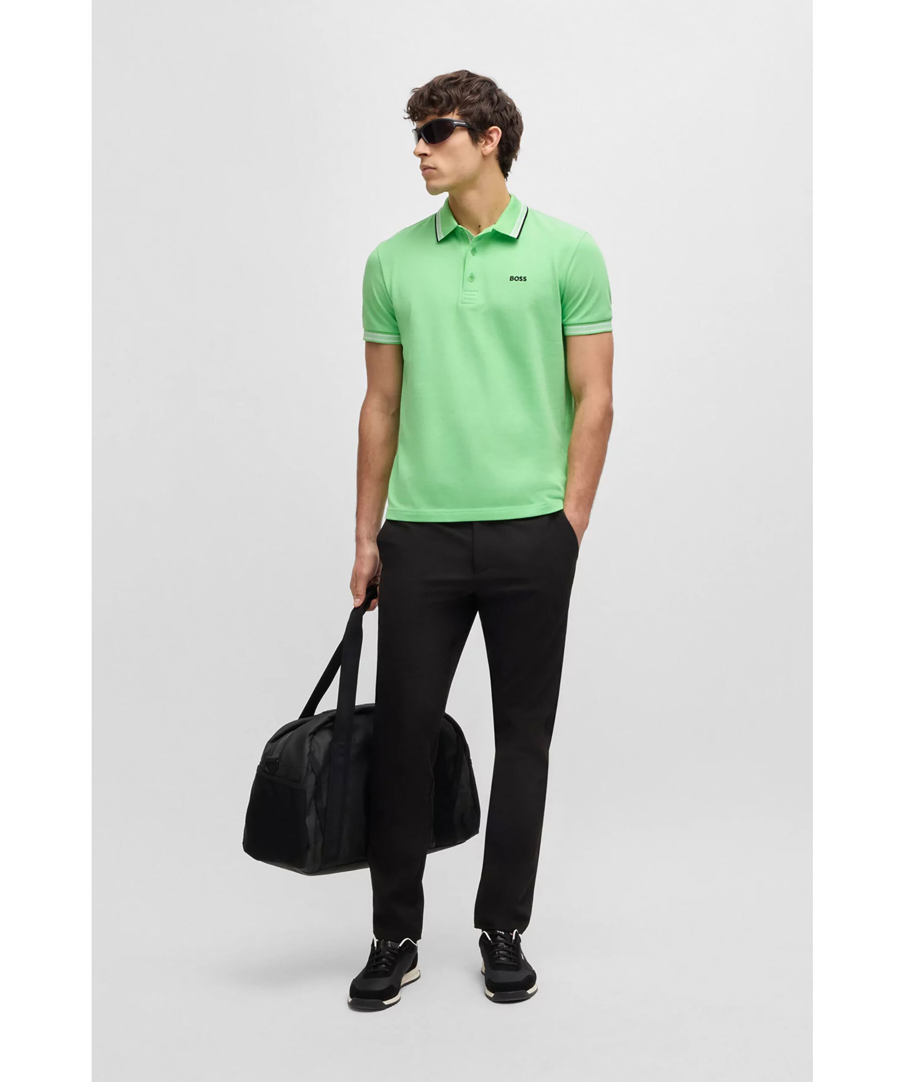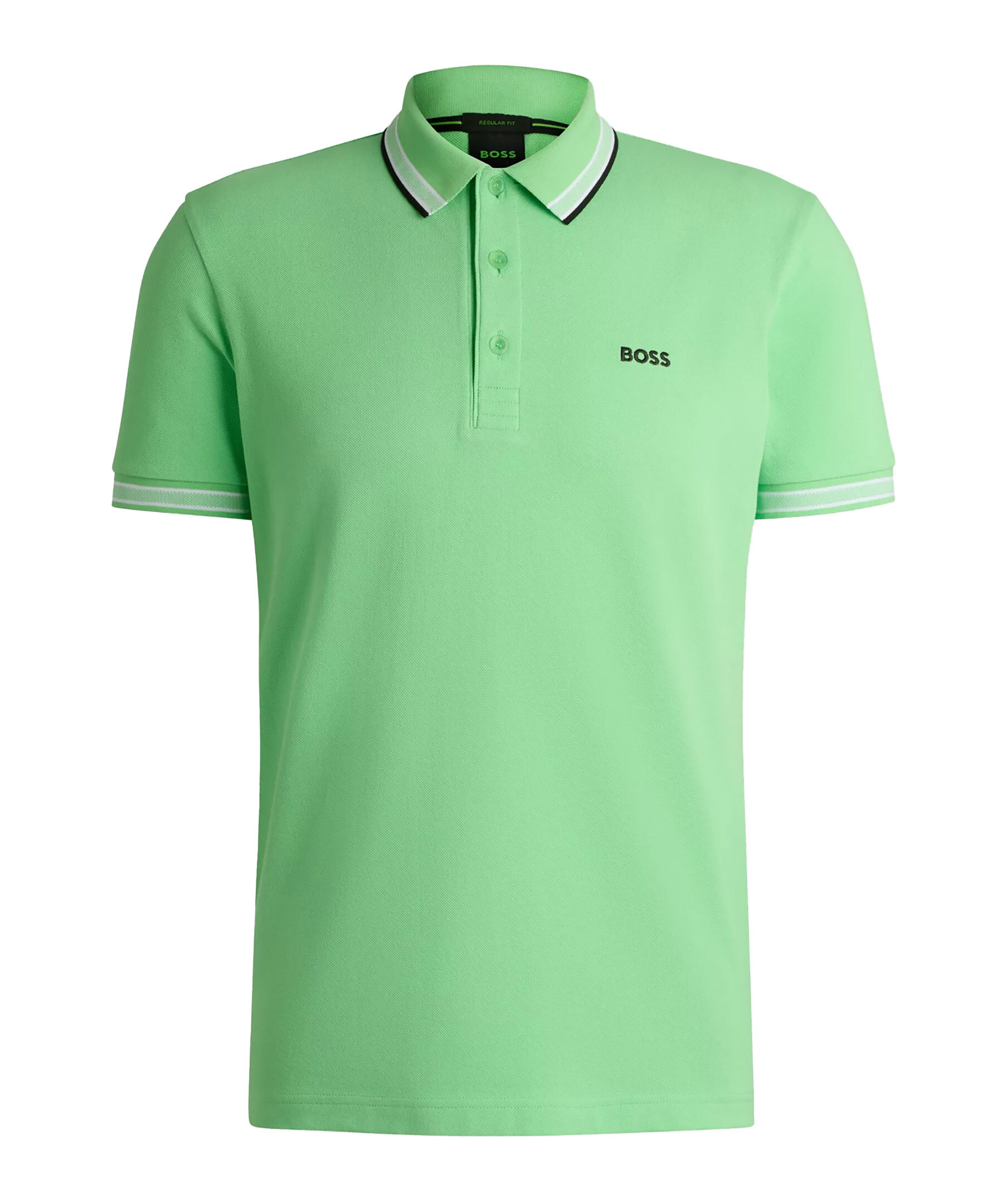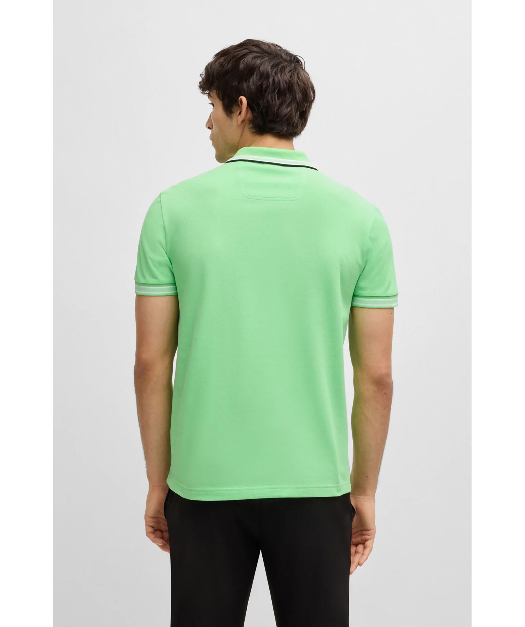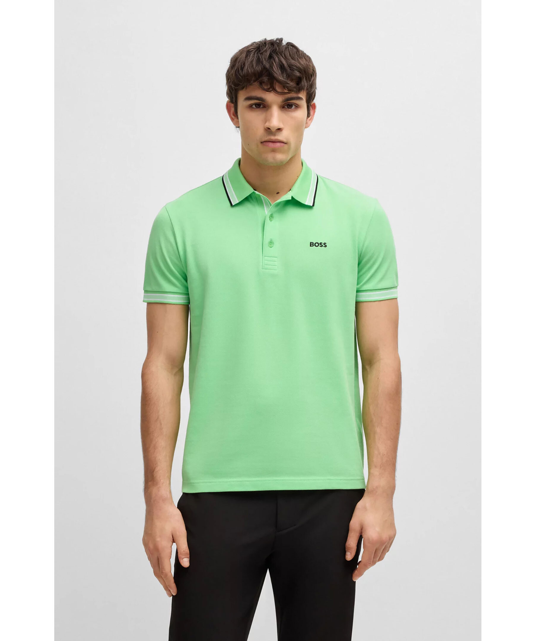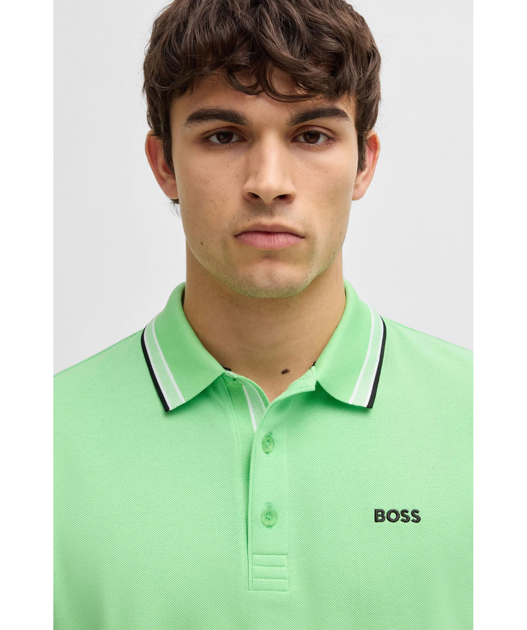 Grön, kortärmad pikétröja från BOSS Green. Pikén har tre knappar framtill, sportiga ränder vid kragen och ärmslut. Logotypdetaljer på undersidan av kragen. Tillverkad i bomull.