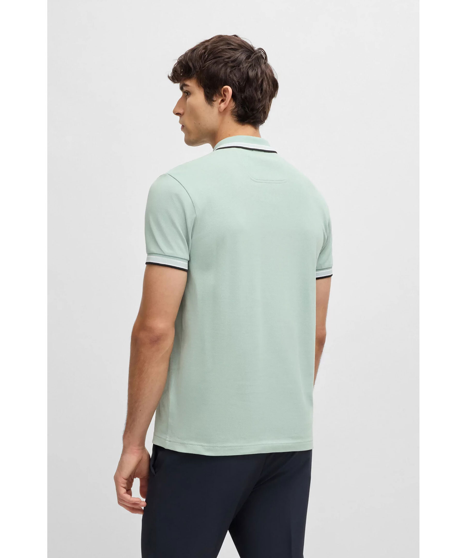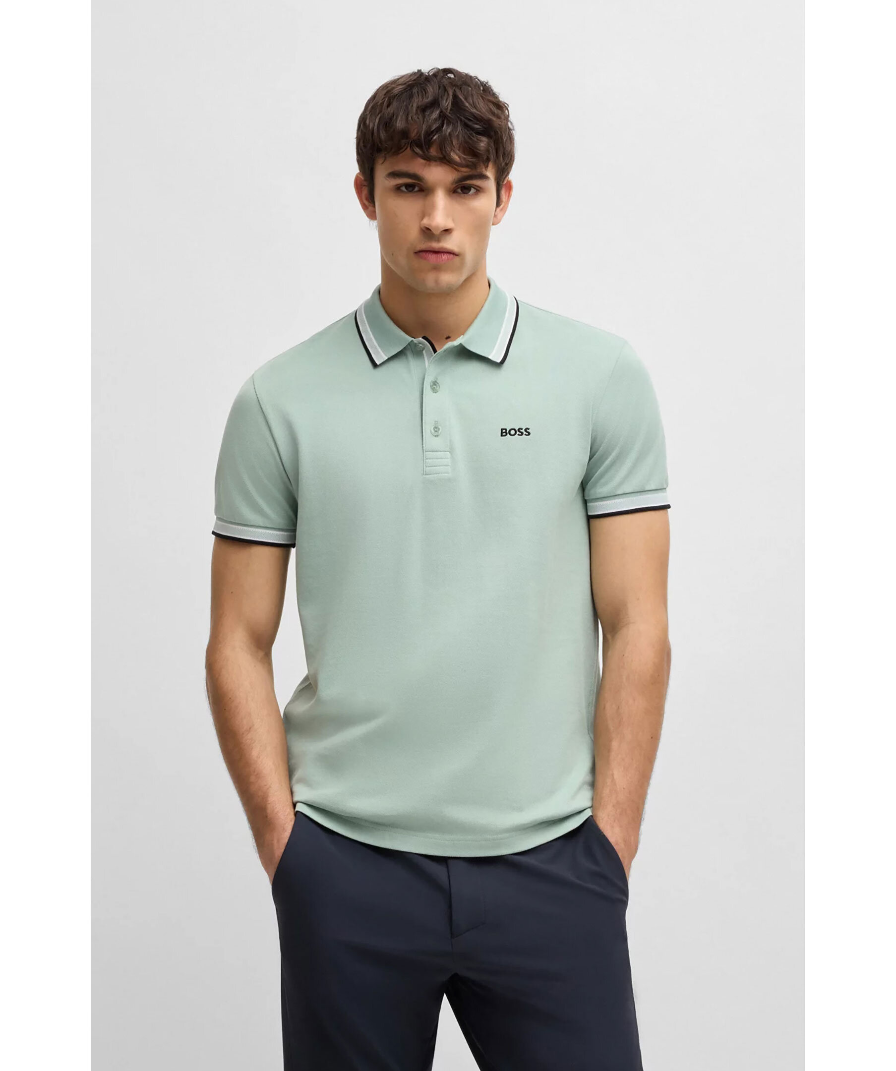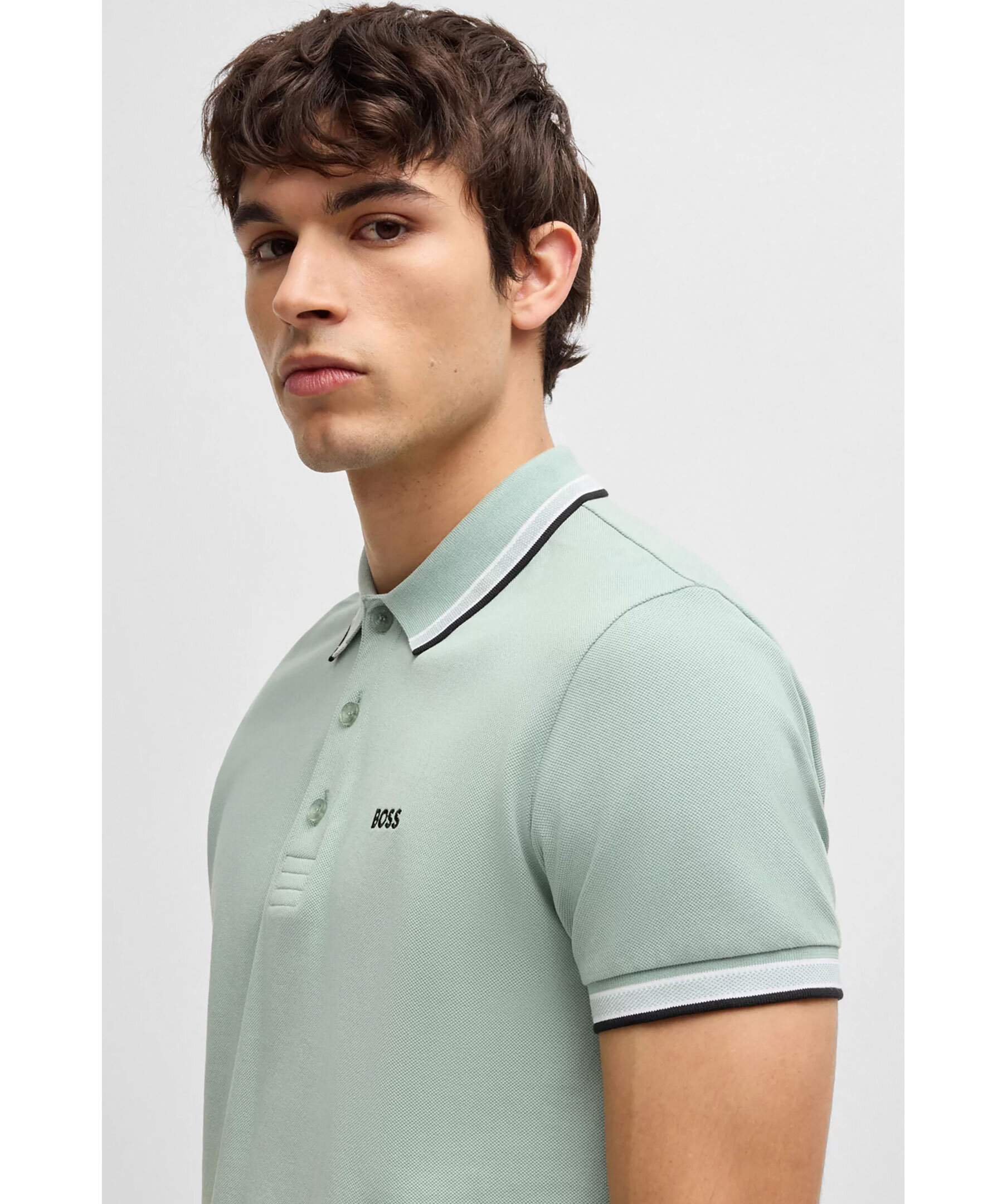 Grön, kortärmad pikétröja från BOSS Green. Pikén har tre knappar framtill, sportiga ränder vid kragen och ärmslut. Logotypdetaljer på undersidan av kragen. Tillverkad i bomull.