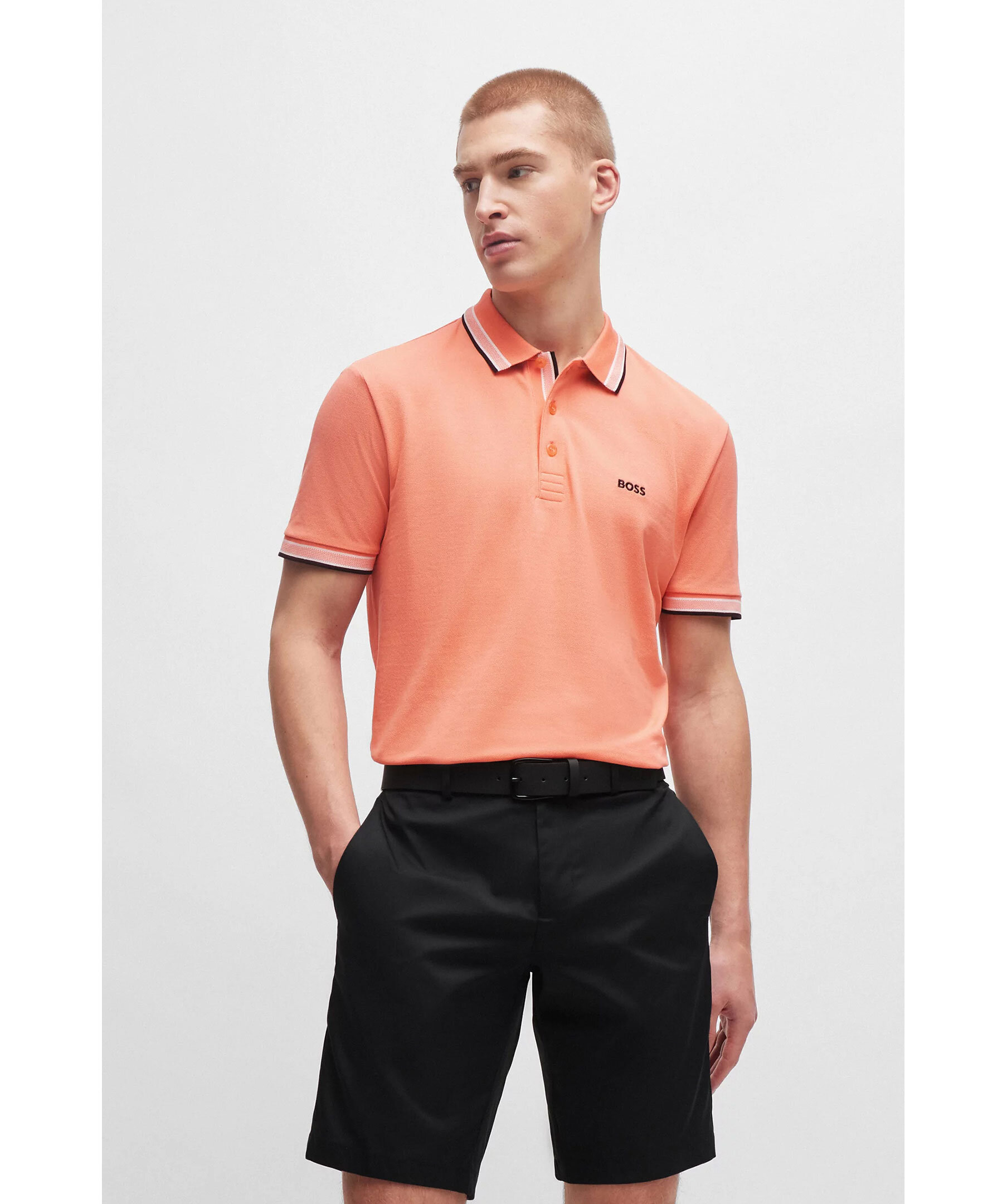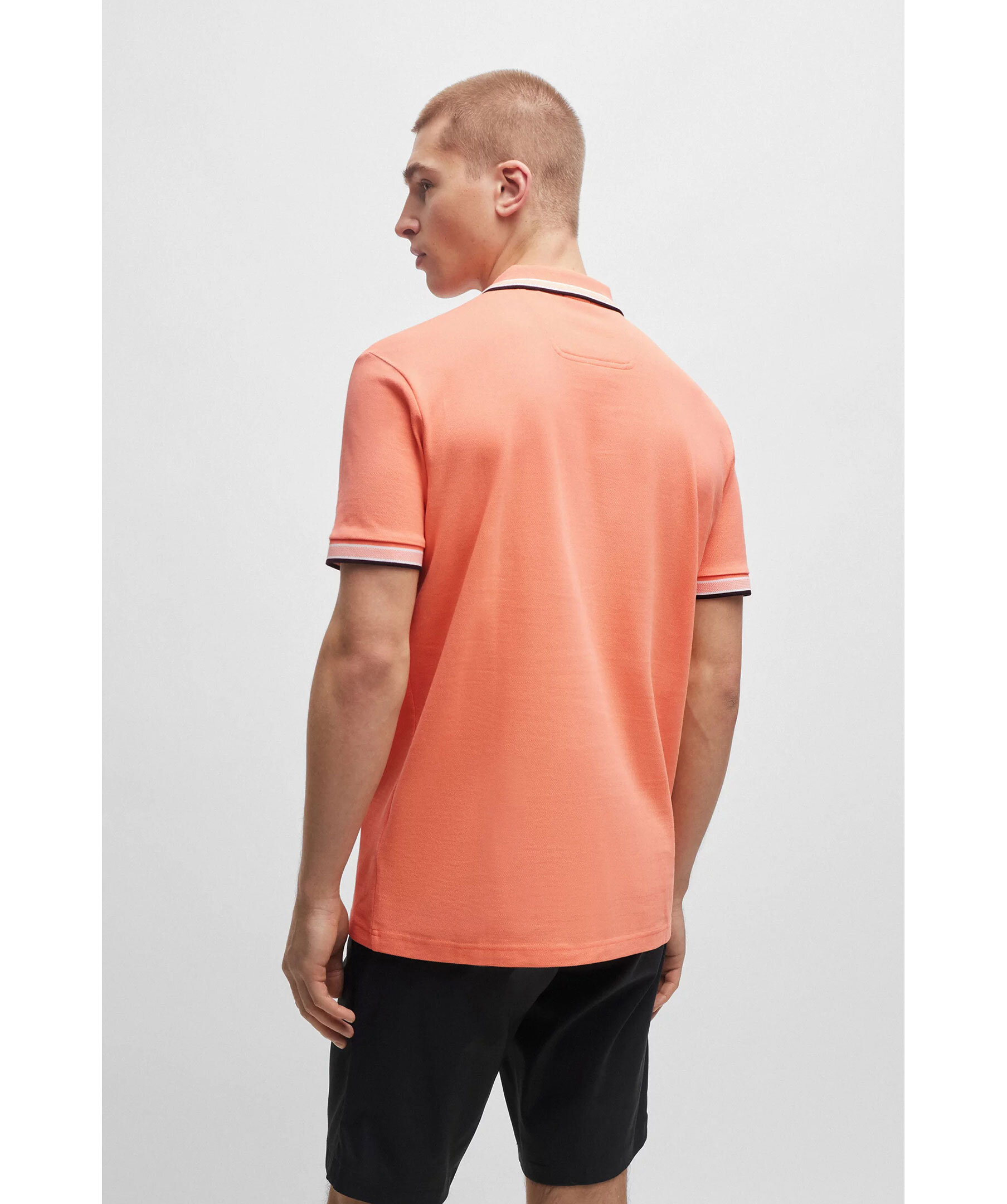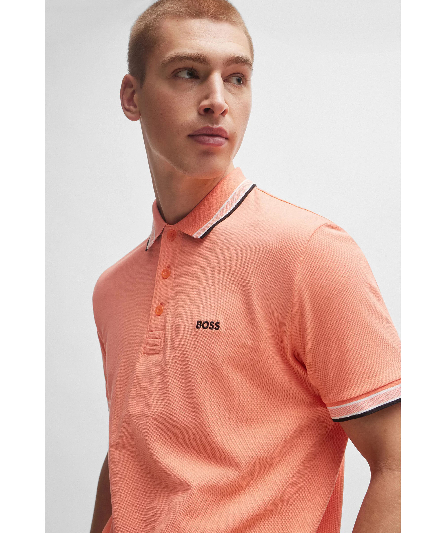Orange, kortärmad pikétröja från BOSS Green. Pikén har tre knappar framtill, sportiga ränder vid kragen och ärmslut. Logotypdetaljer på undersidan av kragen. Tillverkad i bomull.