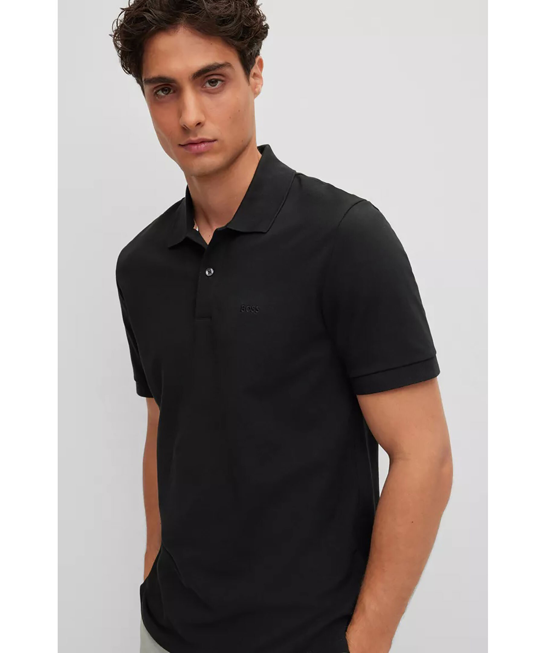 Svart kortärmadpiké från BOSS Black gjord i 100% bomull. Knappslå med två knappar, ribbad krage och mudd vid ärmslut. Liten ton-i-ton logotyp broderad på bröstet. Små sidoslitsar.