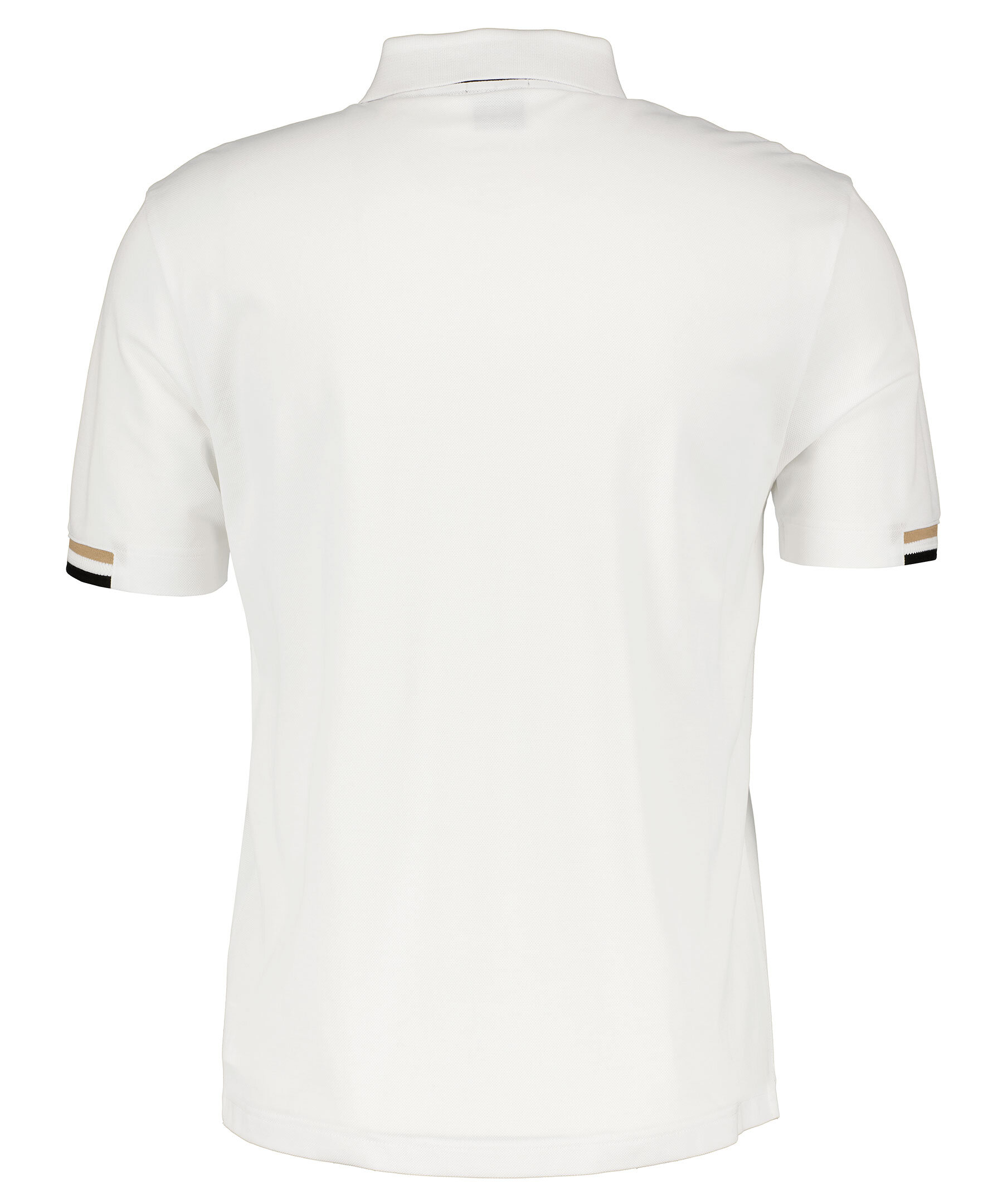 Vit piké från BOSS Black. Logg tryckt på vänster bröst, två knappar fram, spetsig krage och korta slitsar i sidorna. Beige vit och svart elastisk mudd vid ärmslut.