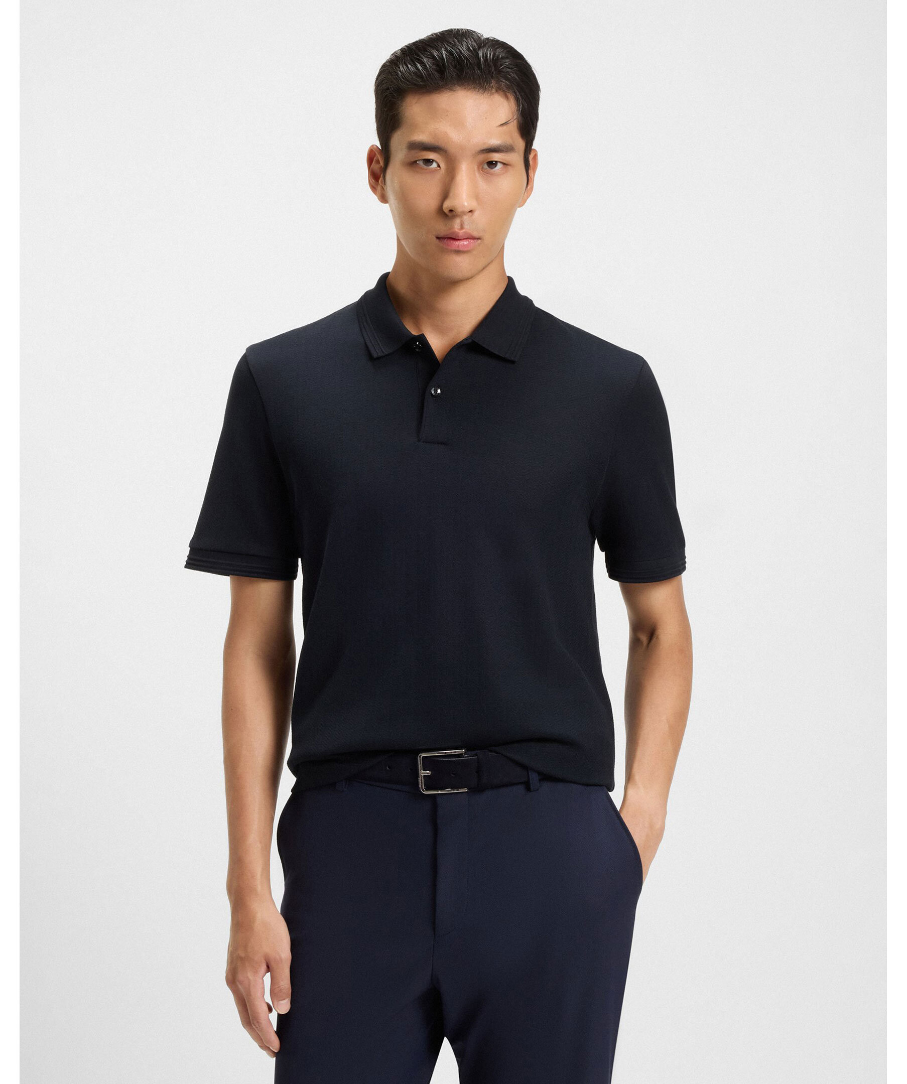 Mörkblå piké från Boss Black. Två knappar vid kragen och är tillverkad av 100% bomull.