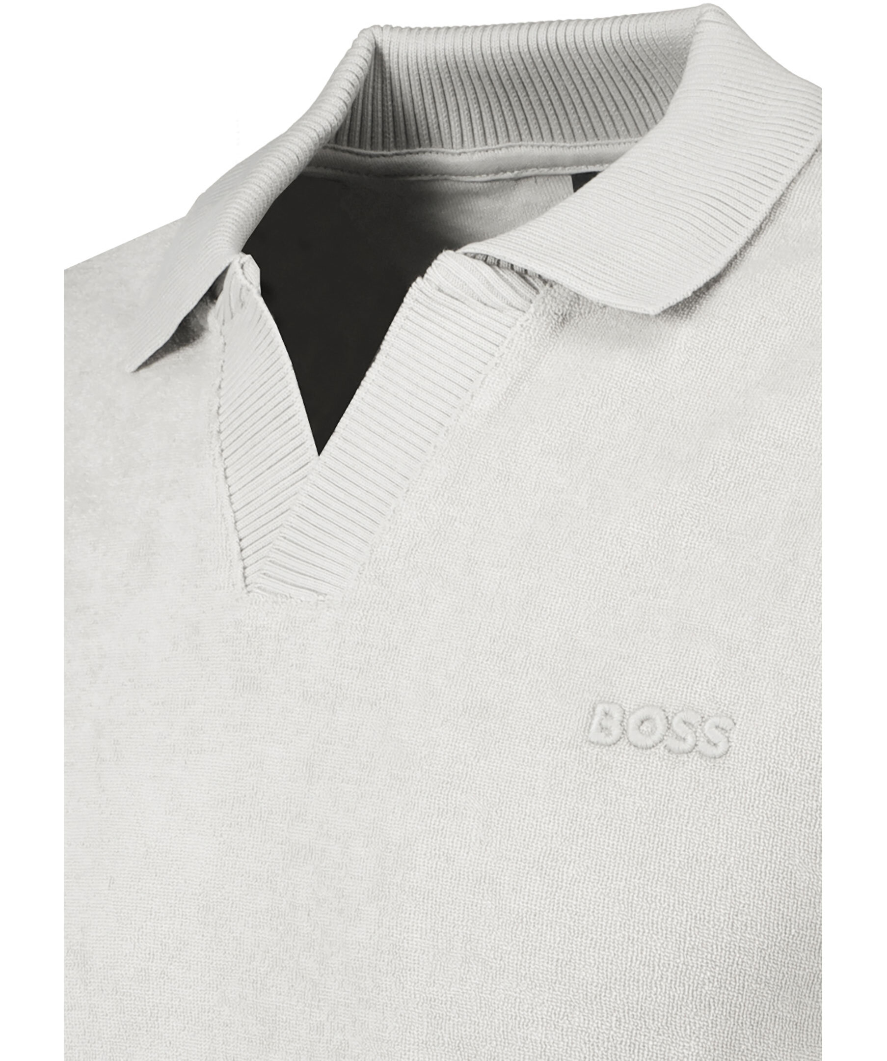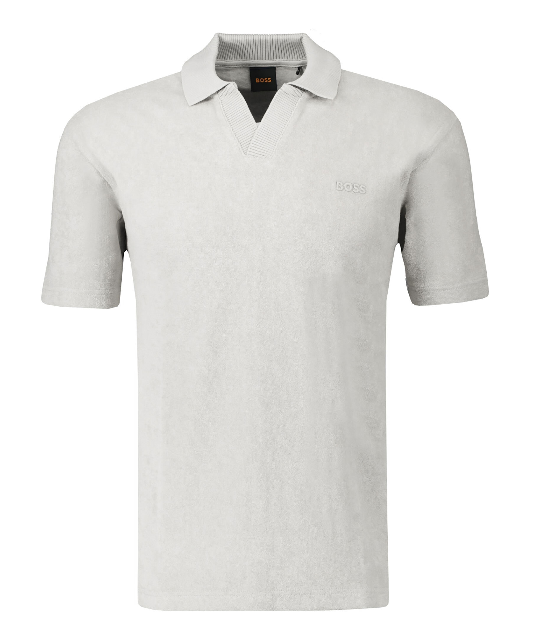Vit, kortärmad pikétröja i ett frottétyg från BOSS Orange. Pikén har ribbstickad krage och broderad logotyp på bröstet. Tillverkad i bomull.