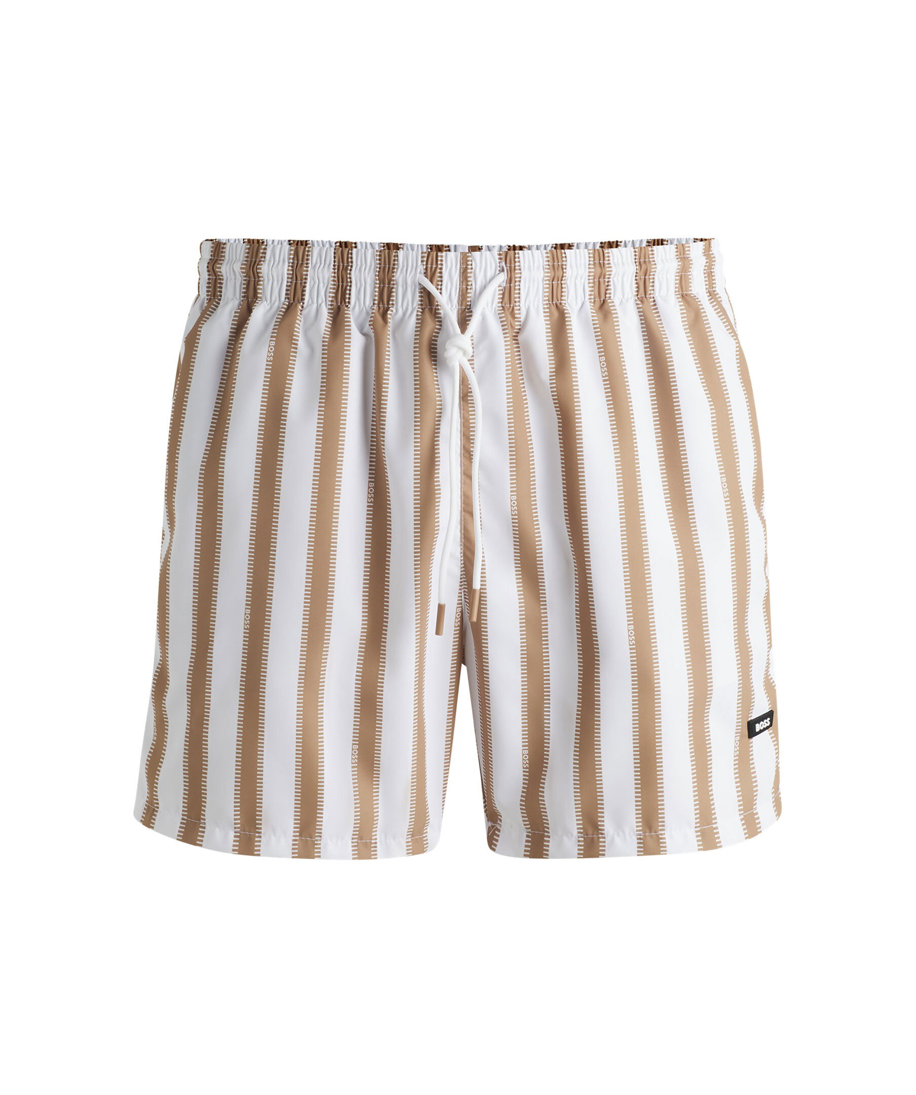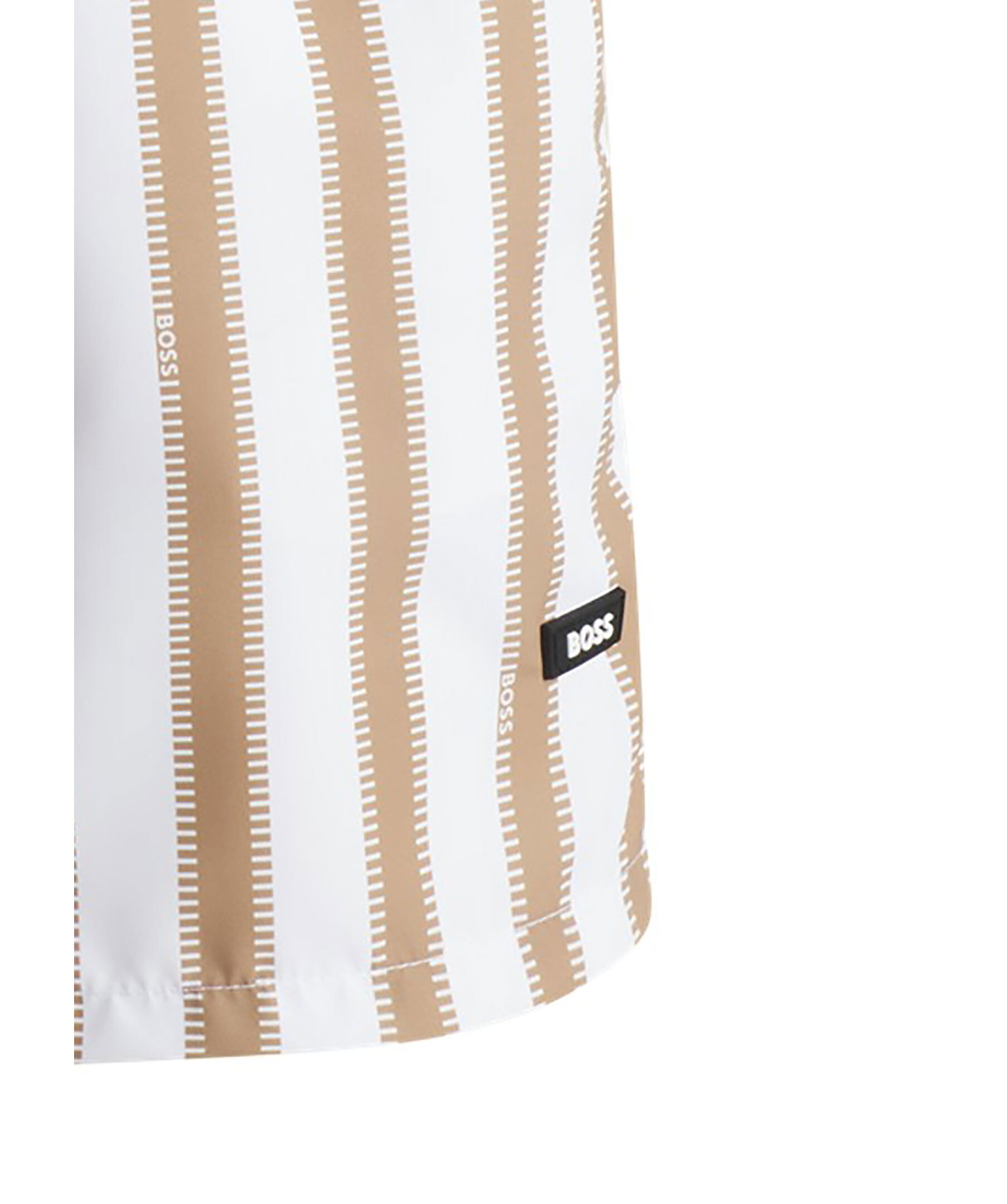 Vita och beigea, randiga och helfodrade badshorts från BOSS Black. Elastisk midja med dragsko. Två sidfickor samt en bakficka. Tillverkade i snabbtorkande polyester.