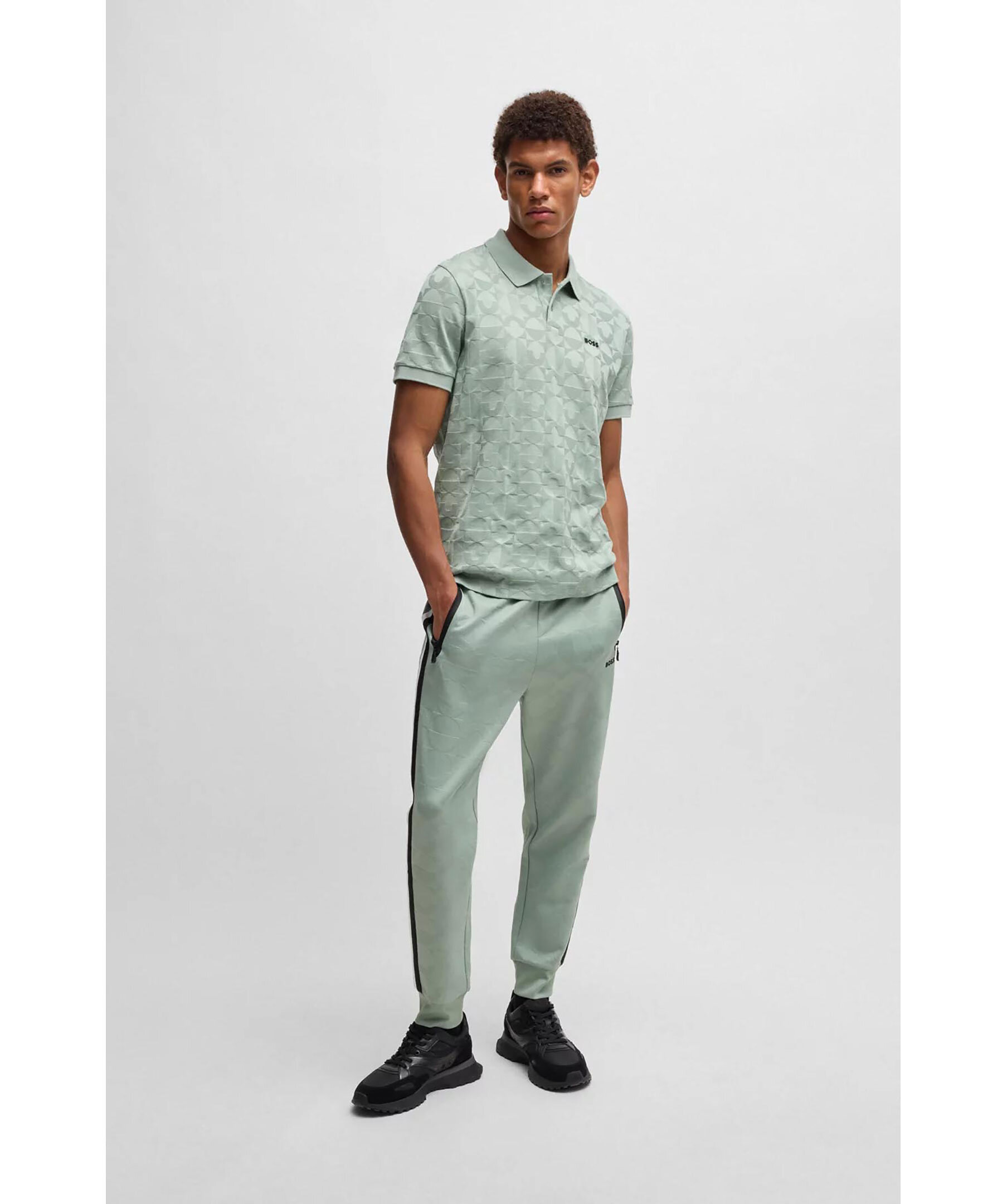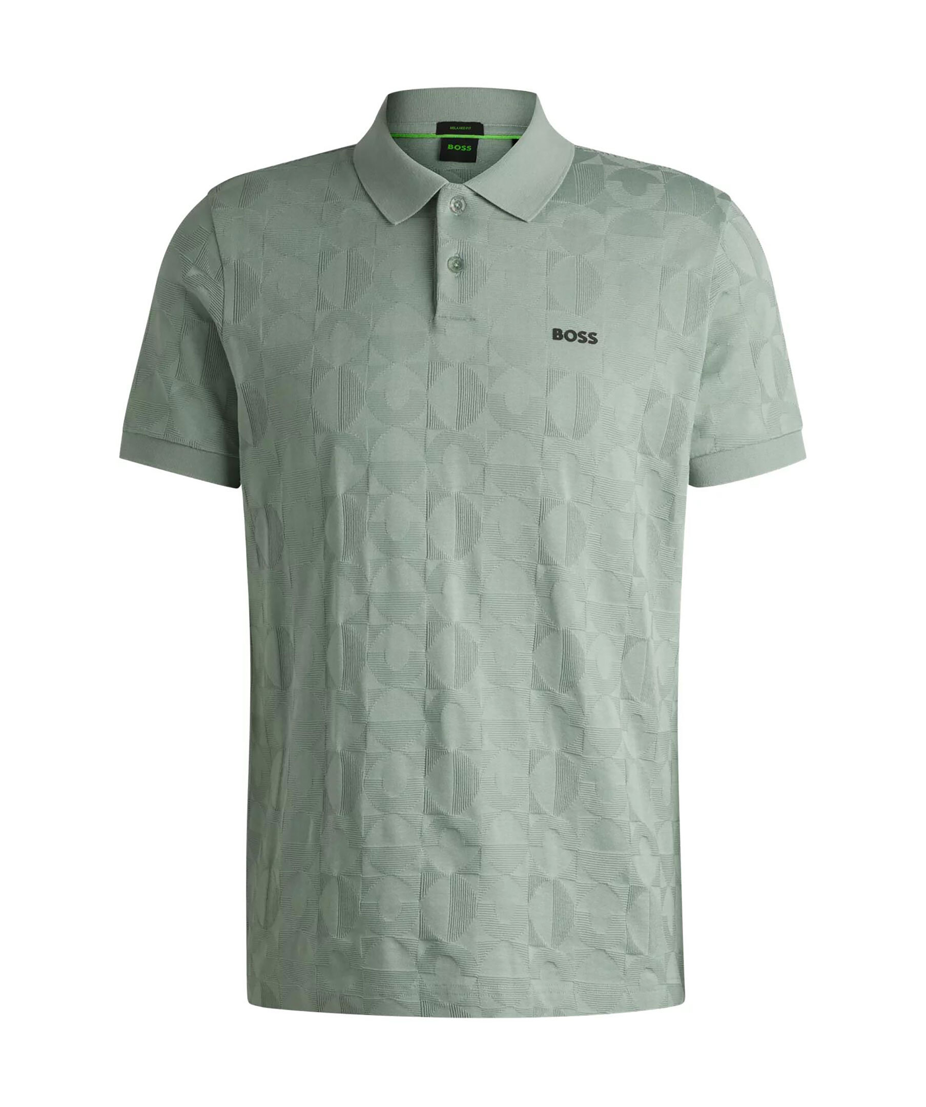 Grön pikétröja från BOSS Green. Pikén har ett cirkulärt jacquardmönster och logotyp på bröstet samt två knappar framtill. Tillverkad i bomull.