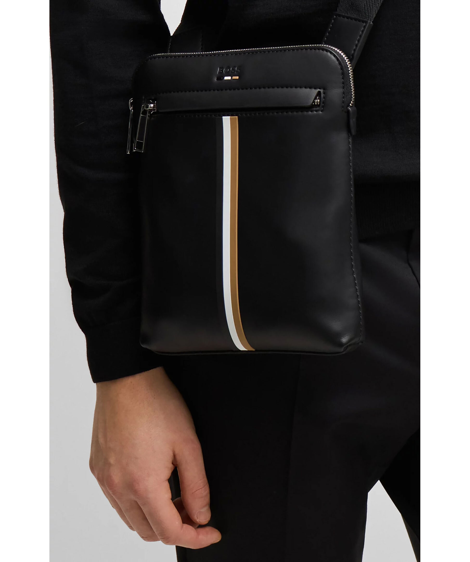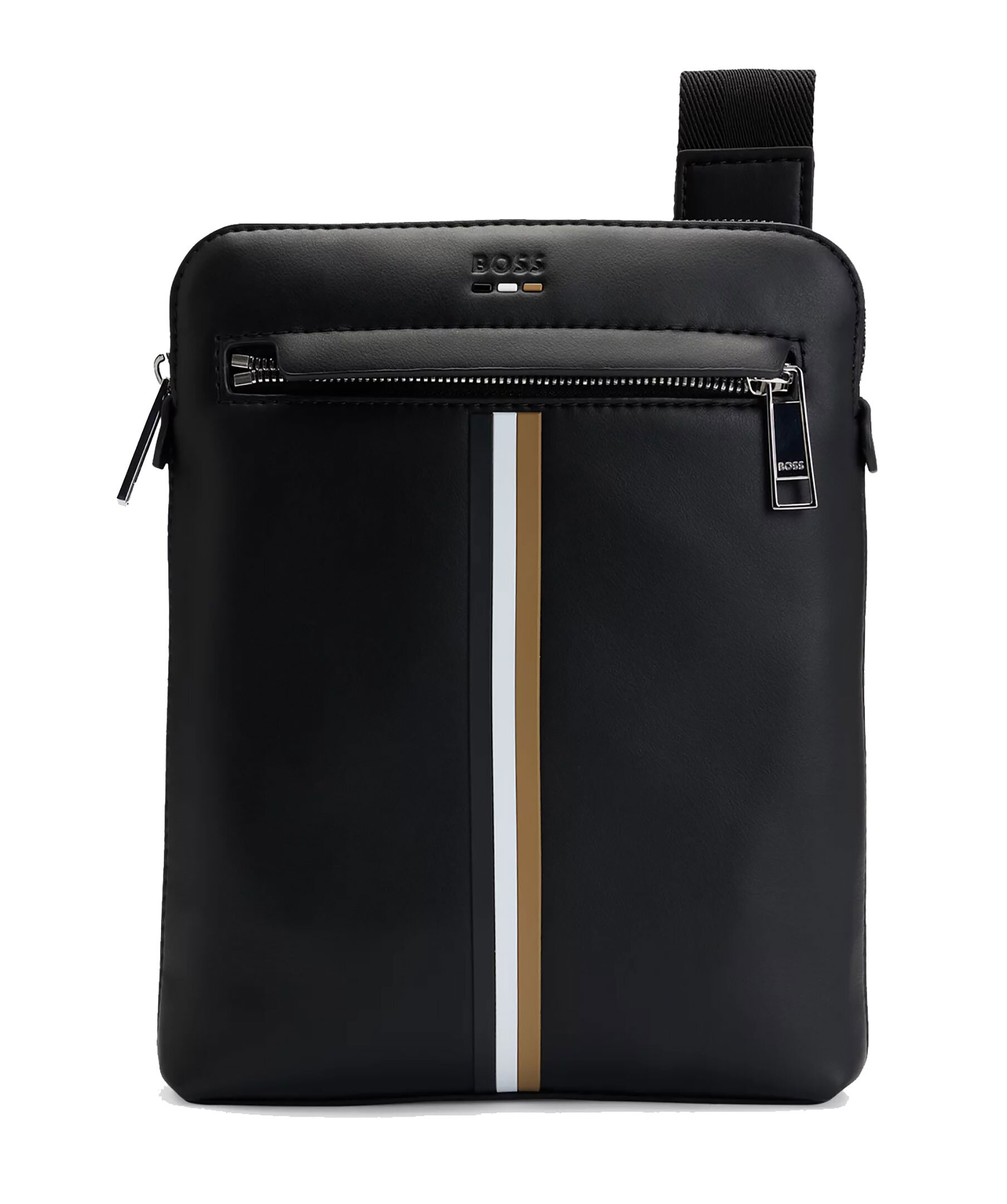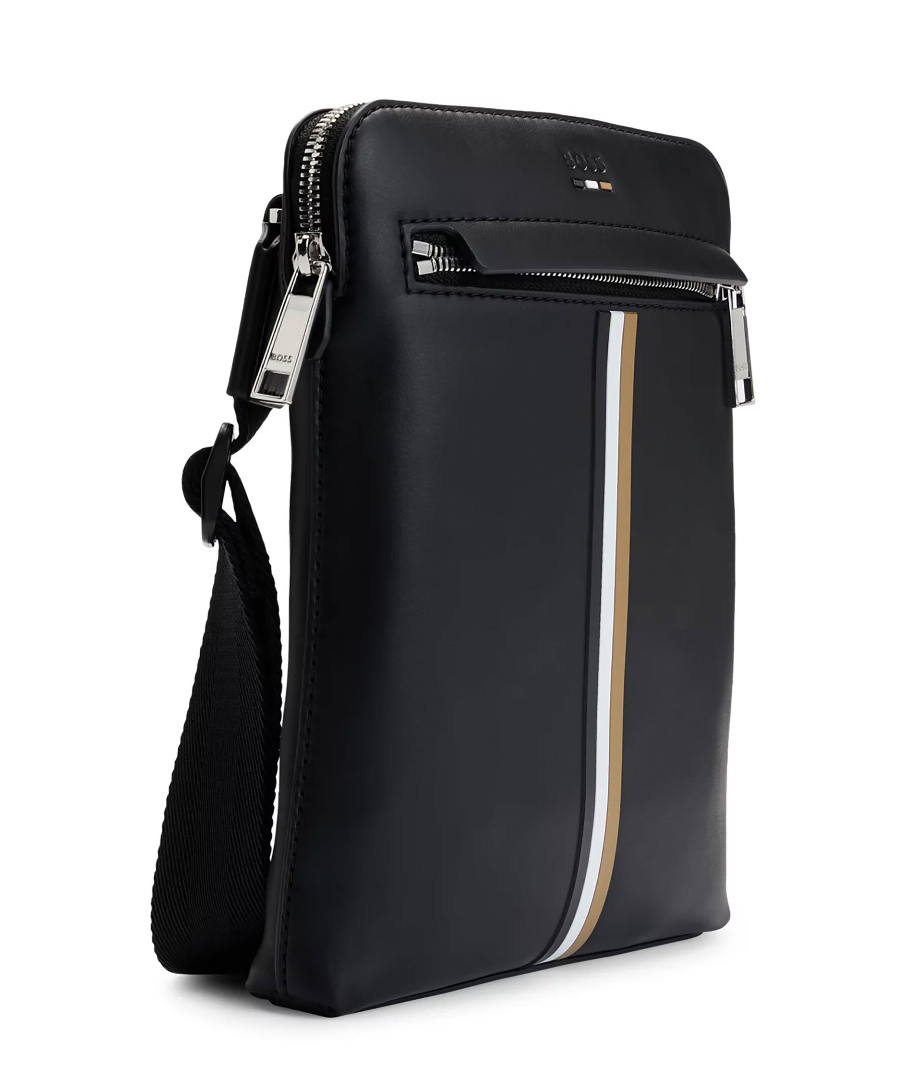 Svart kuvertväska från BOSS. Tillverkad i syntetmaterial med klassisk detaljer, inklusive deras ränder i tre färger. Väskan stängs med dragkedja och har en utvändig ficka med dragkedja samt en innerficka med dragkedja. Mått: B: 20cm / H: 24cm / D: 1,5cm.