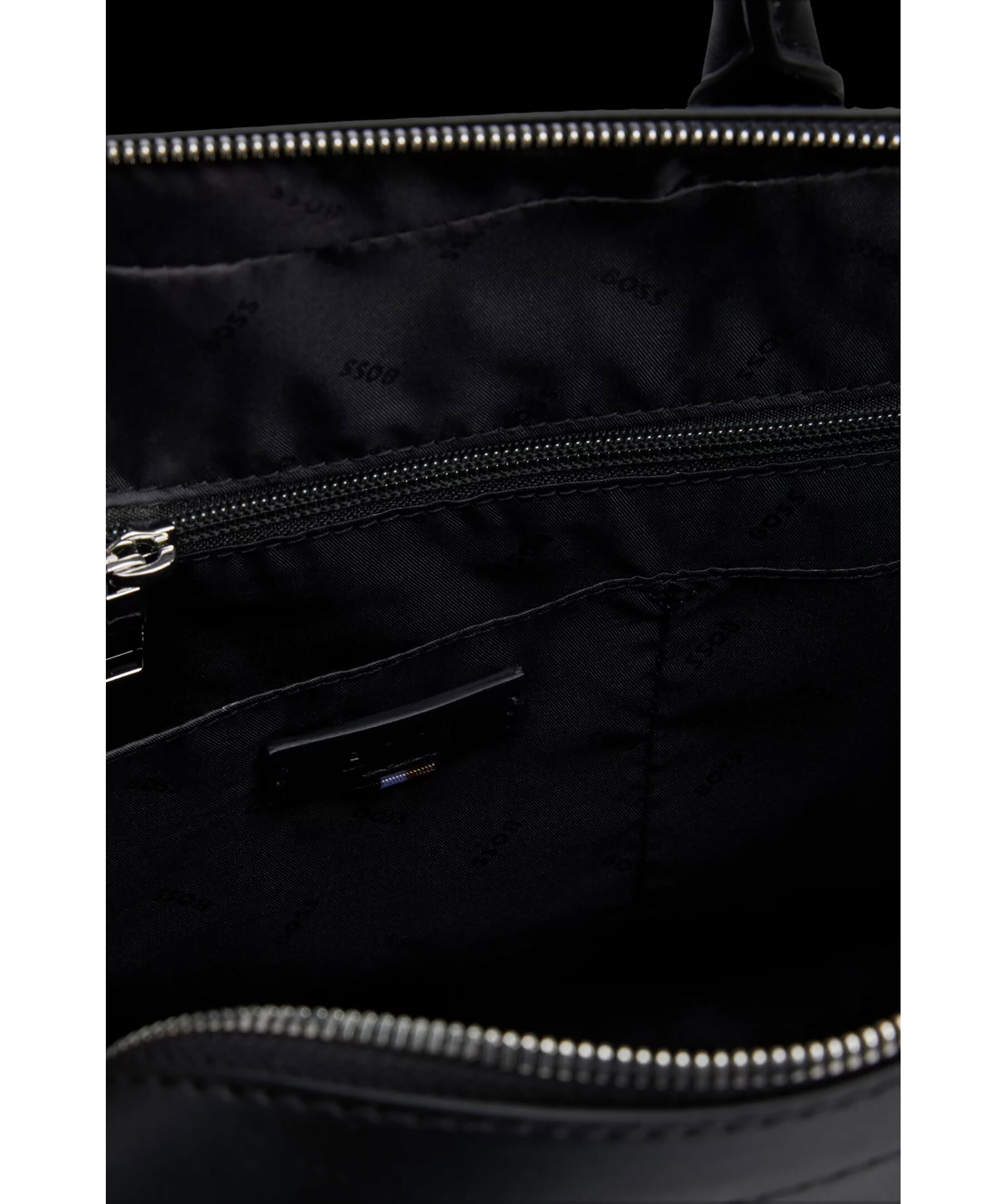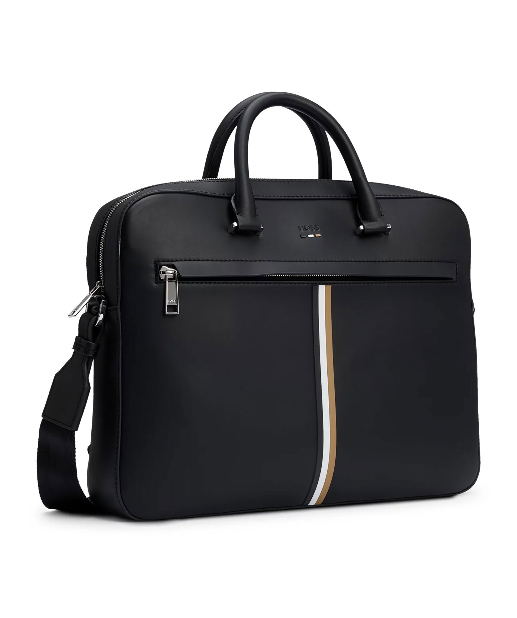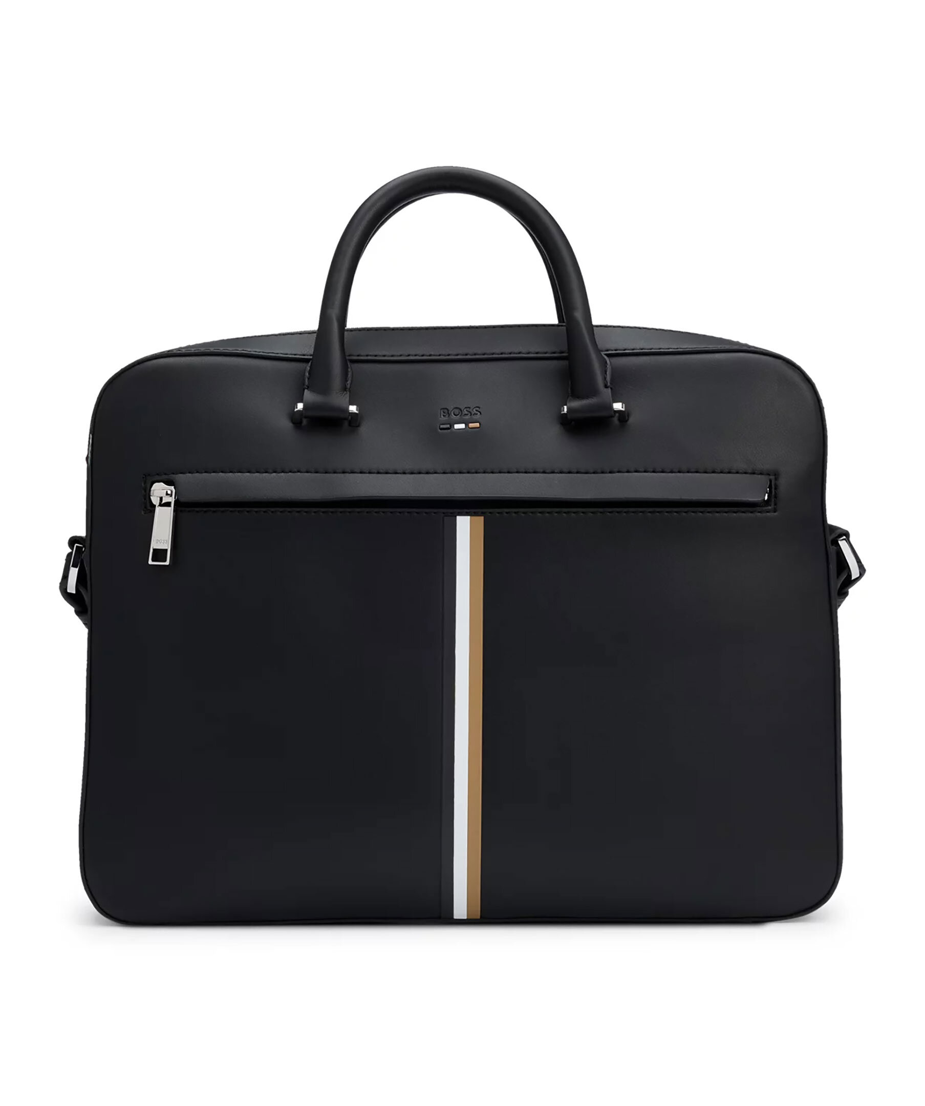 Svart datorväska från BOSS. Väskan är tillverkad av syntetmaterial med logga och detaljer i deras signaturfärger. Väskan stängs med dragkedja och har en innerficka med dragkedja samt en öppen ficka invändigt. Bär med dubbelhandtagen eller axelremmen. Mått: B: 38cm / H: 29cm / D: 7cm.