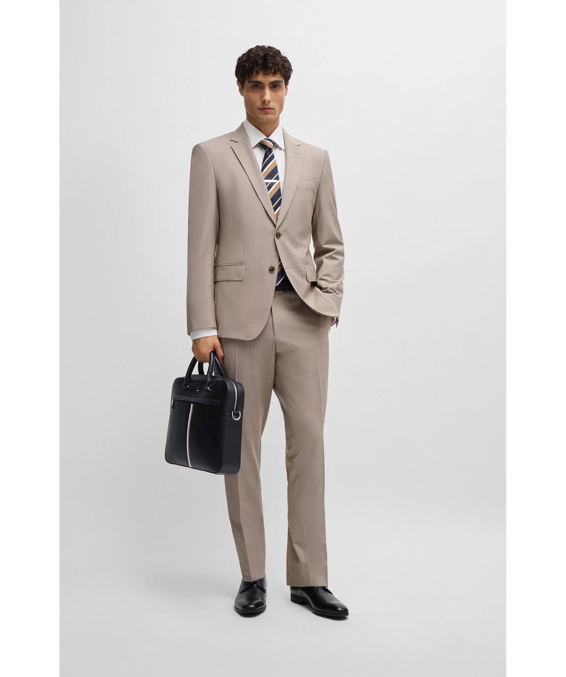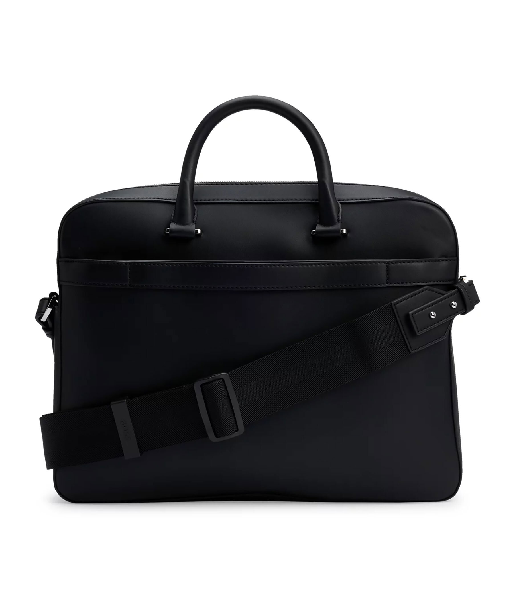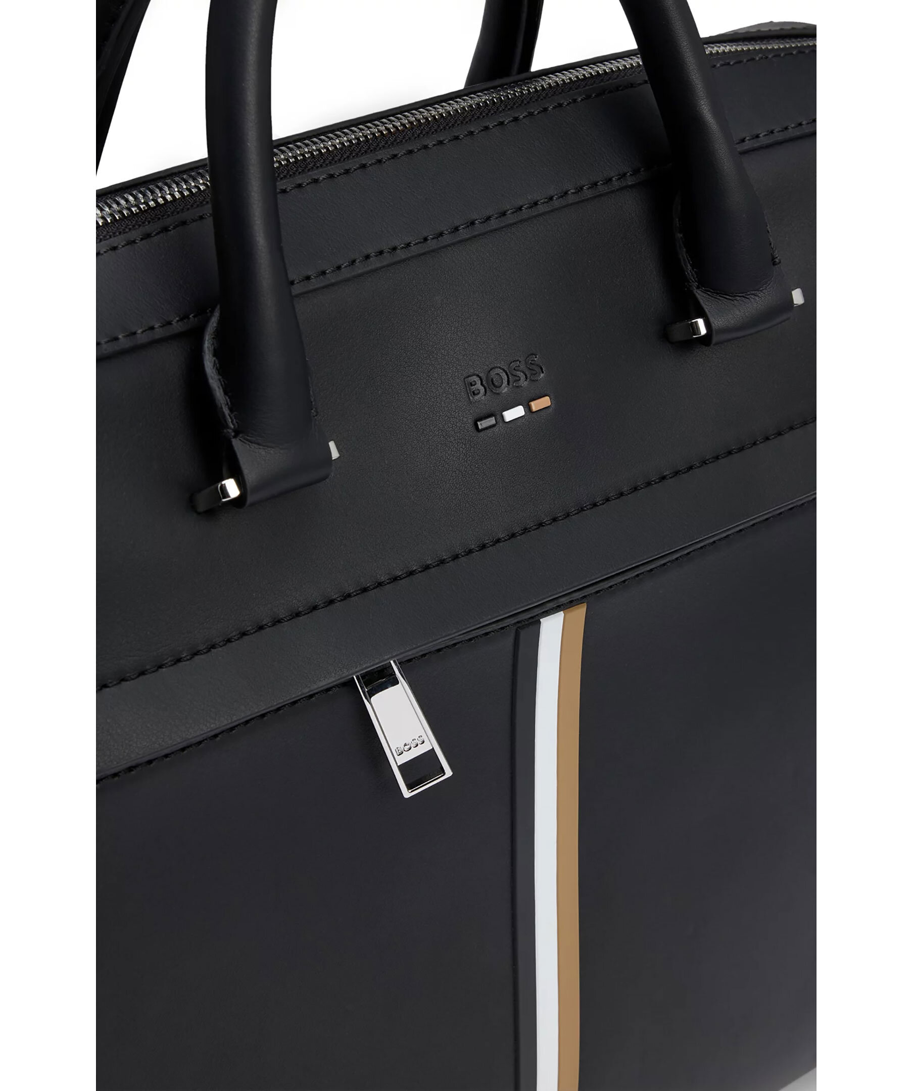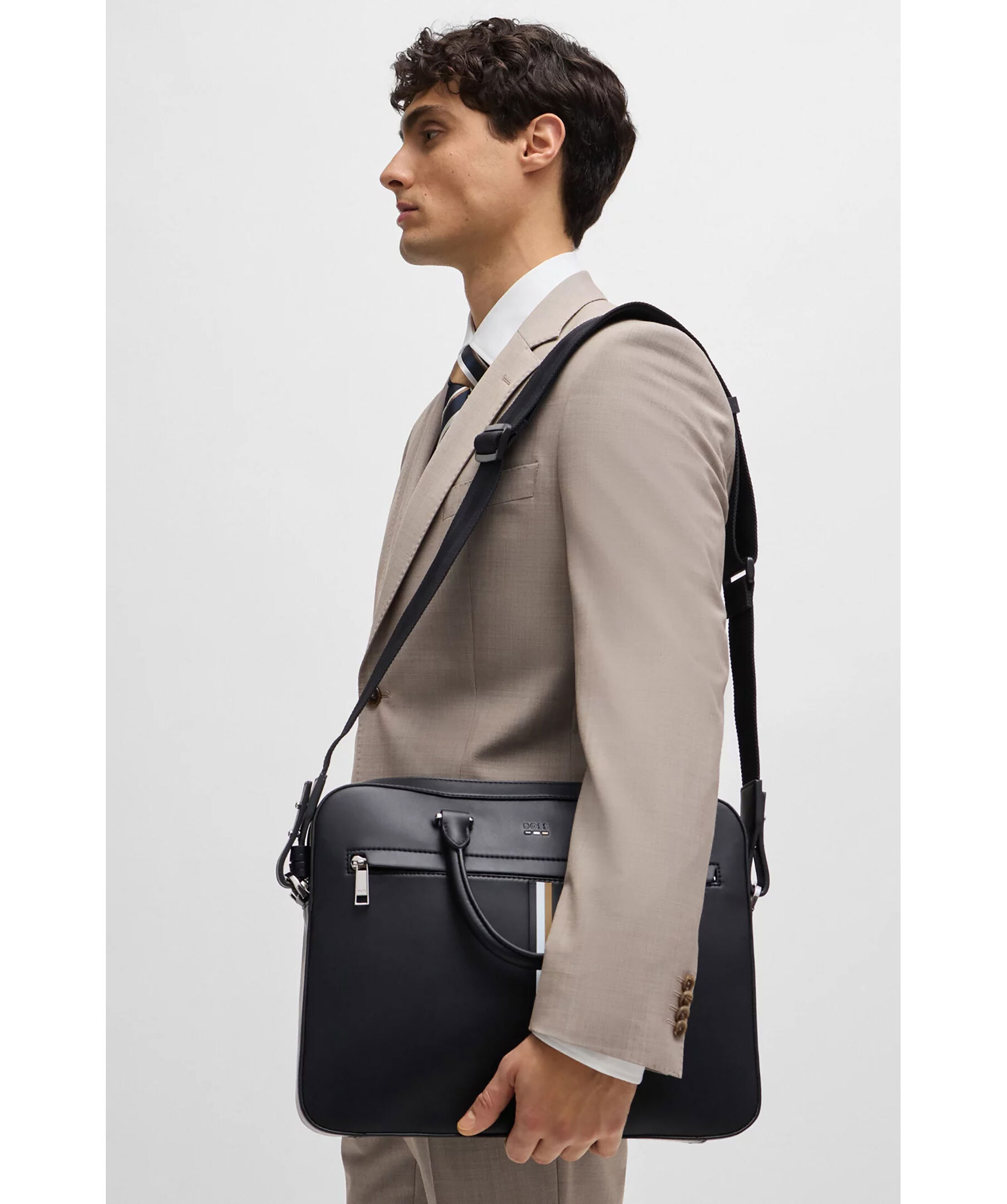 Svart datorväska från BOSS. Väskan är tillverkad av syntetmaterial med logga och detaljer i deras signaturfärger. Väskan stängs med dragkedja och har en innerficka med dragkedja samt en öppen ficka invändigt. Bär med dubbelhandtagen eller axelremmen. Mått: B: 38cm / H: 29cm / D: 7cm.