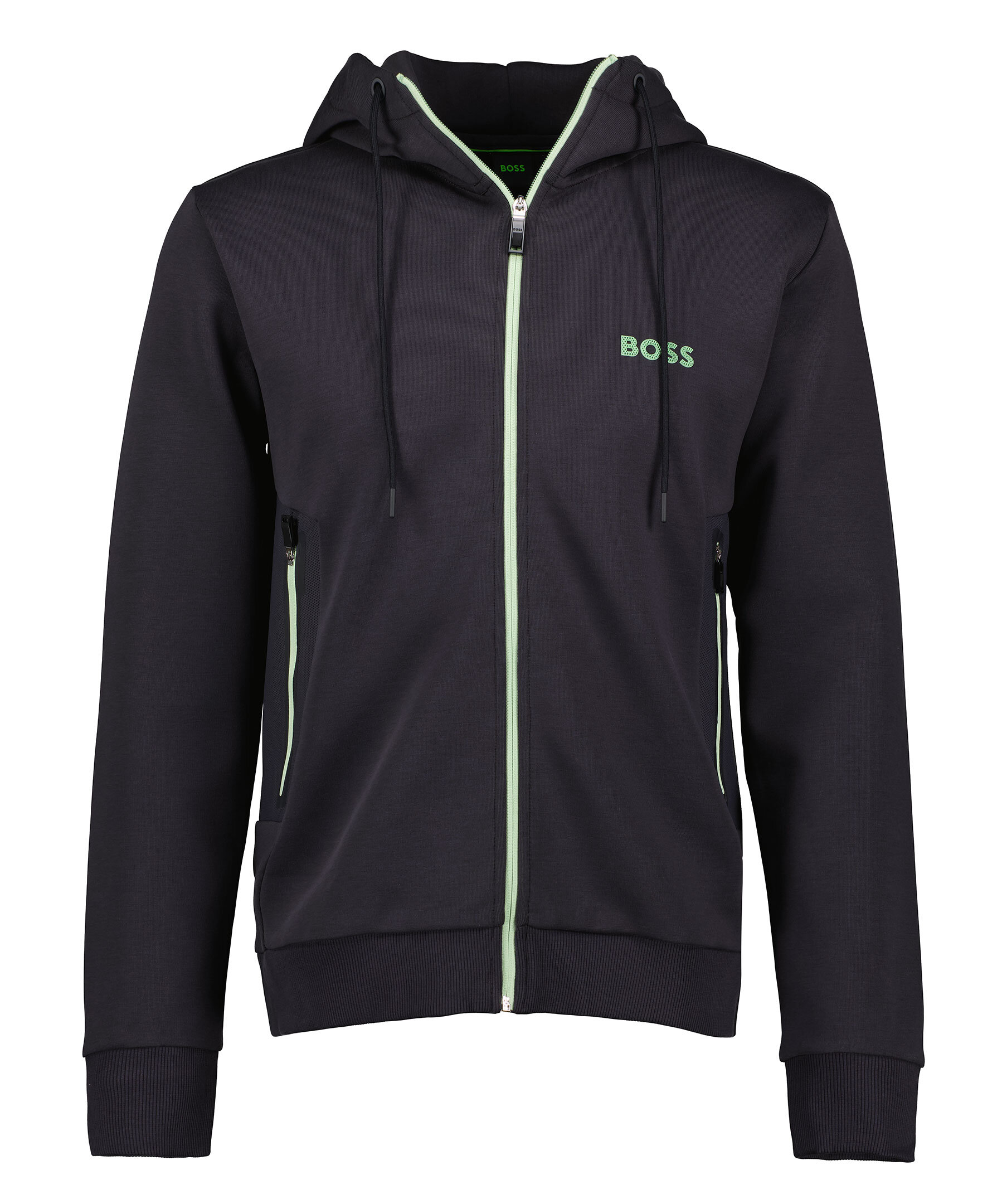 Blågrå hoodie från BOSS Green. Stängs framtill med gröndragkedja. Luva med dragsko. Grön gummerad logotyp på vänster bröst. Två fickor framtill på magen. Ribbstickade muddar vid ärm- och plaggslut. Tillverkad i bommullsblandning.