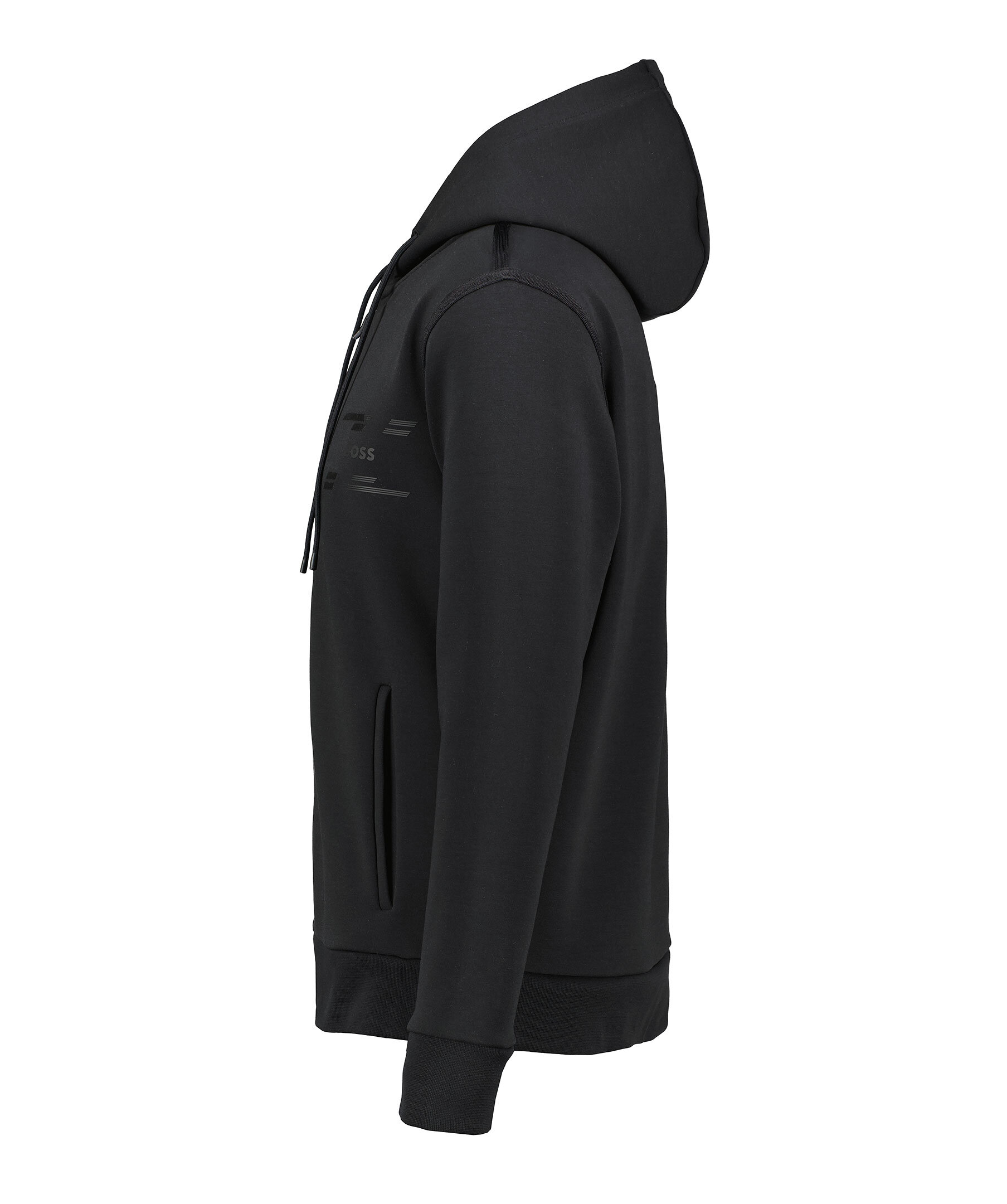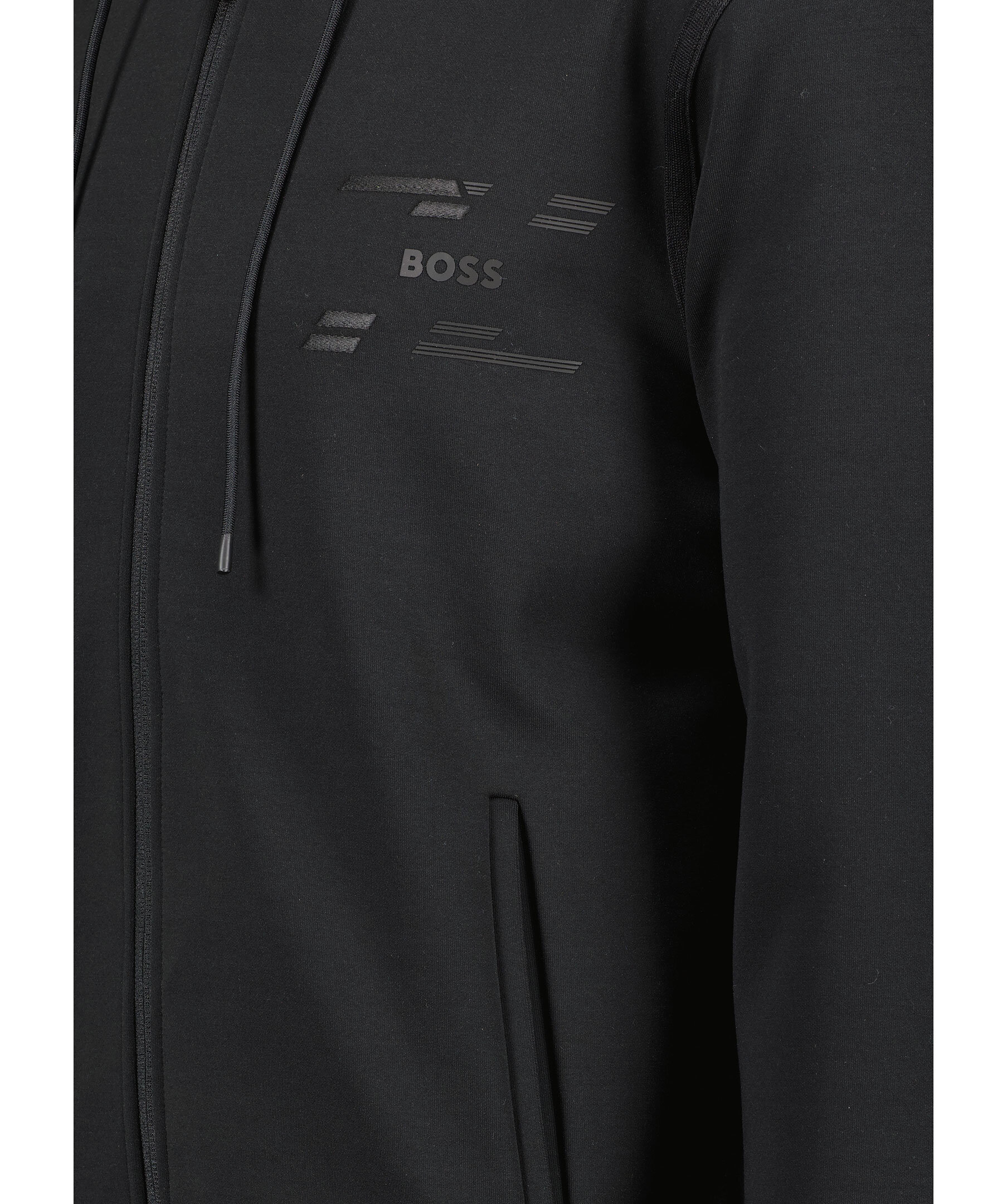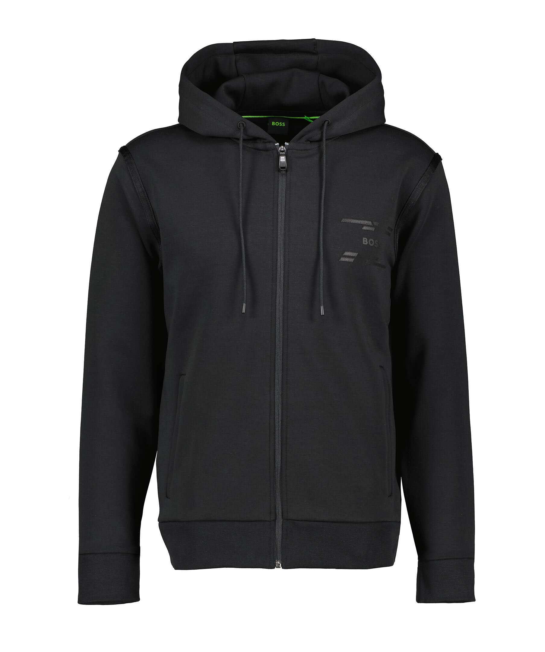 Svart tracksuitjacka från BOSS Green. Tröjan stängs med dragkedja framtill och har huva med dragsko, två sidfickor samt gummerad logotyp på bröstet. Tillverkad i en bomullsblandning.