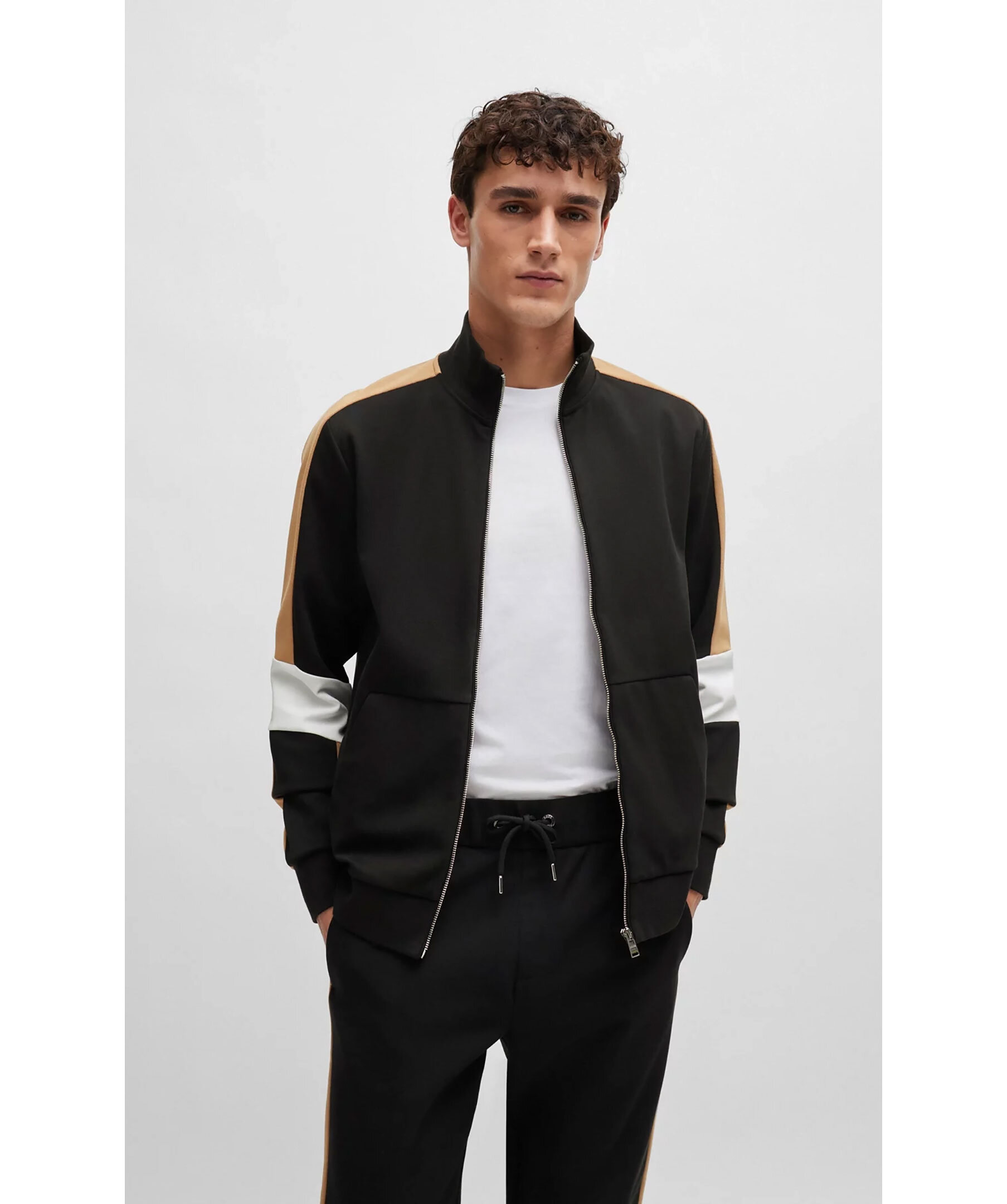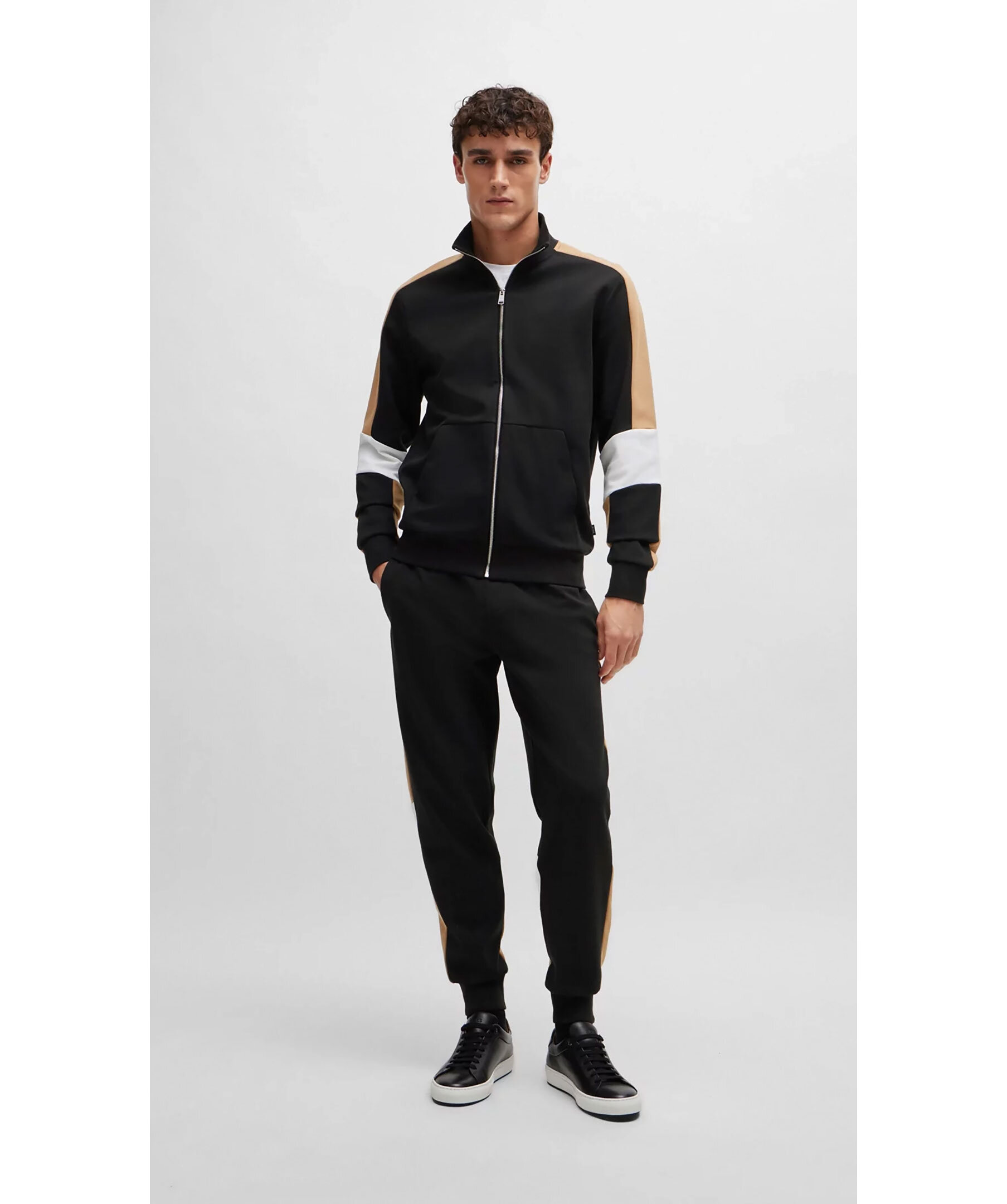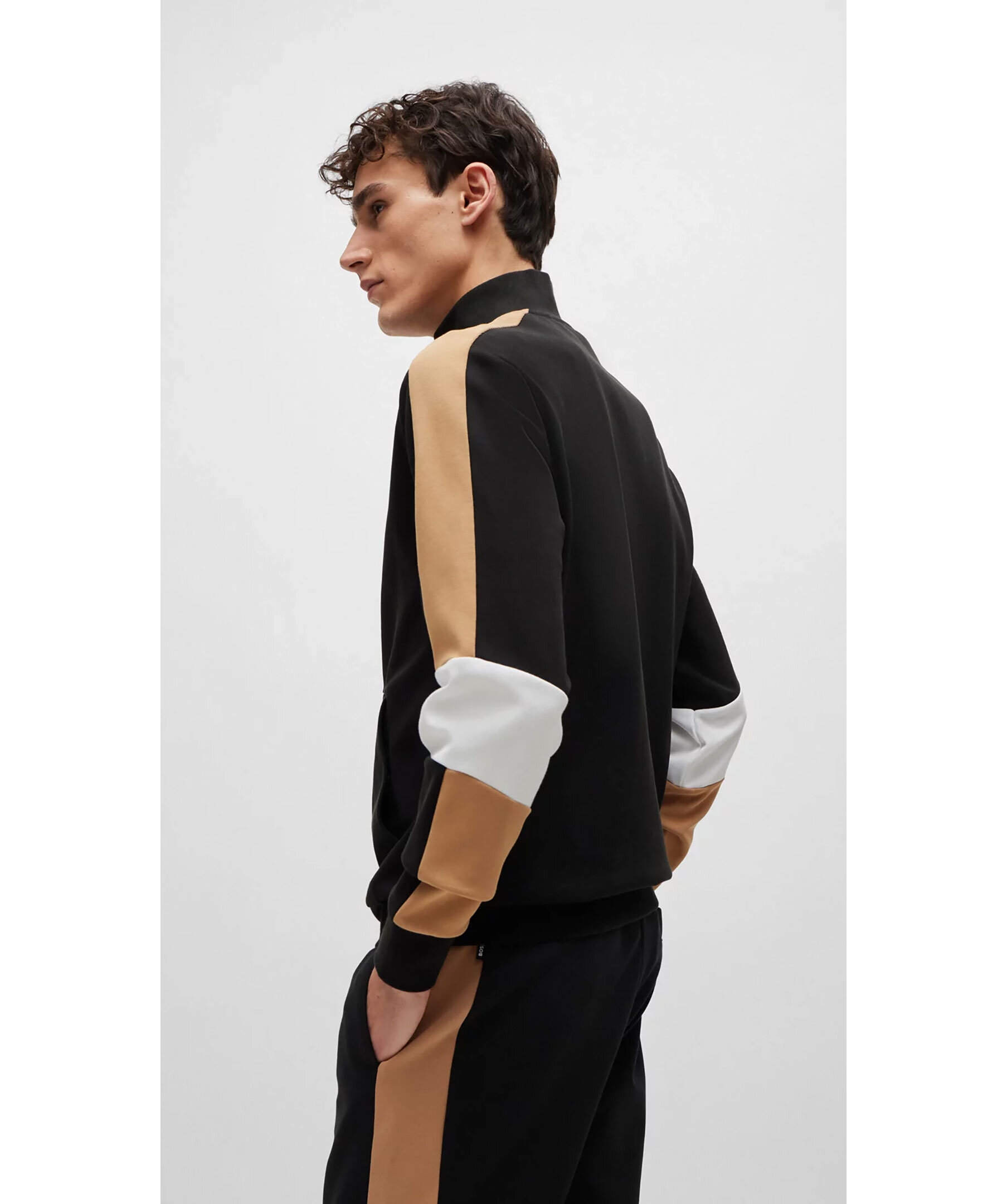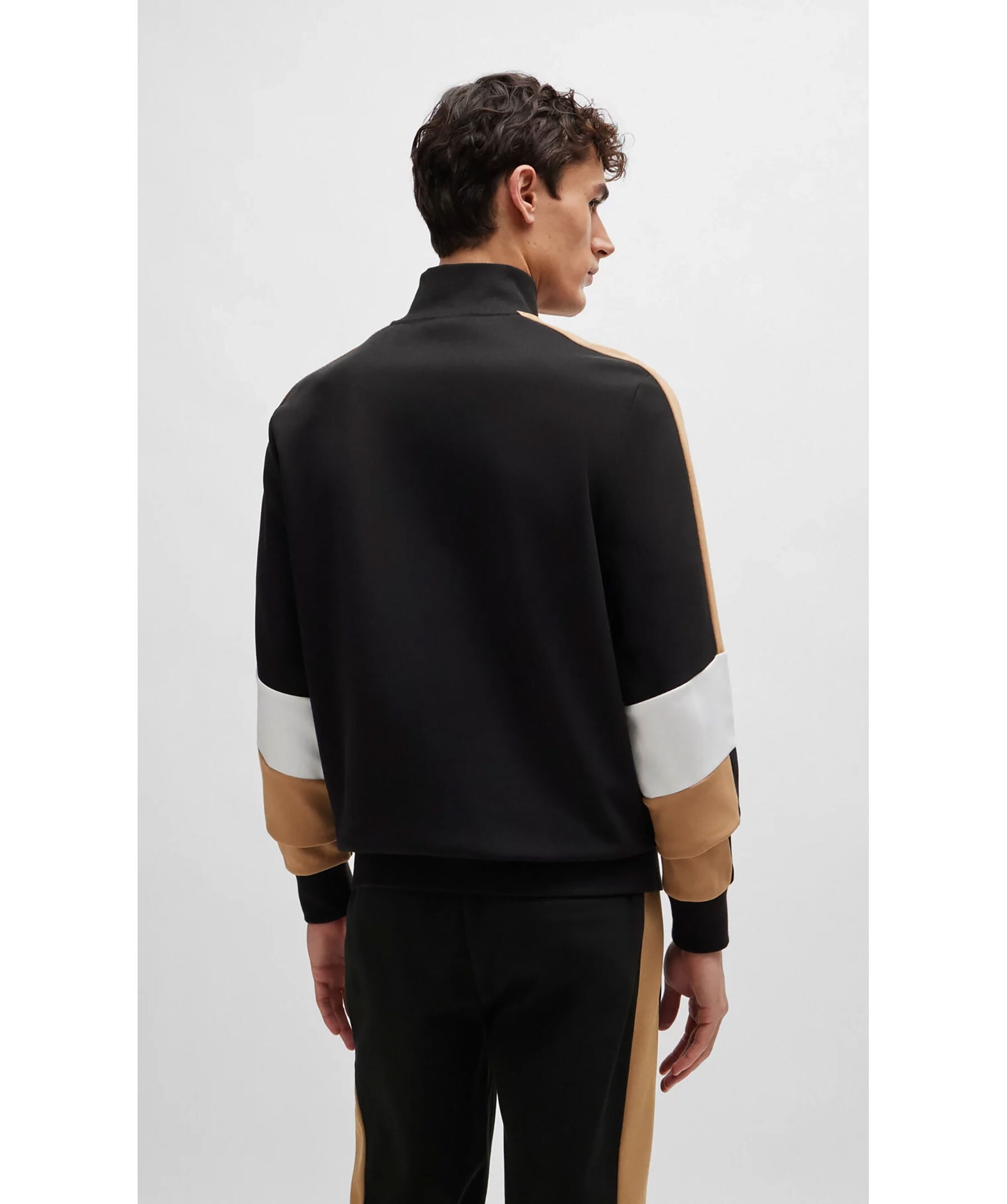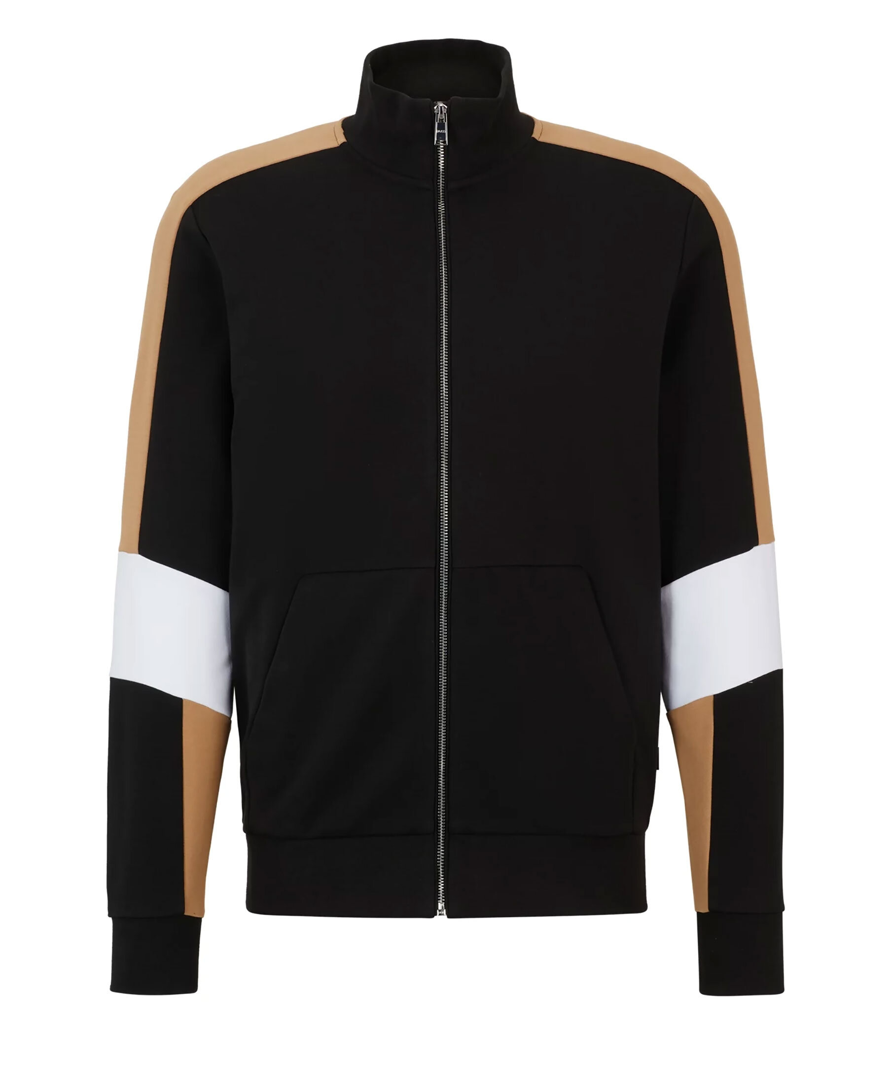 Svart tracksuit-tröja från BOSS Black. Beigea revärer på armarna, vita detaljer vid armbågarna. Stängs framtill med dragkedja. Ficka på magen. Tillverkad i bomullsblandning.