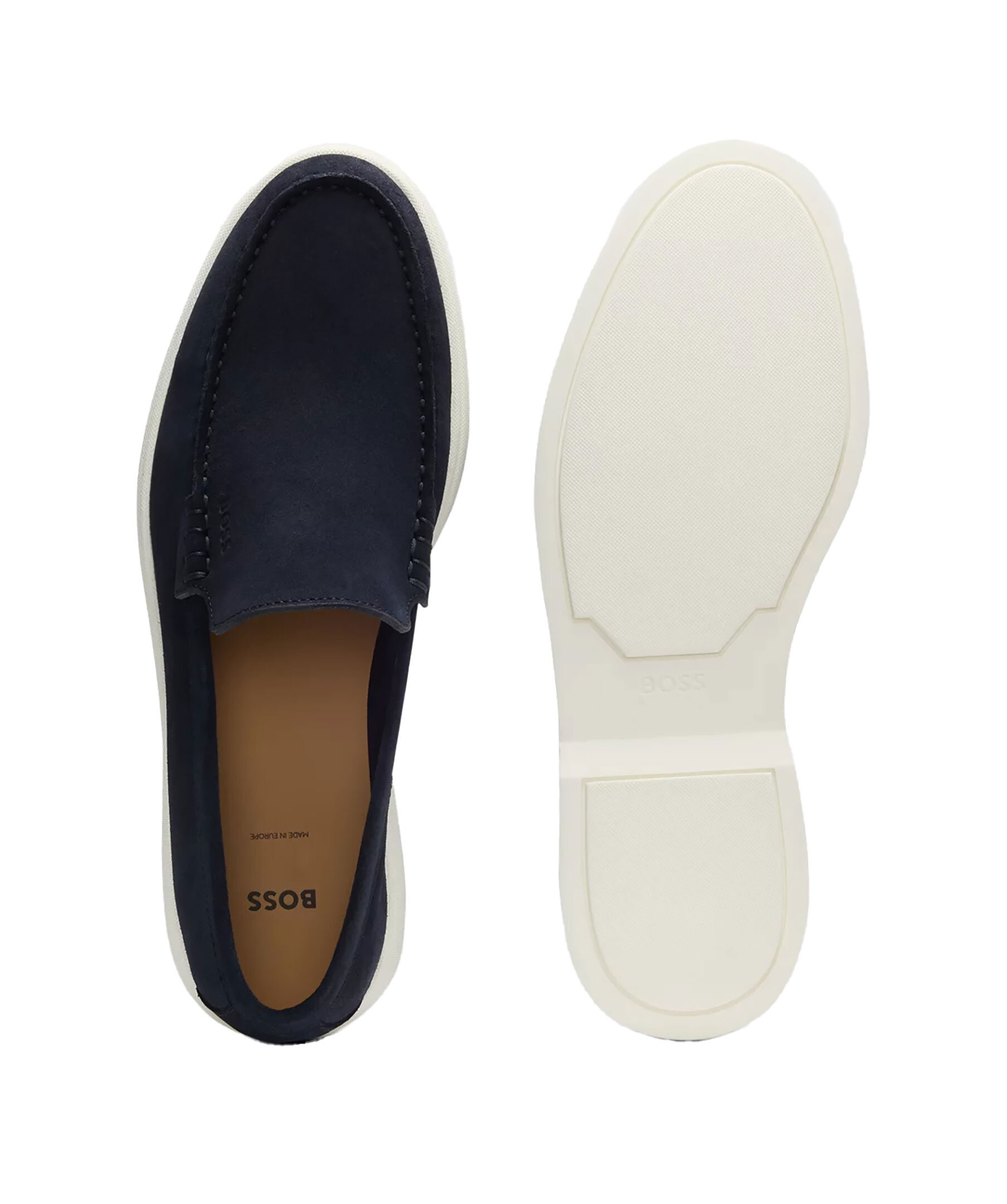 Mörkblå loafers från Boss Black. Skorna har en vit sula och en diskret logotyp. Tillverkad av läder.