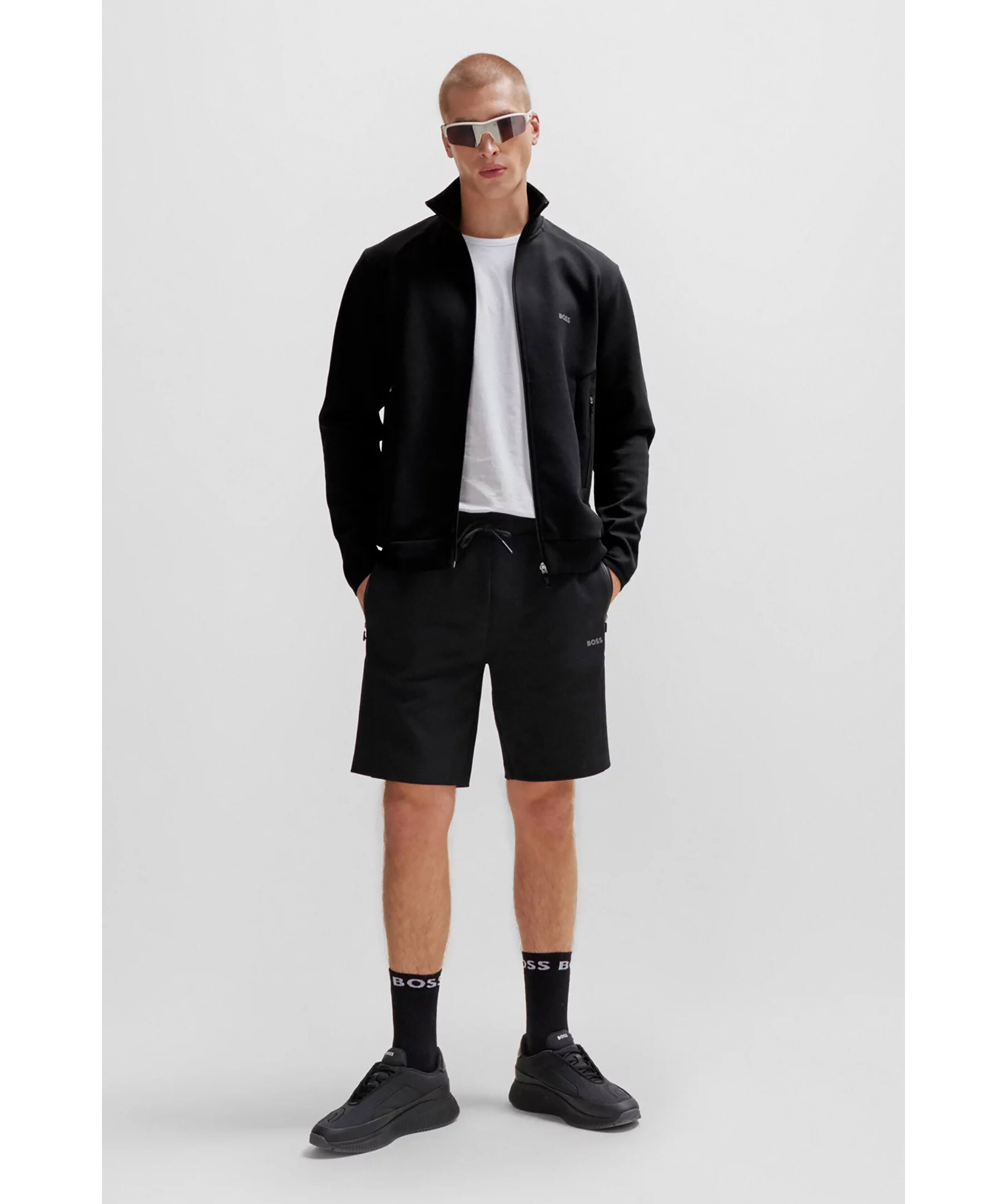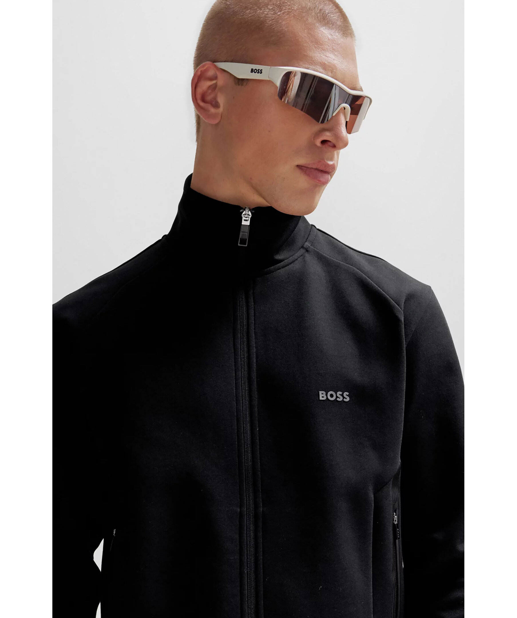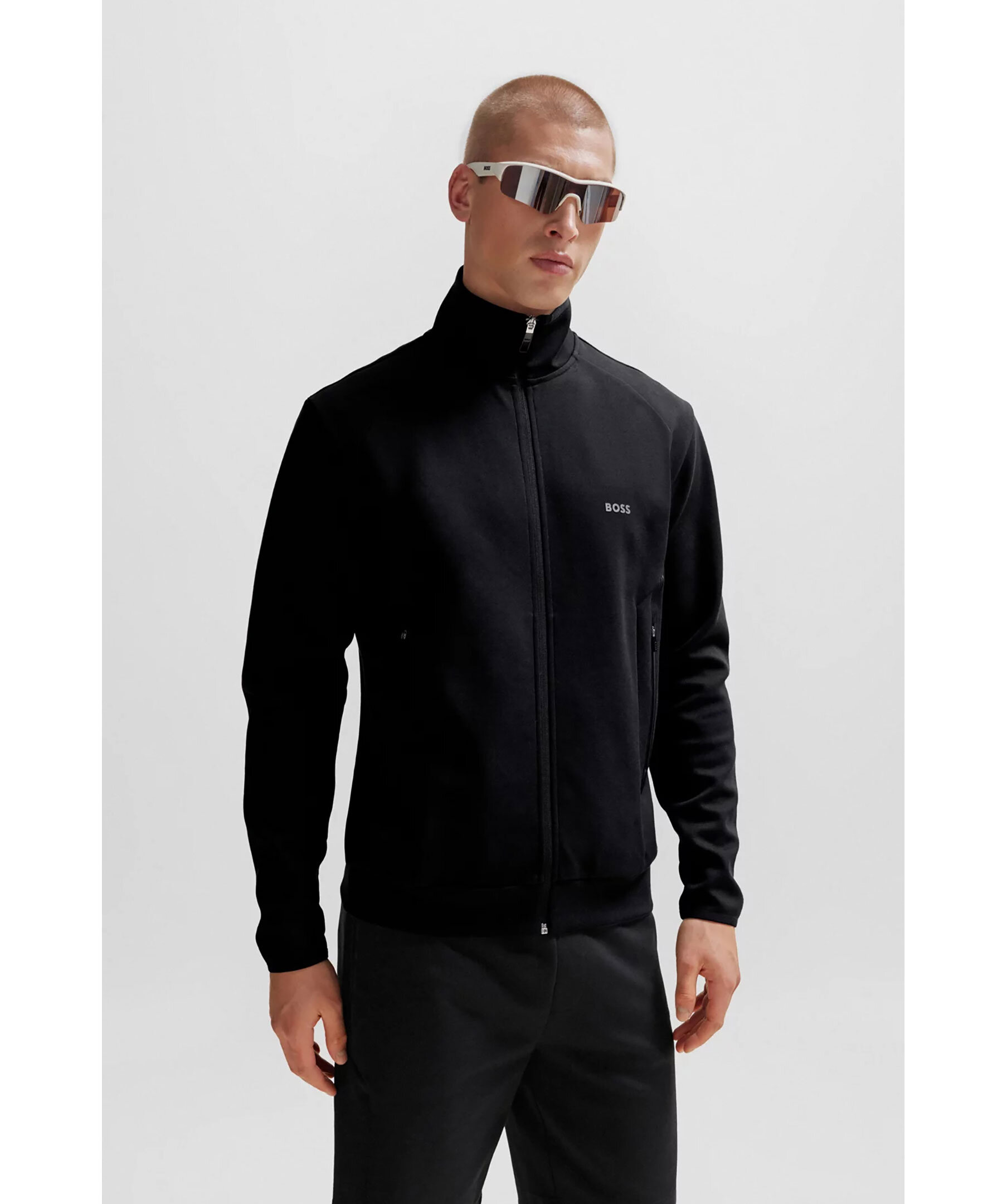 Svart zip-up tracksuitjacka från BOSS Green. Stängs med dragkedja framtill och har liten logotyp på bröstet. Tillverkad i en bomulls- och polyesterblandning. Två sidfickor med dragkedja och kontrastränder.