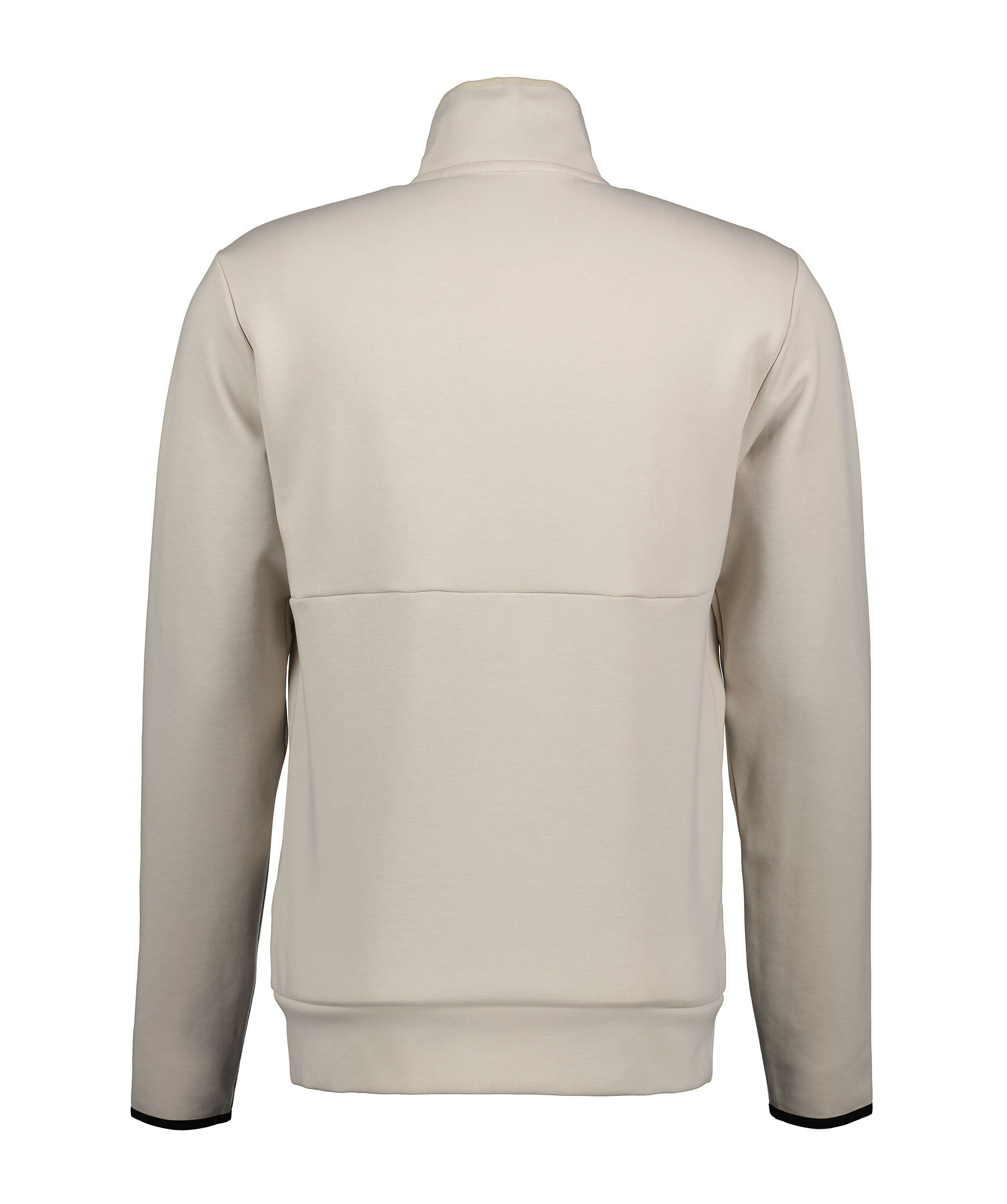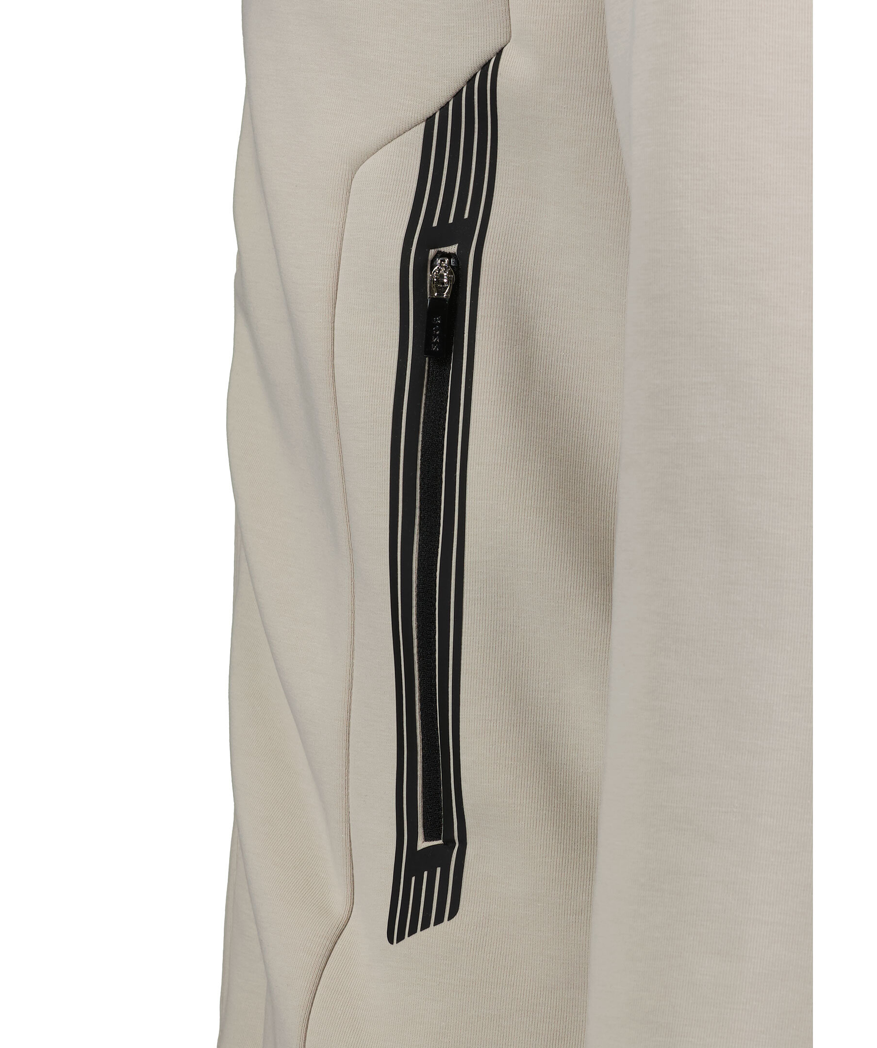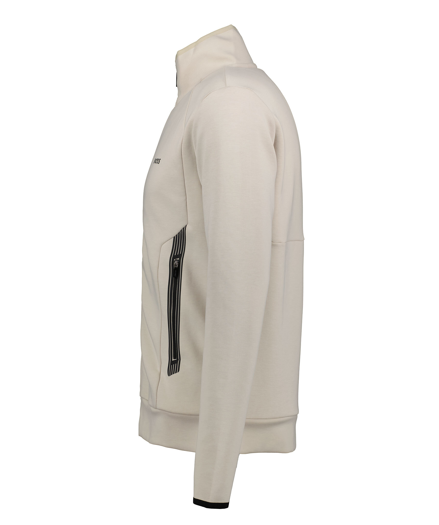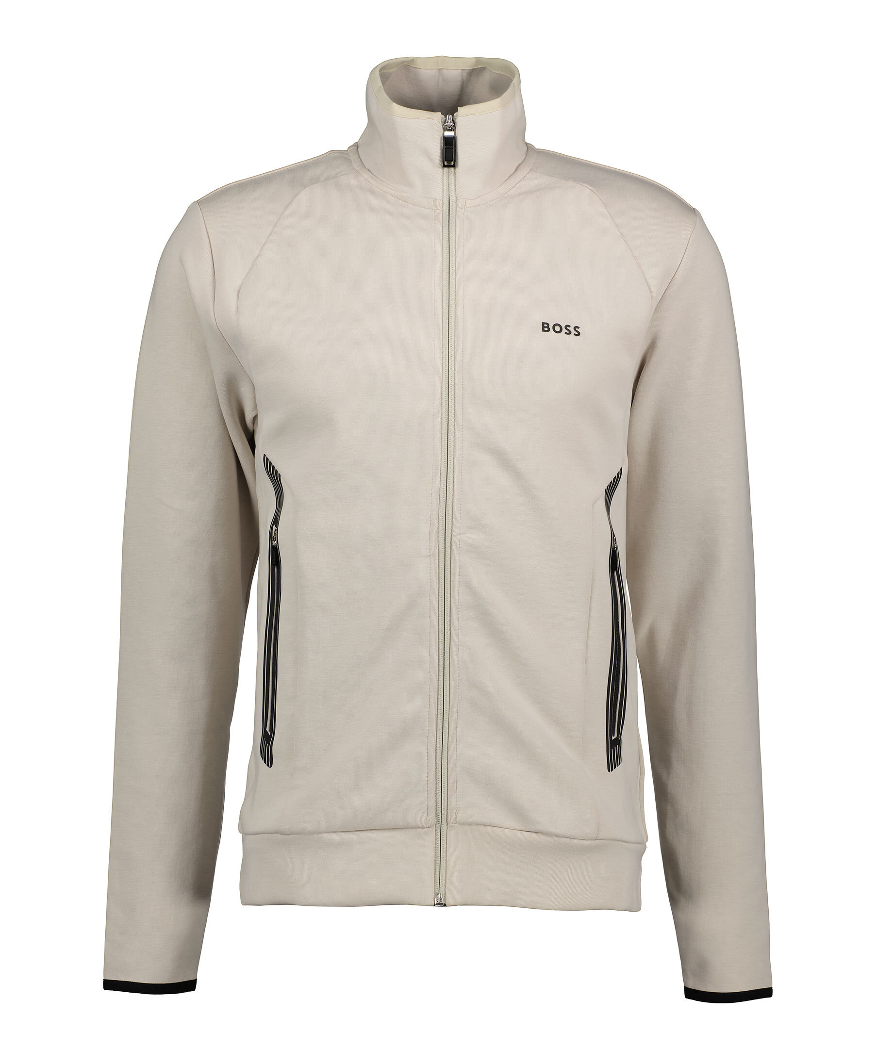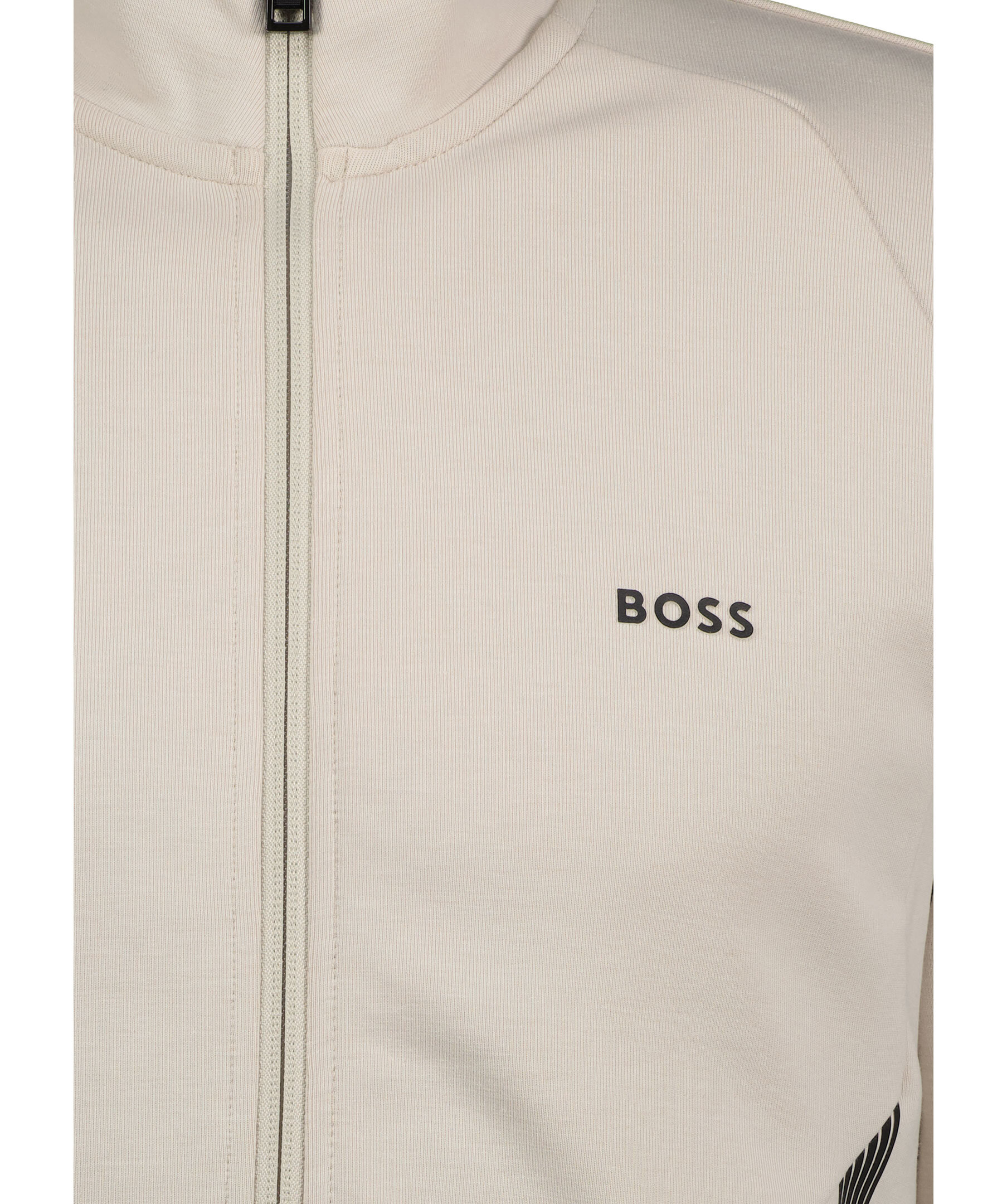 Beige zip-up tracksuitjacka från BOSS Green. Stängs med dragkedja framtill och har liten logotyp på bröstet. Tillverkad i en bomulls- och polyesterblandning. Två sidfickor med dragkedja och kontrastränder.