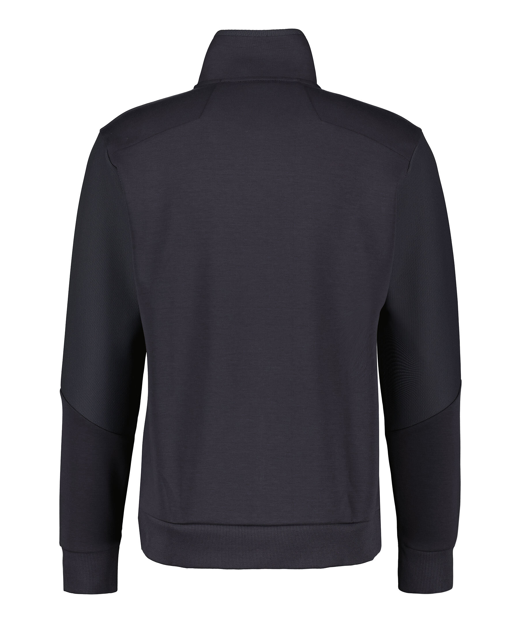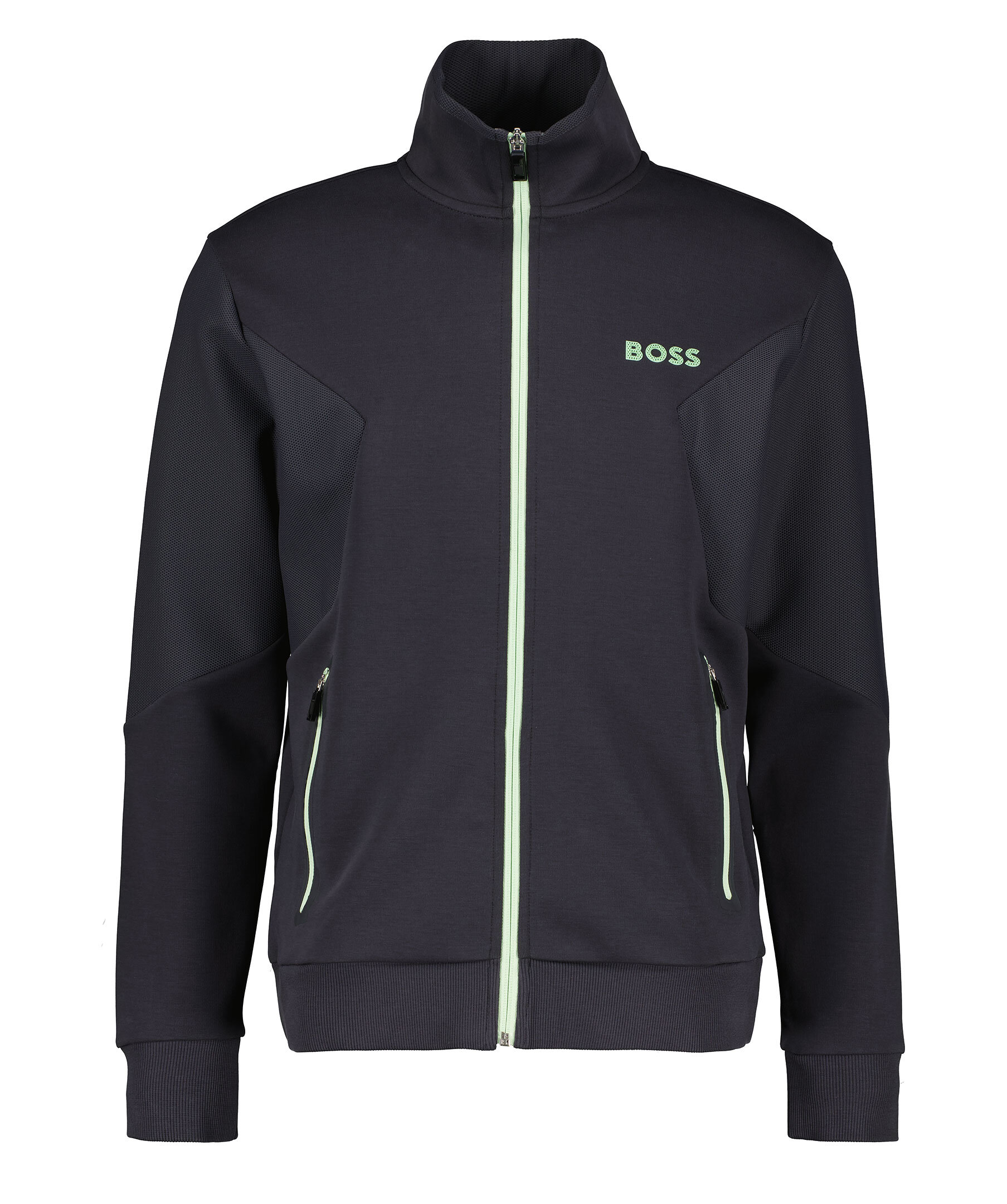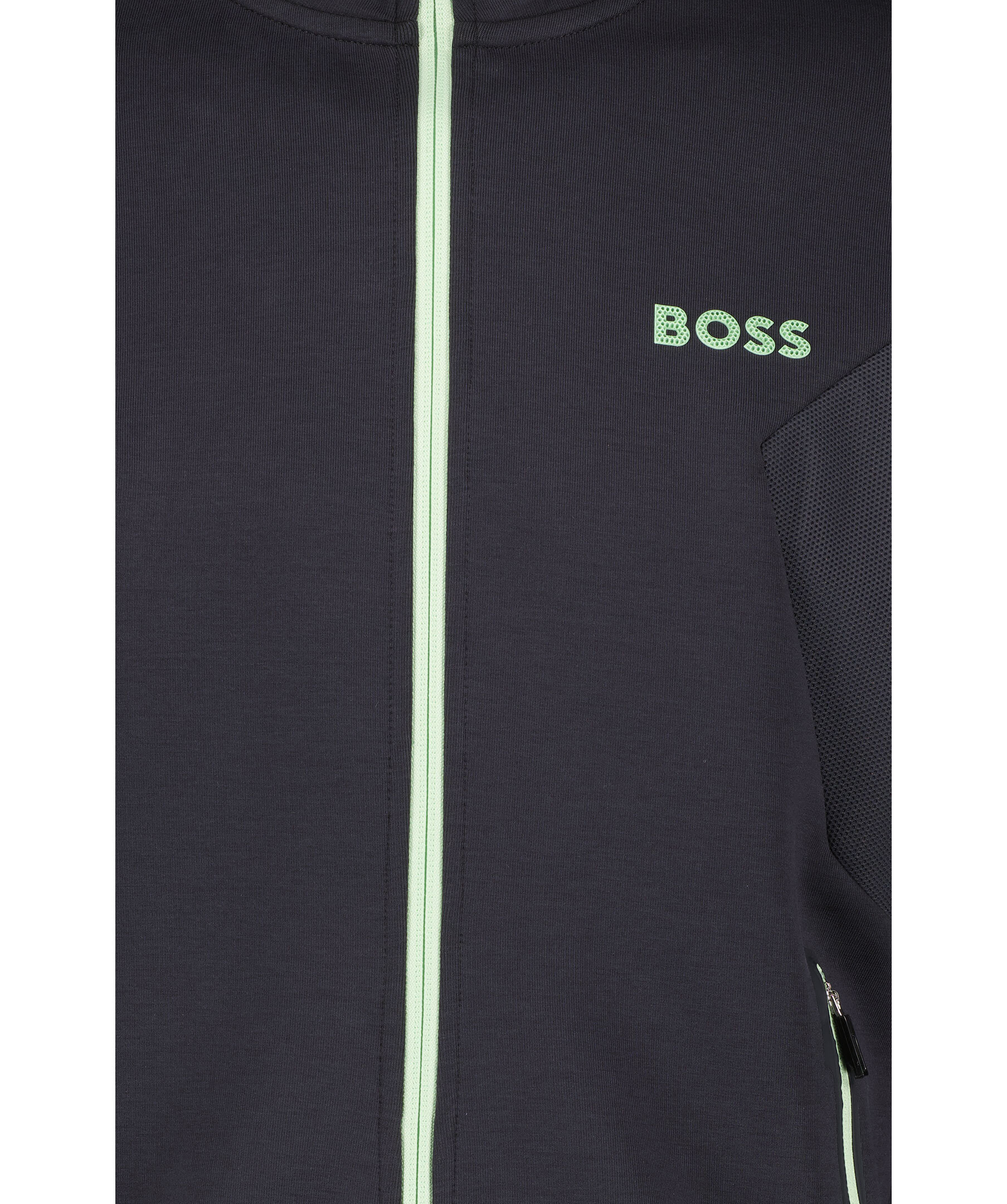 Mörkgrå tracksuit jacka med mintgröna detaljer från BOSS Green. Stängs framtill med dragkedja. Två fickor framtill som stängs med dragkedja. Detaljer i mesh på tröjans ärmar och i sidan. Ribbstickade muddar vid ärm- och plaggslut. Gummerad logotyp vid bröstet. Tillverkad i bommullsblandning.