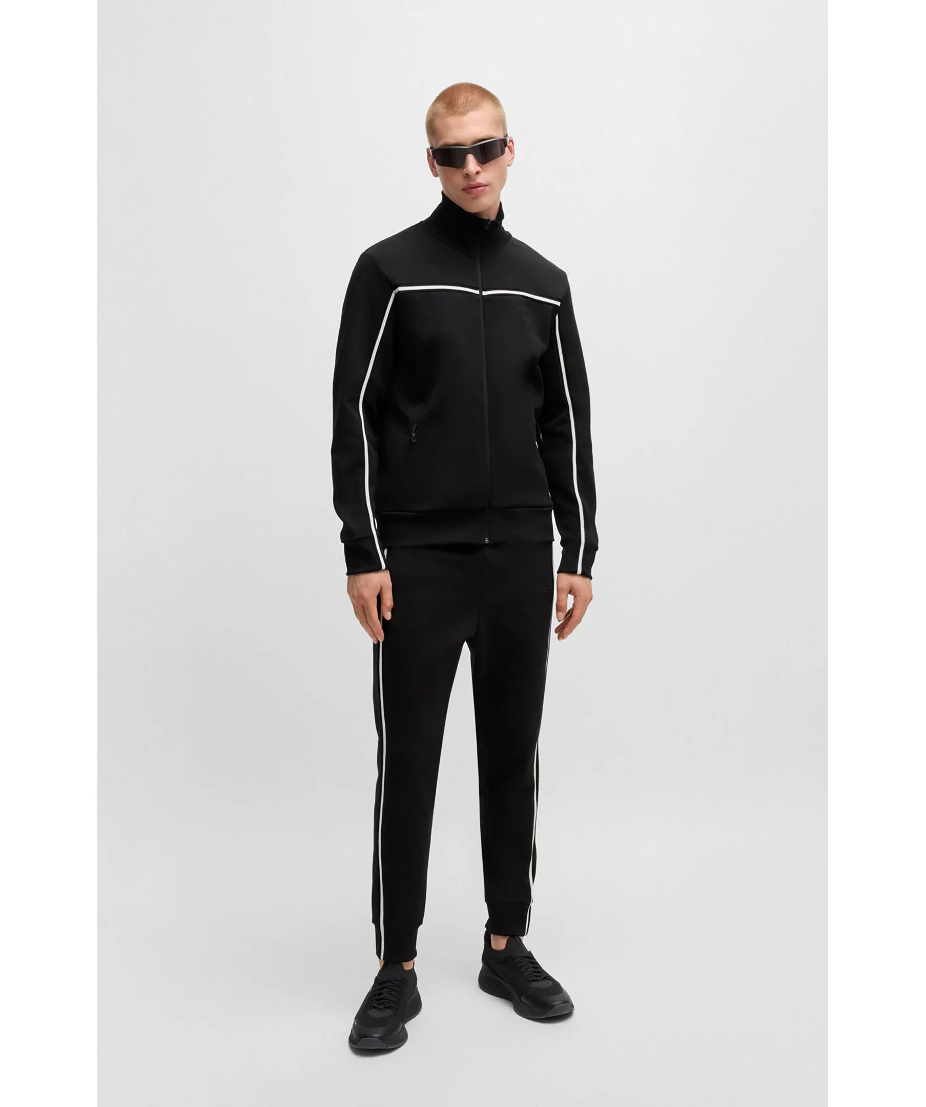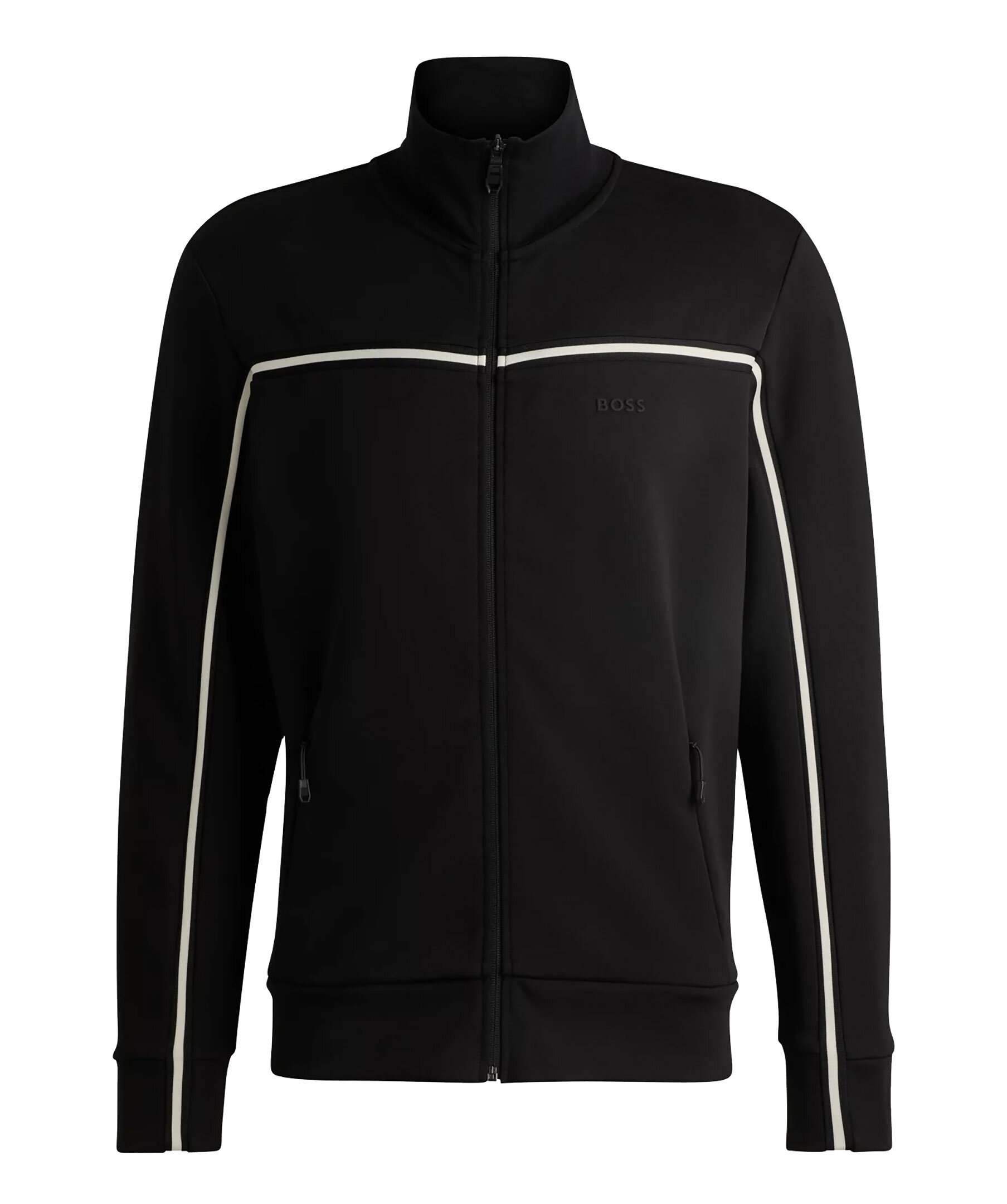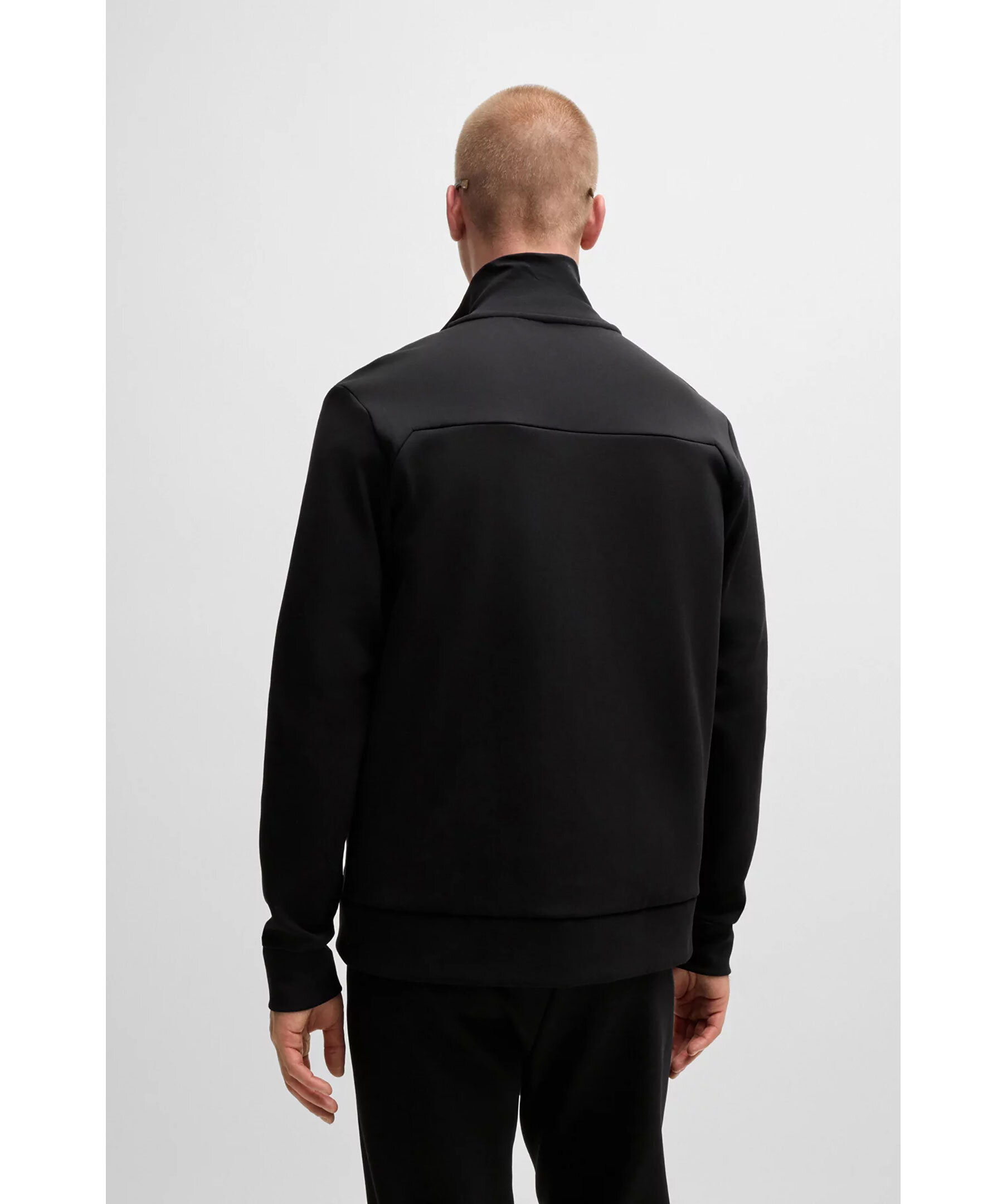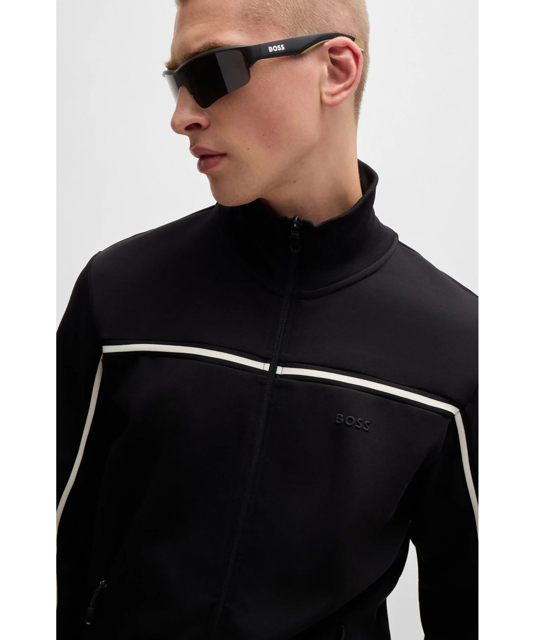 Svart zip-up sweatshirt från BOSS Green. Tröjan stängs med dragkedja framtill och har ribbstickad hög krage samt ribbstickade muddar vid ärm- och plaggslut. Kontrastränder över bröstet samt ärmarna och en liten logotyp. Tröjan har även två sidfickor med dragkedja. Tillverkad i en bomullsblandning.