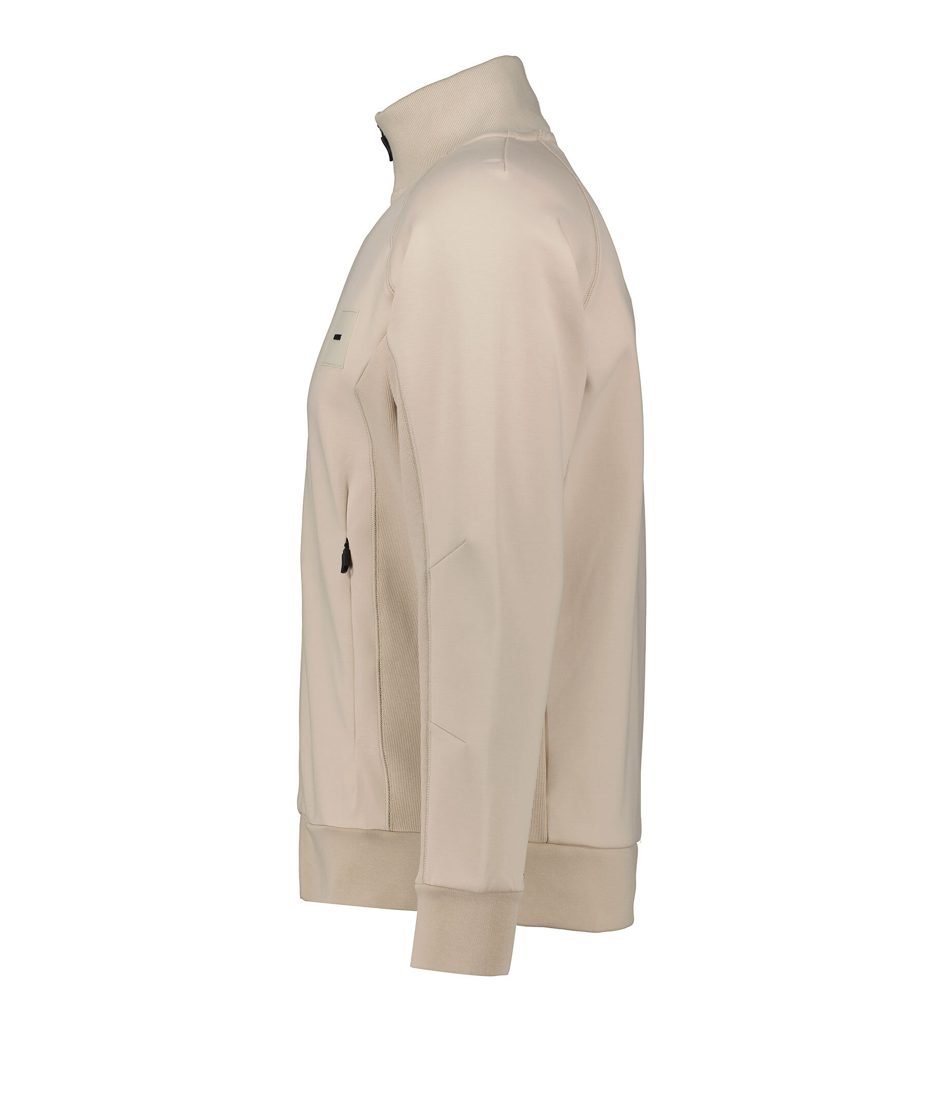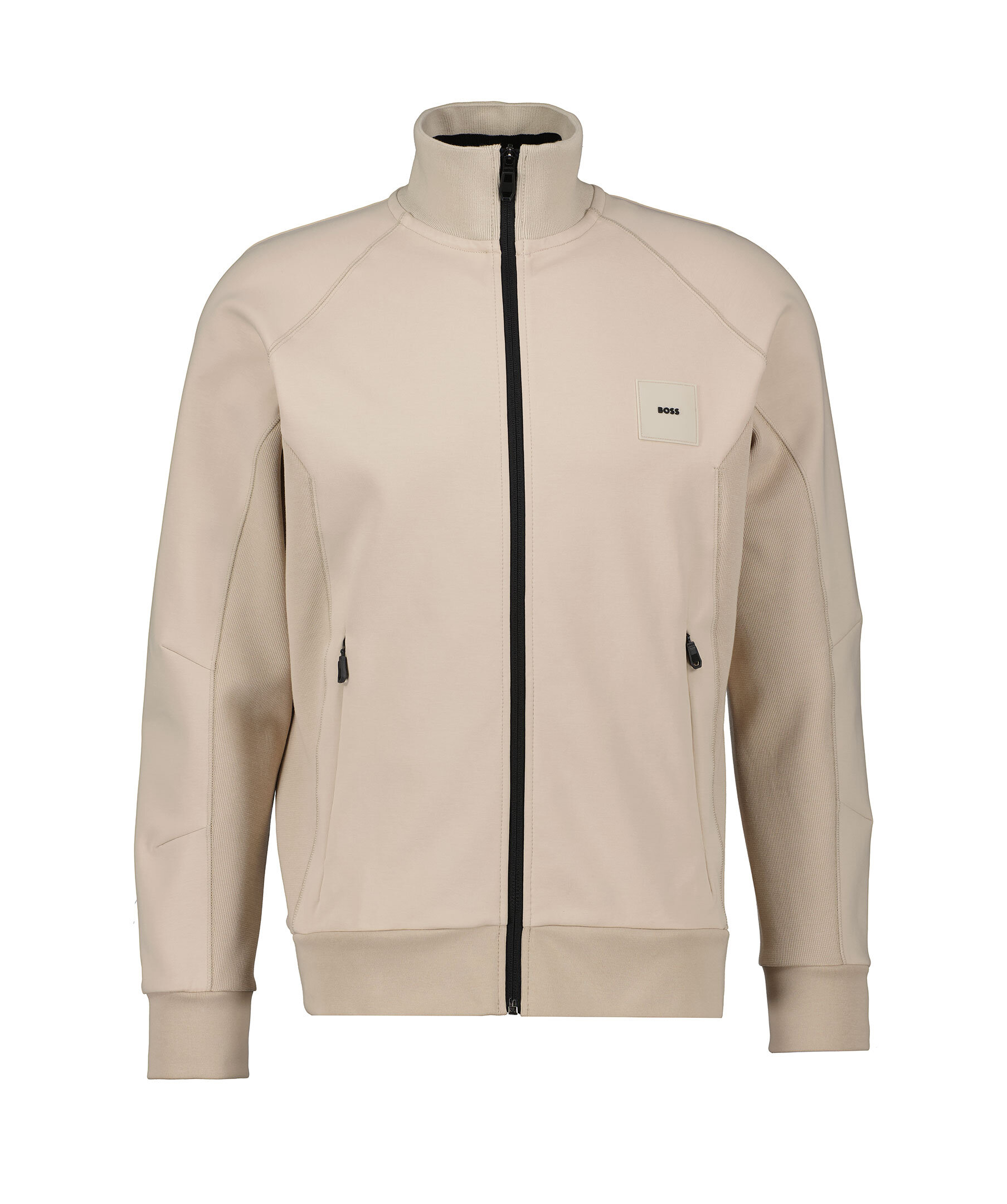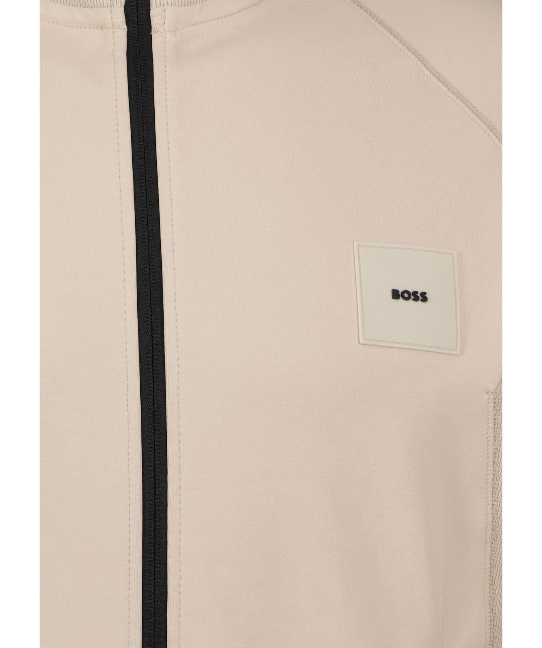 Beige zip-up sweatshirt från BOSS Green. Tröjan stängs med hel dragkedja och har ribbstickad ståkrage, gummilogotyp på bröstet och två sidfickor med dragkedja. Tillverkad av en bomullsblandning.