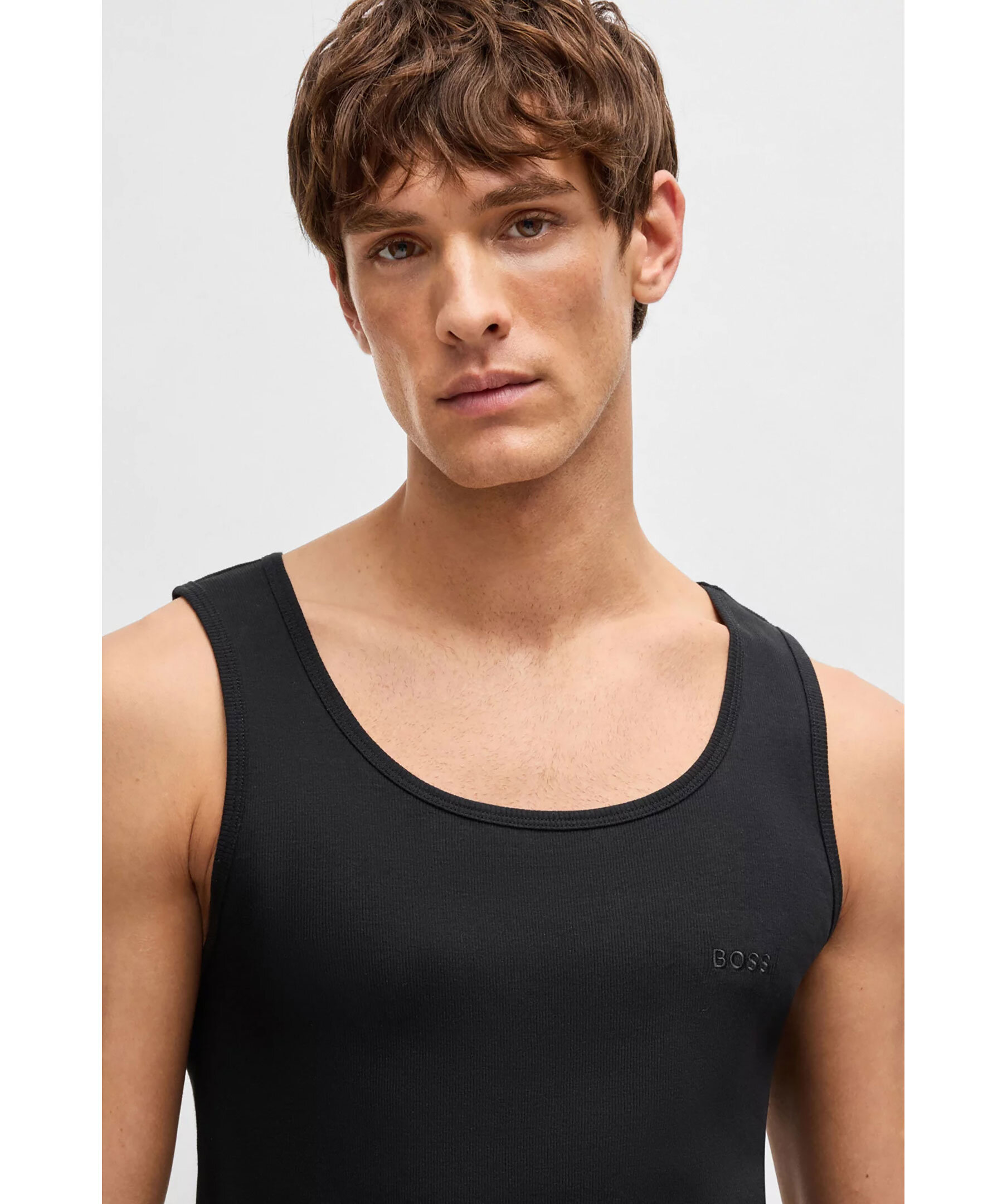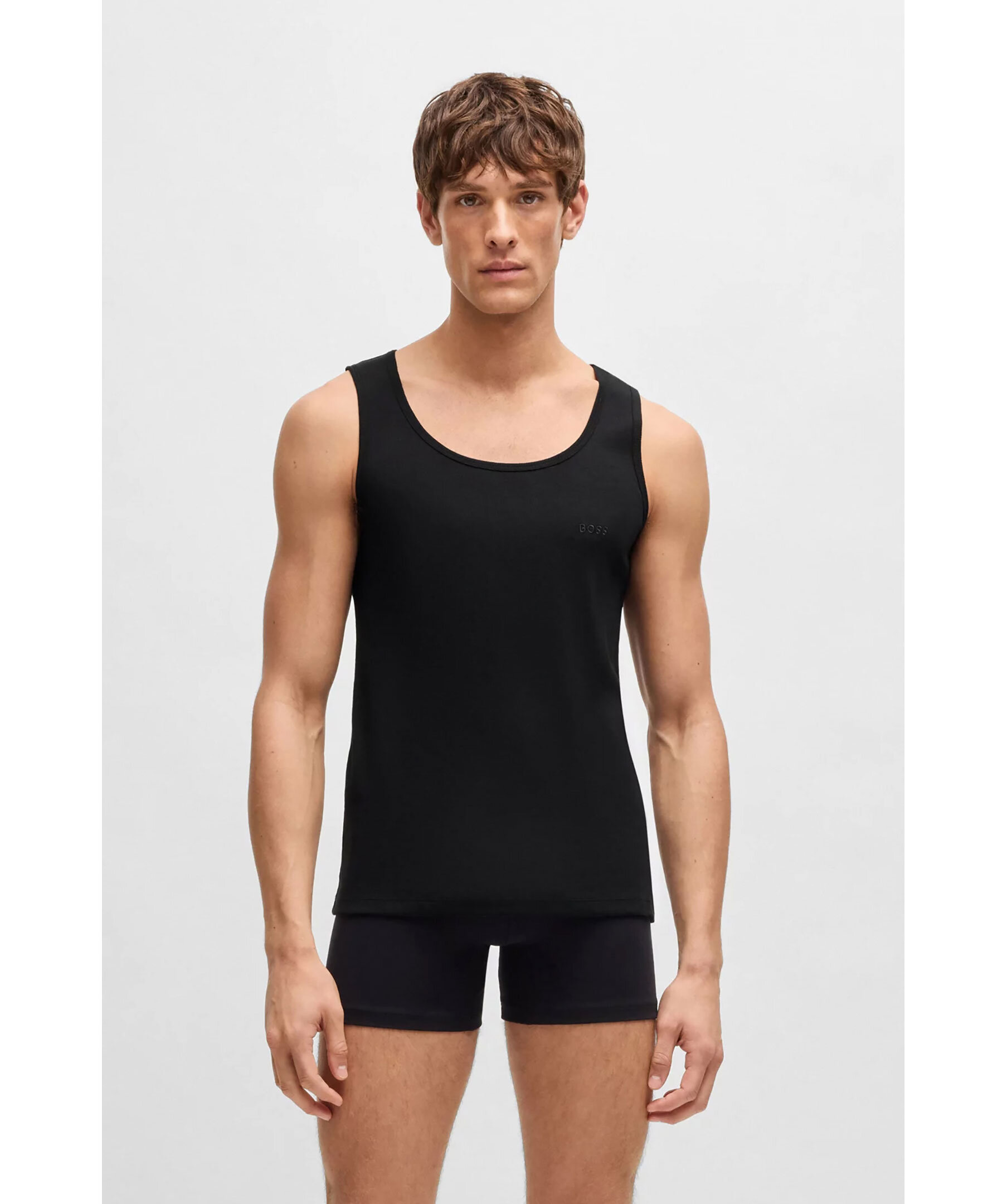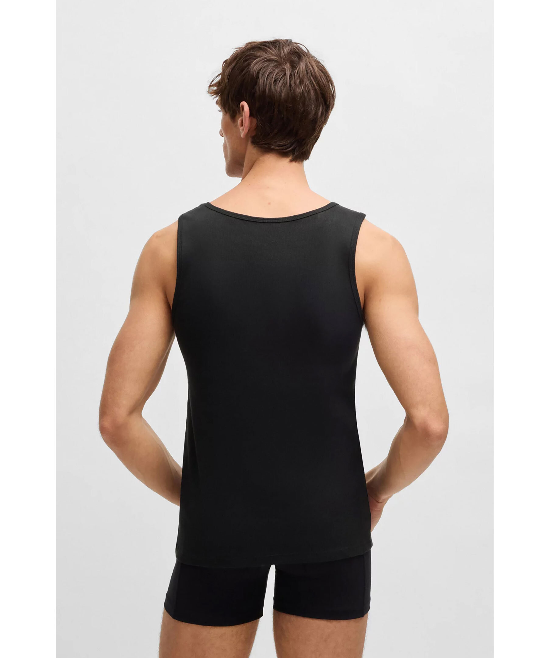 3-pack svarta ribbstickade linnen från BOSS Black. Logotyp på bröstet. Tillverkade i 100% bomull.
