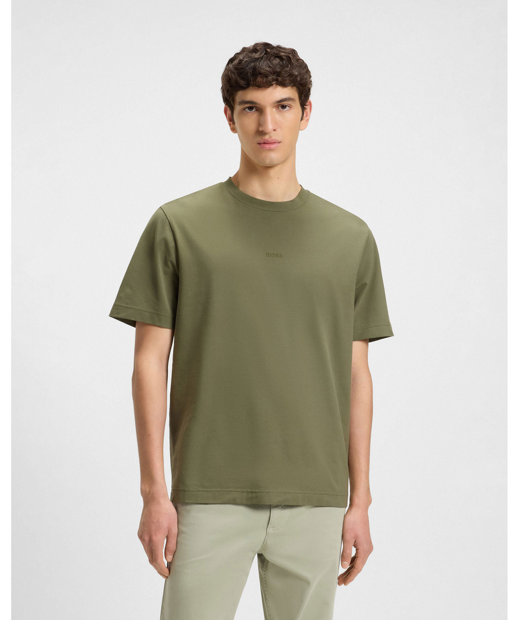 Mörkgrön t-shirt från BOSS Orange. T-shirten har korta ärmar, rund halsringning samt en gummerad logotyp mitt på bröstet. Tillverkad i en stretchig bomullsblandning.