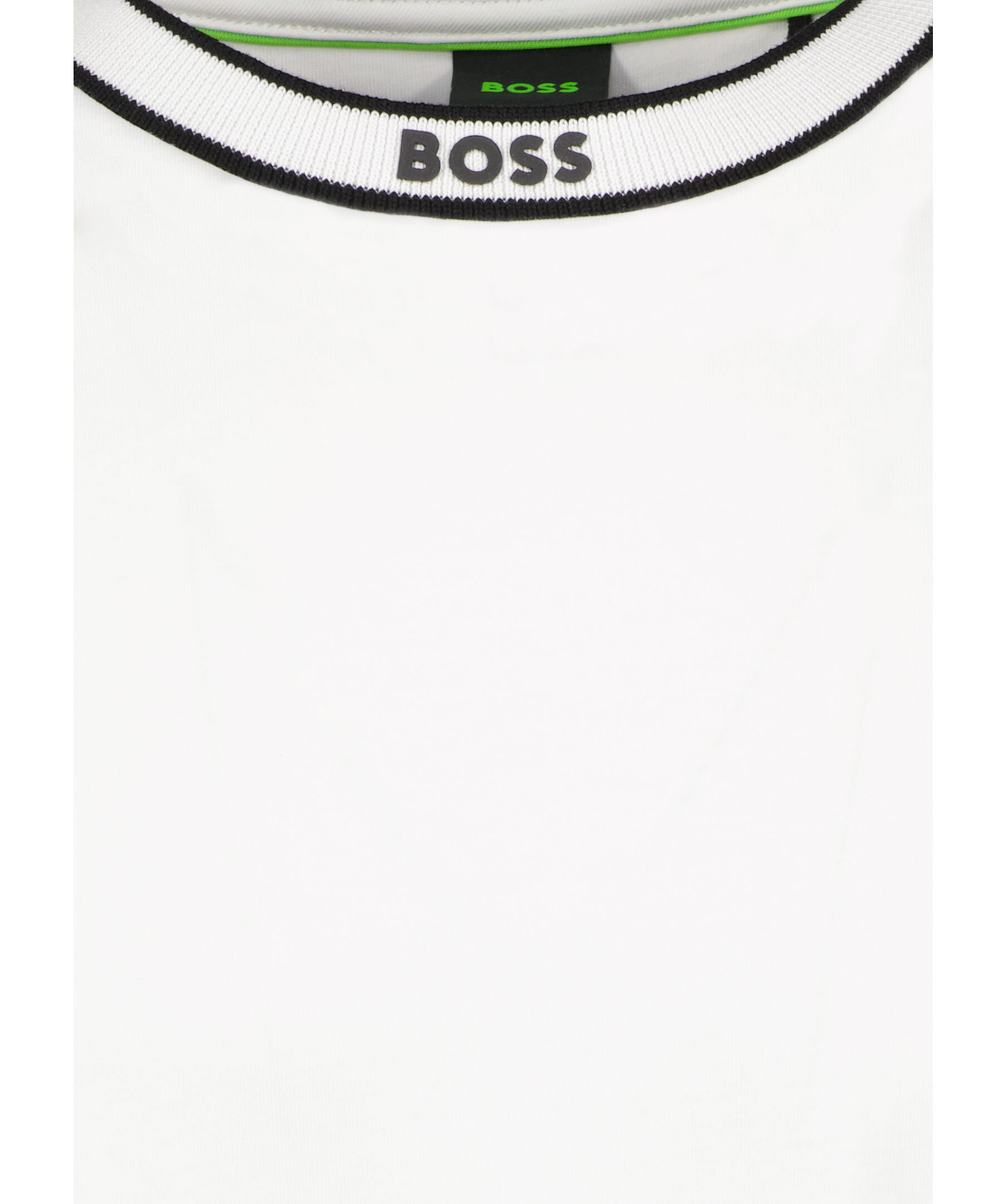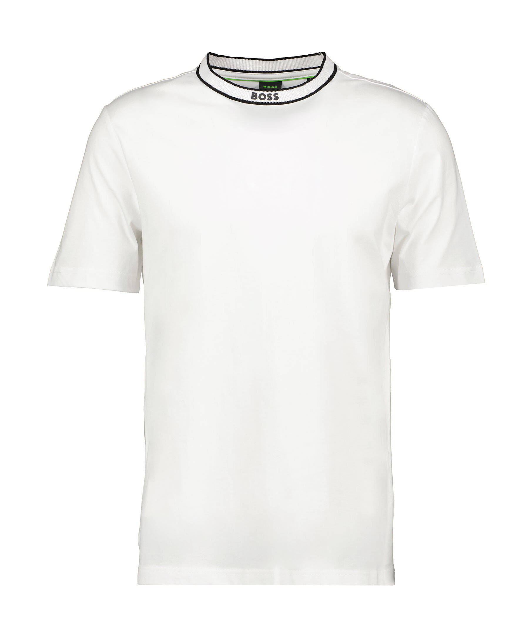 Vit kortärmad t-shirt från BOSS Green. T-shirten har en ribbstickad krage med kontrastränder samt logotyp. Tillverkad i bomull.