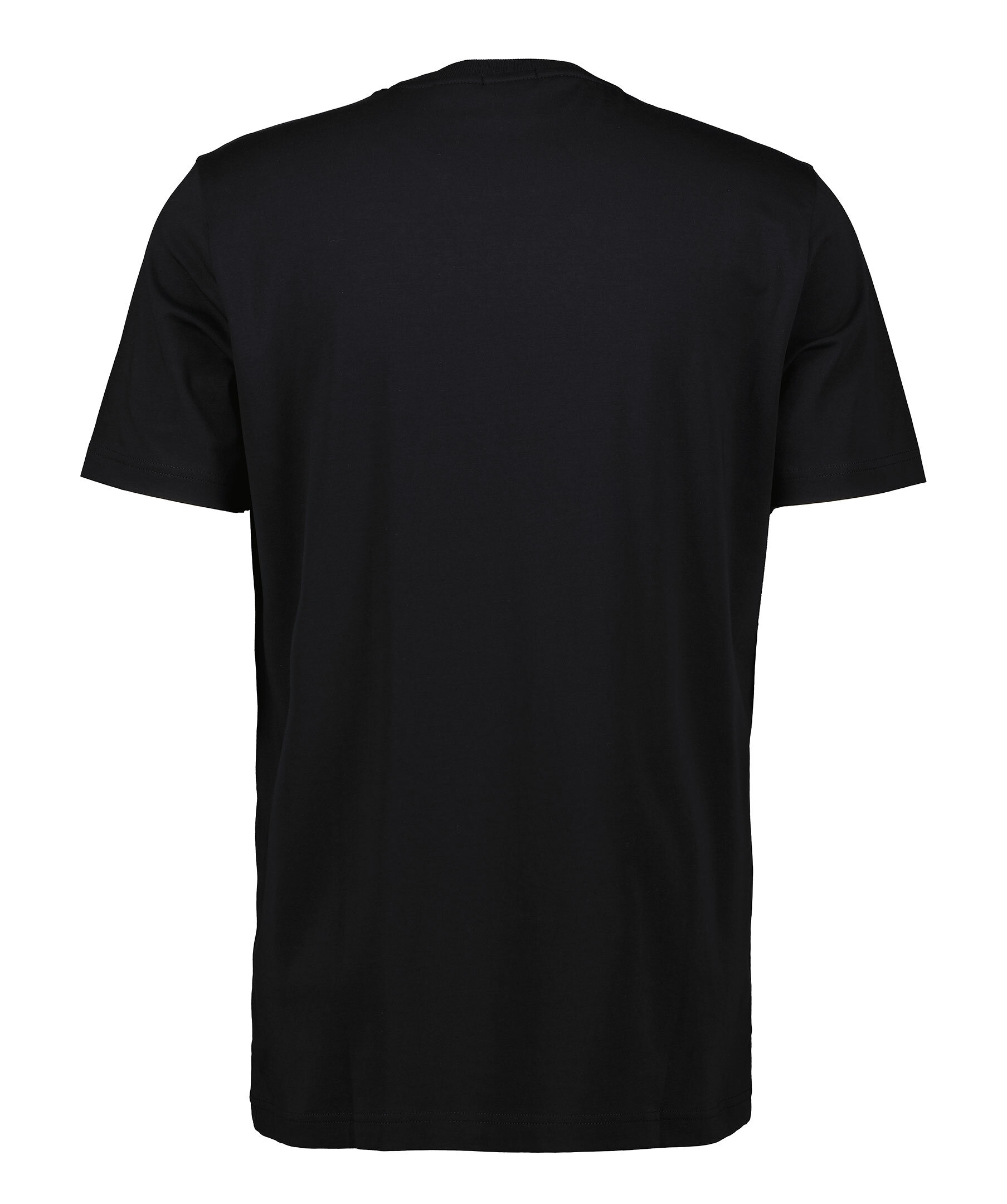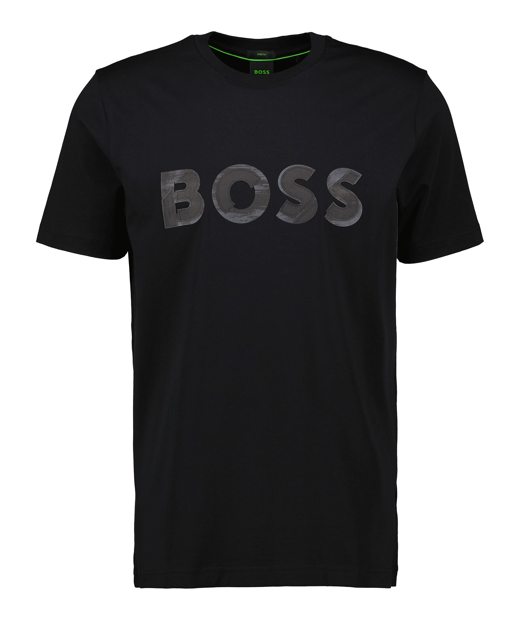Svart T-shirt från BOSS Green. Svart tryck över bröstet och magen. Rundad halsringning med ribbstickad kant. Gummerad logotyp på vänster bröst och vänster ärm. Tillverkad i 100% bomull.