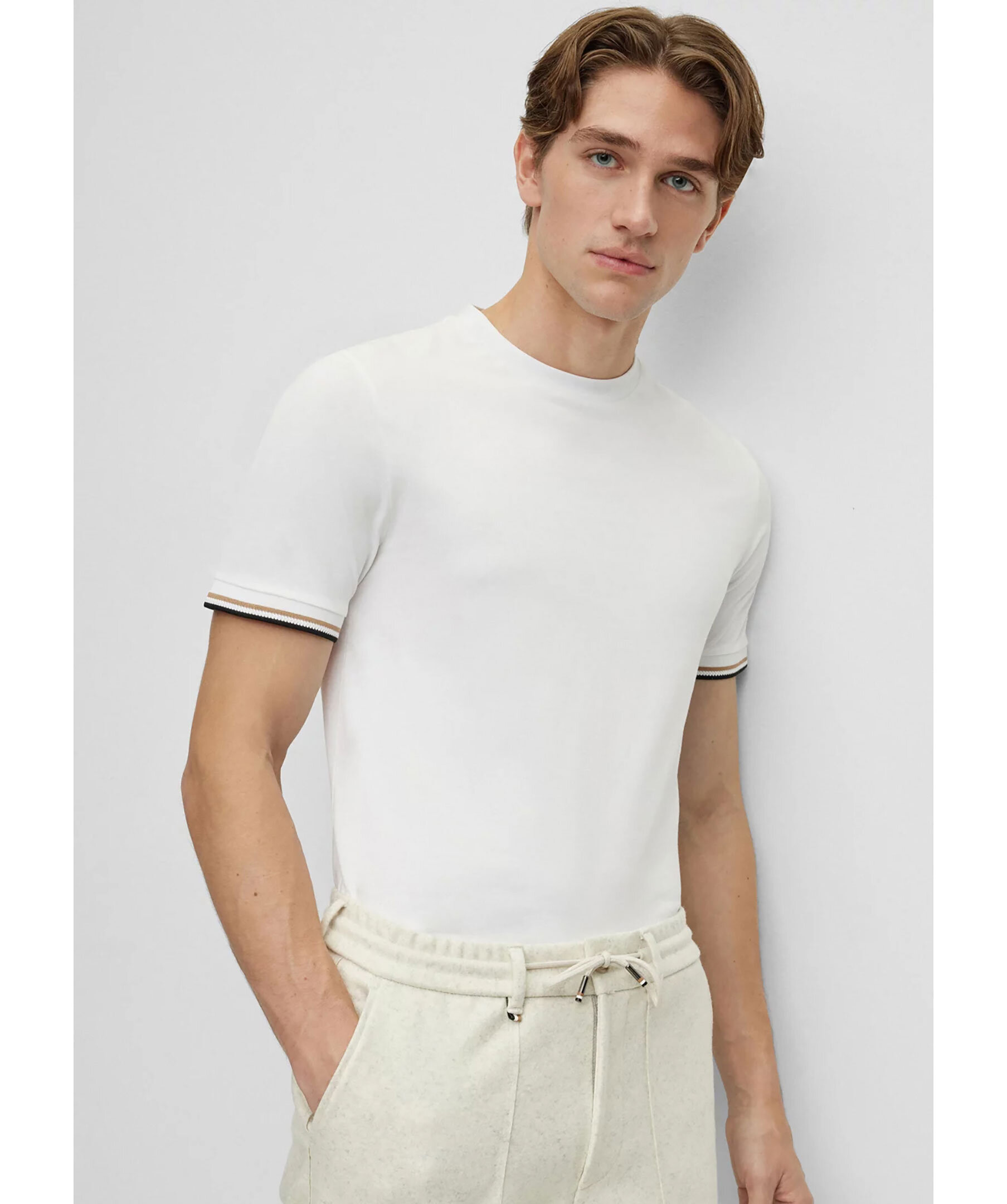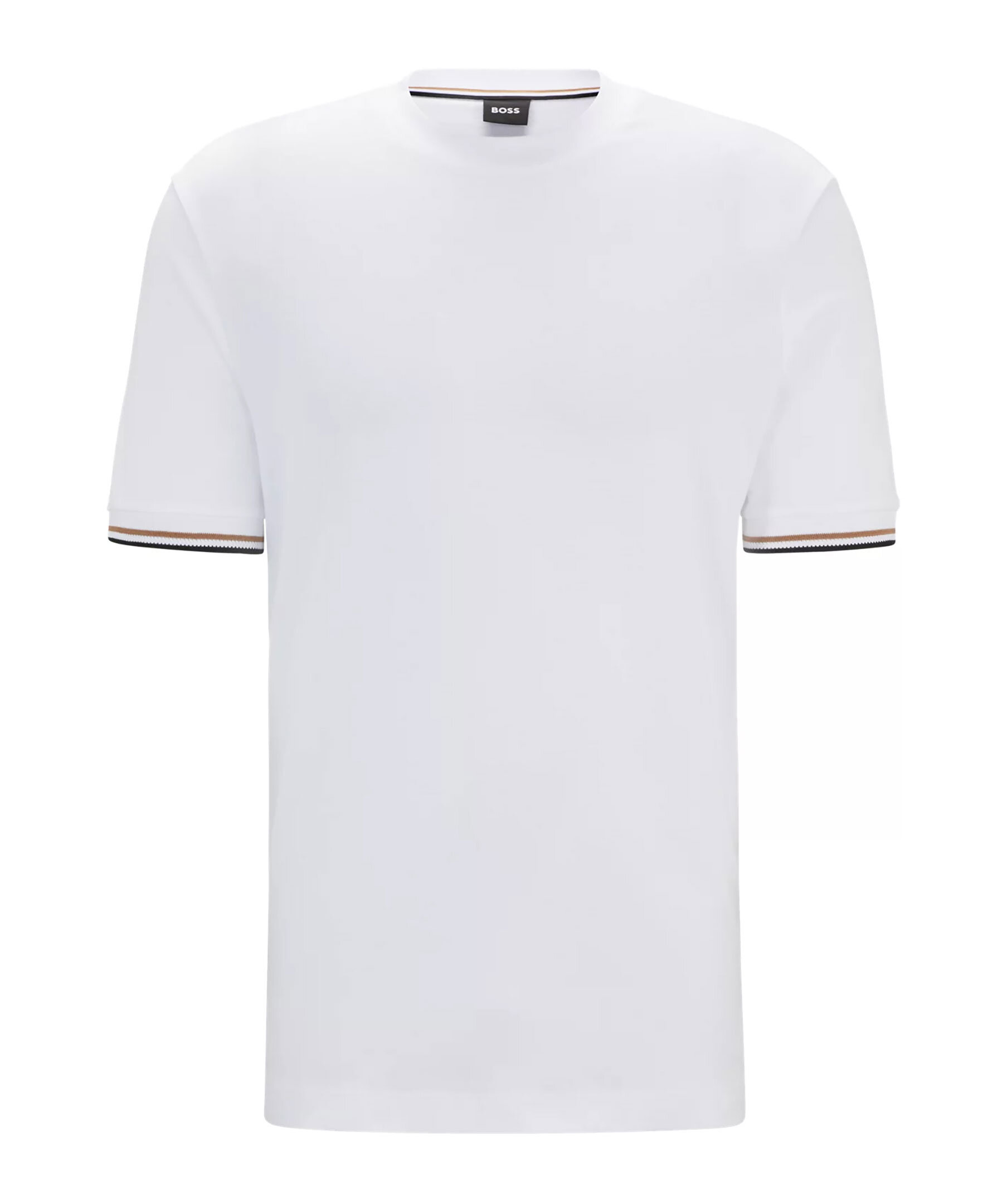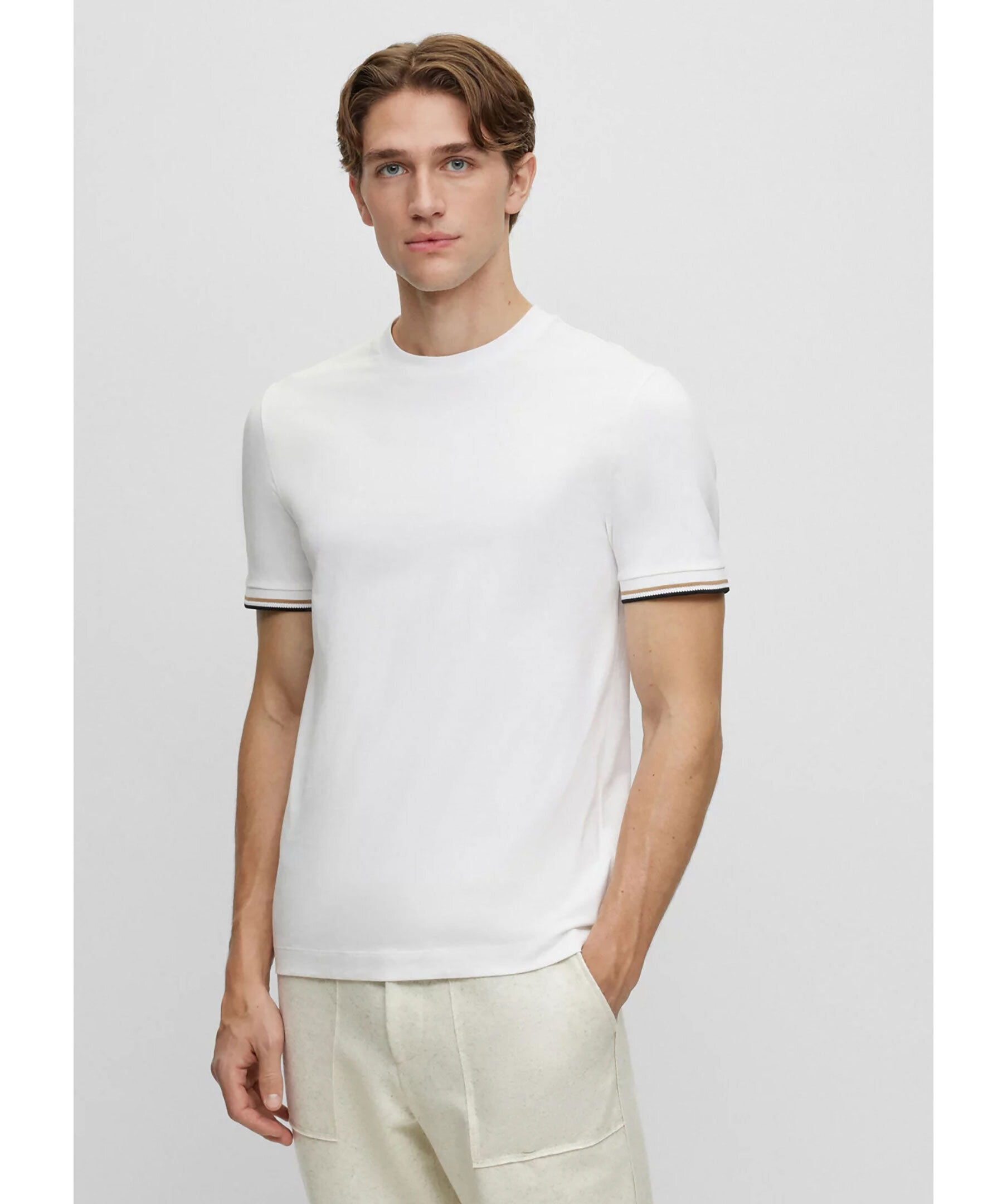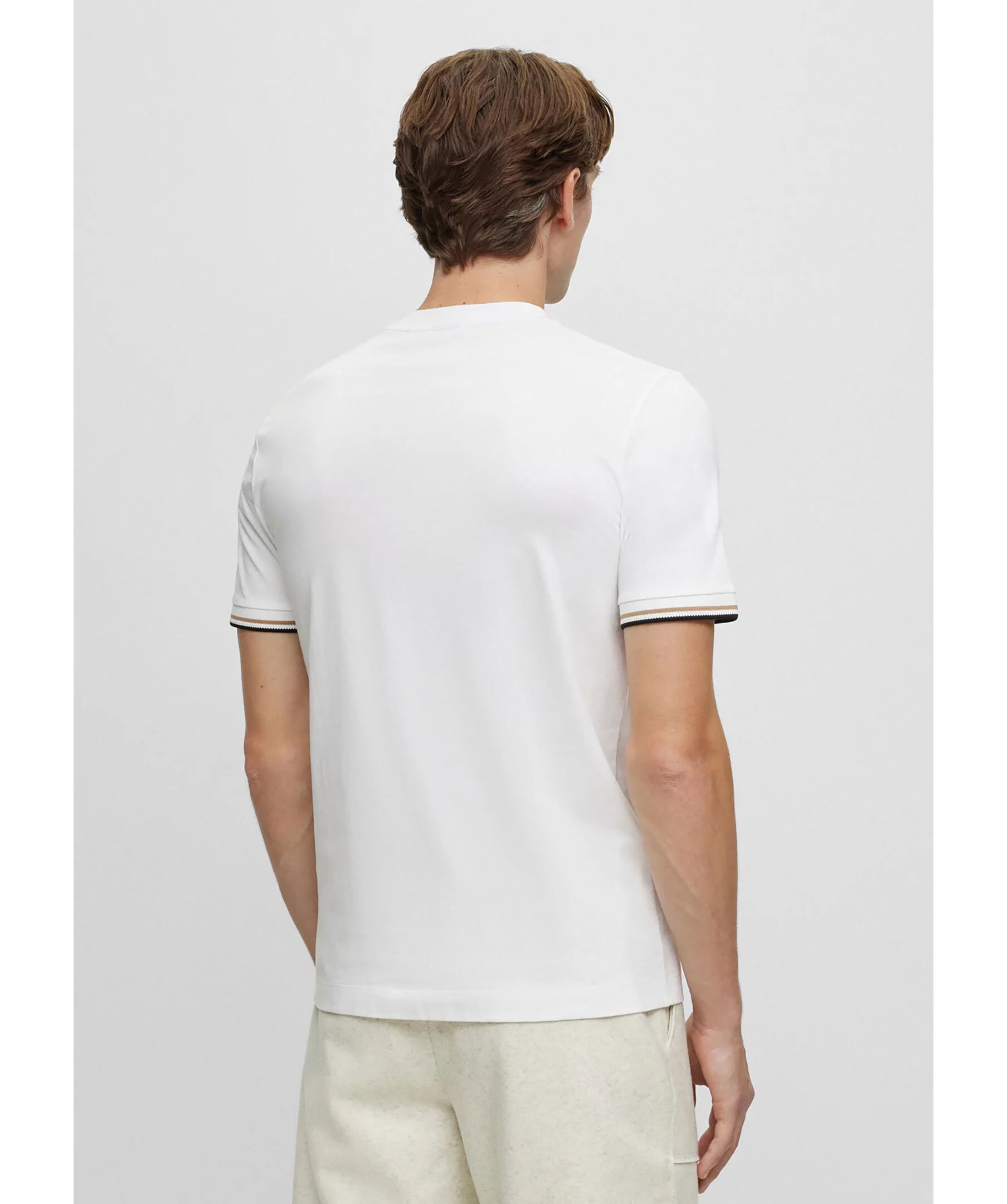 Vit T-shirt i regular fit från BOSS Black. Tillverkad av single jersey och med deras signaturfärger i ärmsluten. T-shirten har rundad hals.