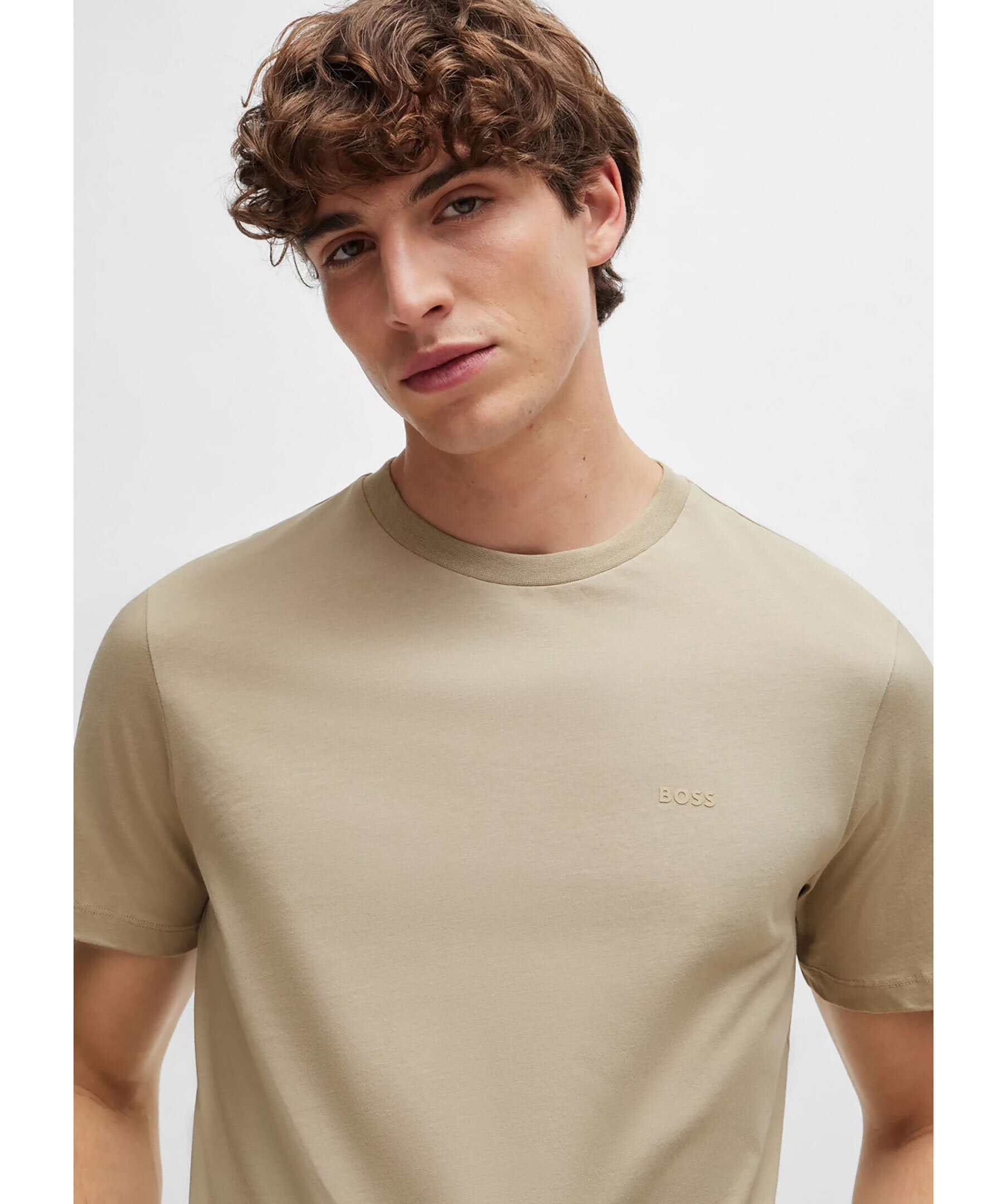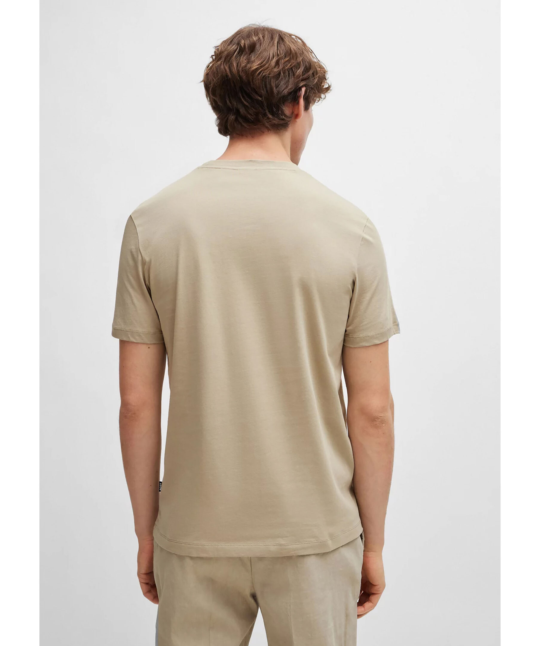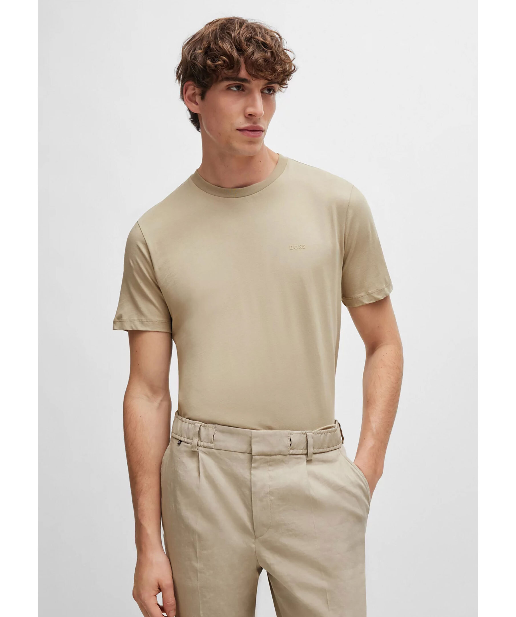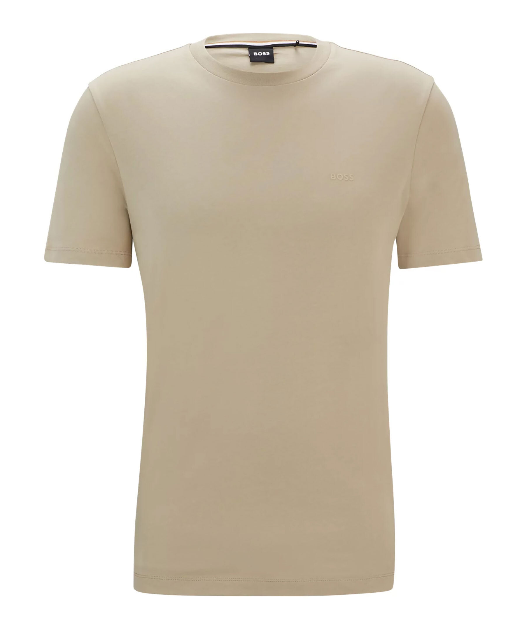 Beige t-shirt från BOSS Black. Tillverkad i bomull. Rund hals och gummerad logotyp på vänster bröst. Normal passform.